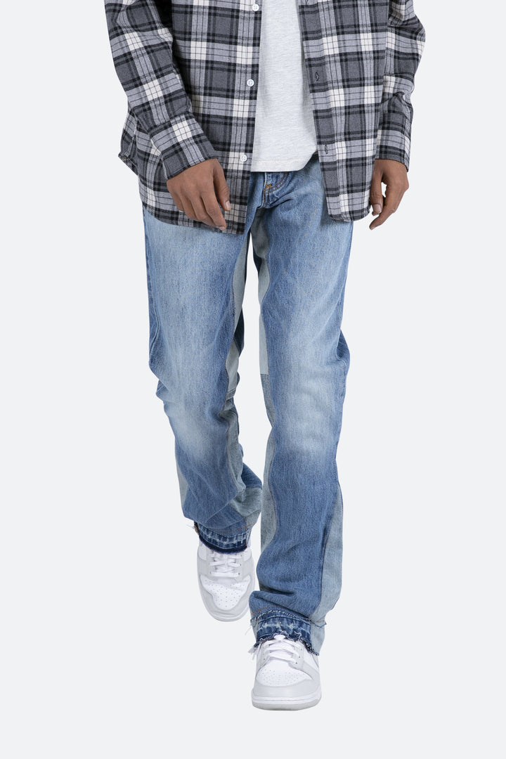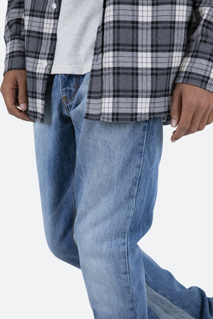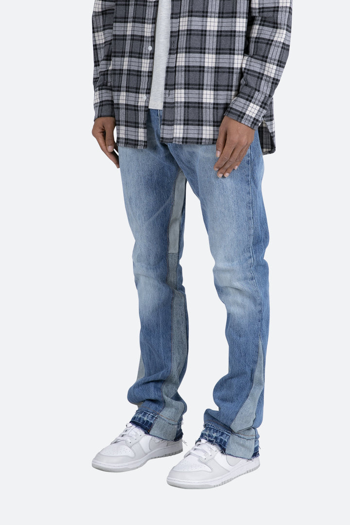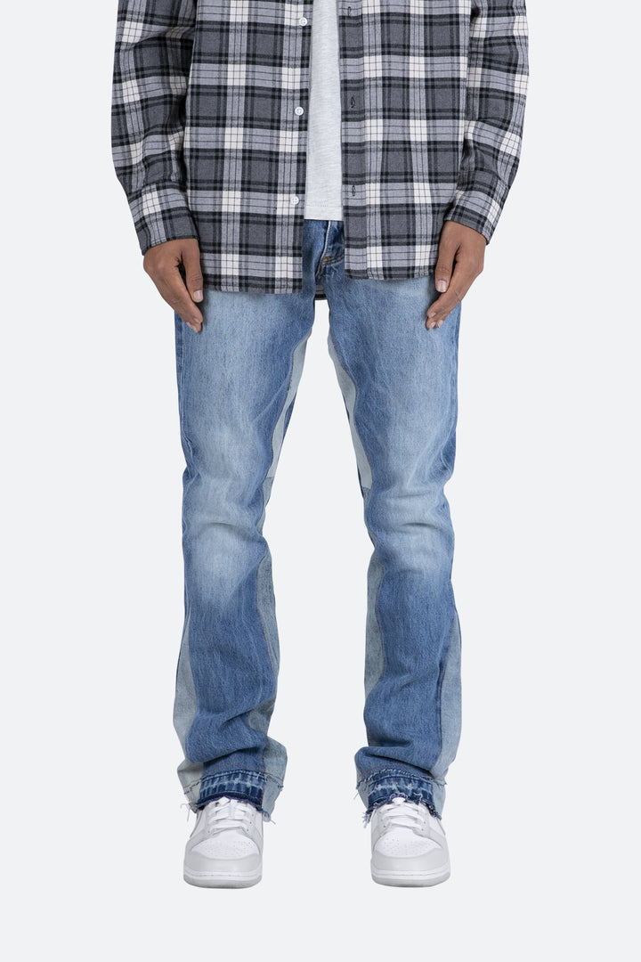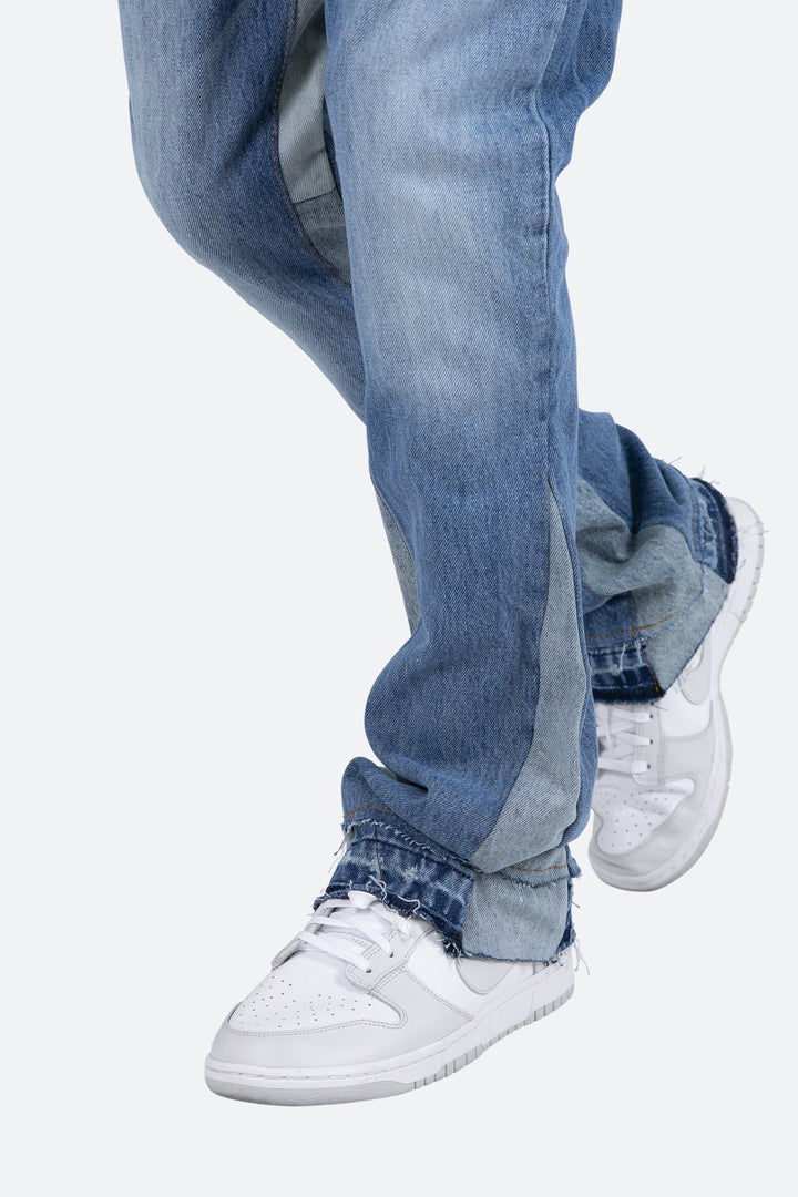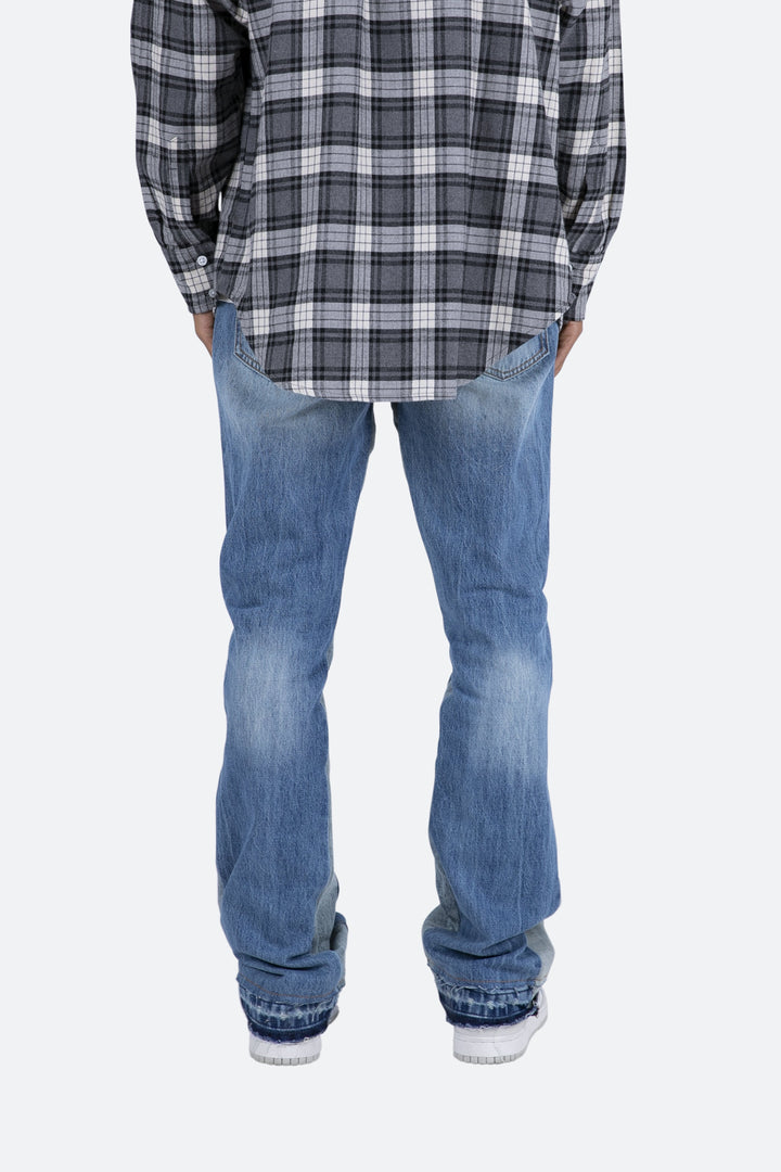 the B119 Flare Denim are designed with our new B fit, which is slim through the thigh and features a slight flare at the leg opening and is constructed from washed blue denim, panelling at the inseam and outseam from contrasting denim for a slight flare and finished with a deconstructed hem.