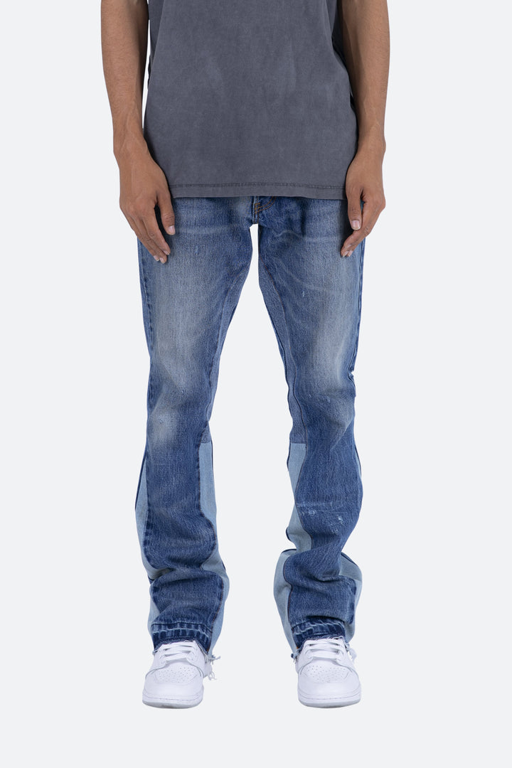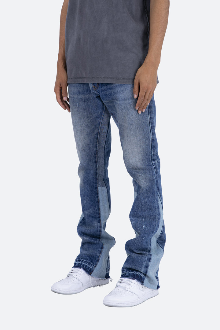 the B133 Flare Denim are designed with our new B fit, which is slim through the thigh and features a slight flare at the leg opening and is constructed from medium washed blue denim, panelling at the inseam and outseam from contrasting denim for a slight flare and finished with a deconstructed hem.