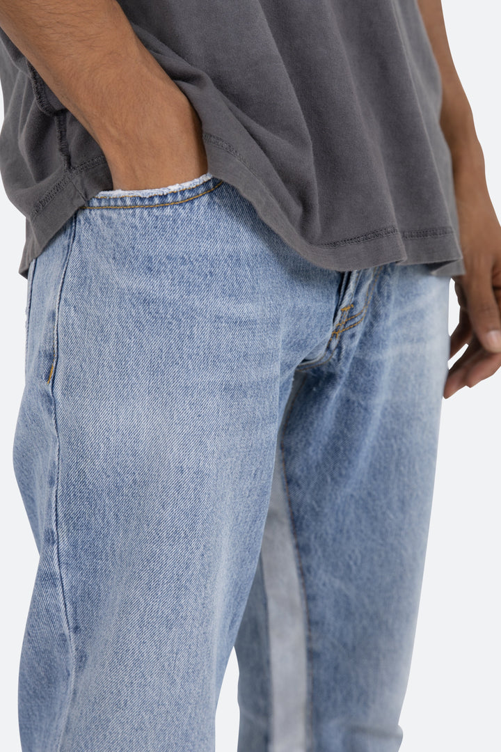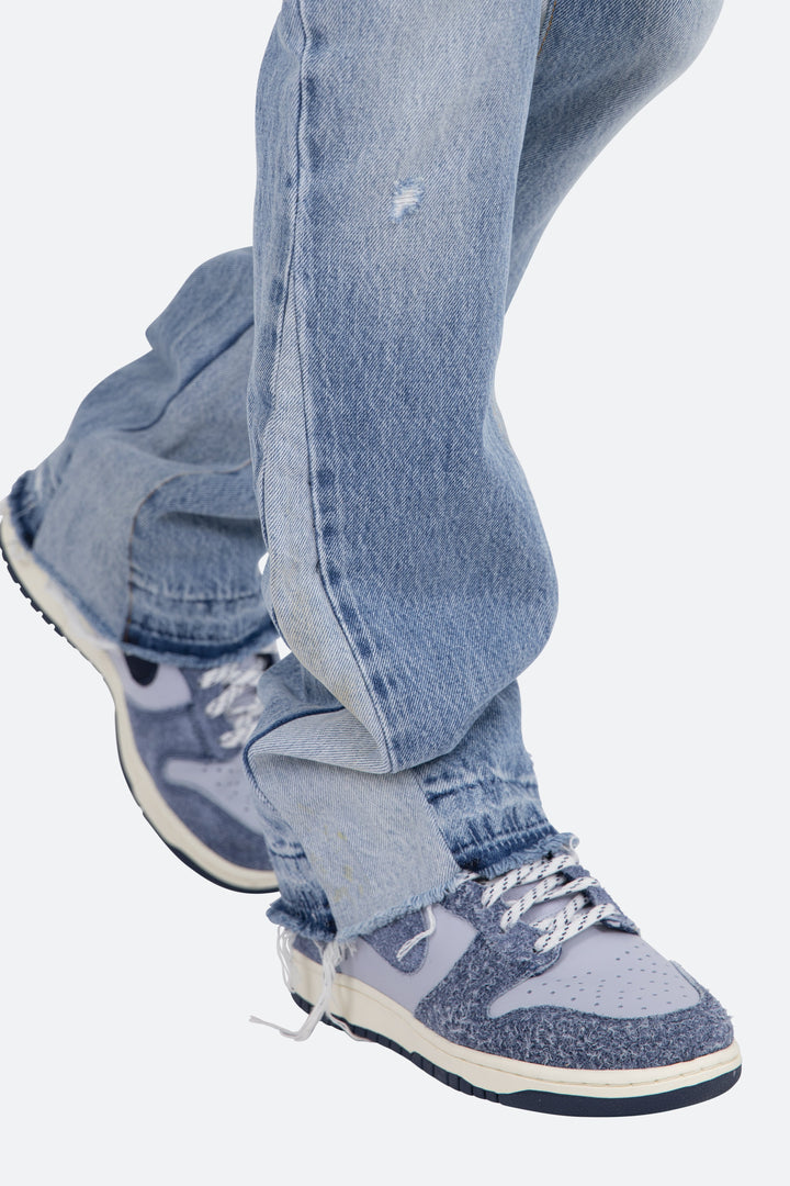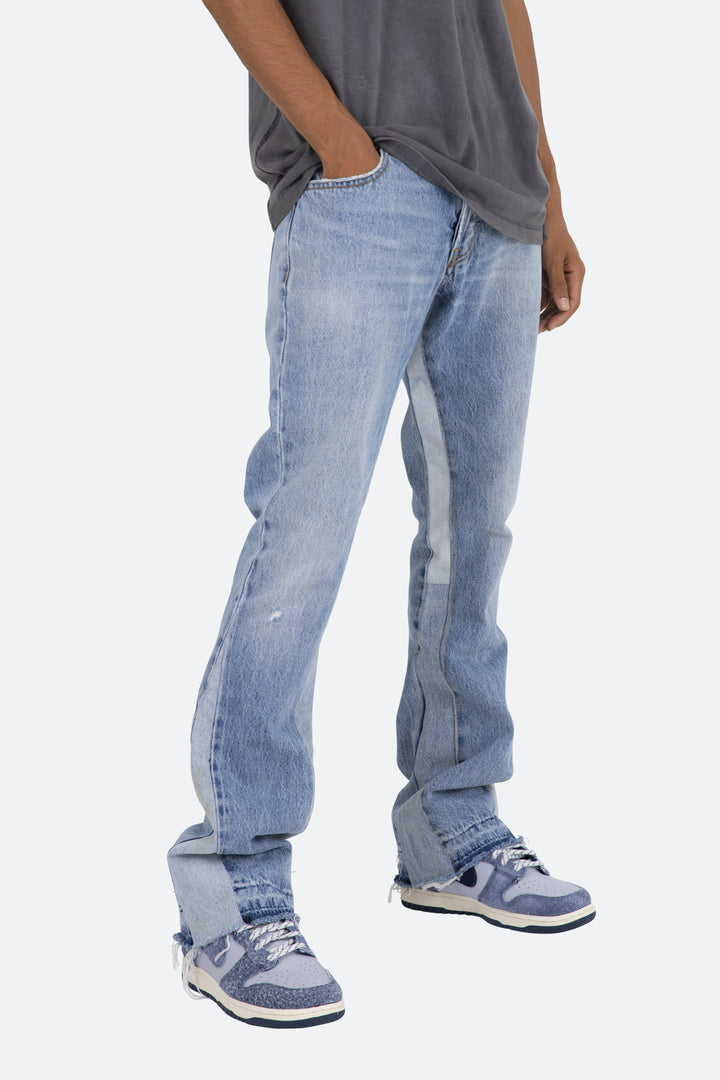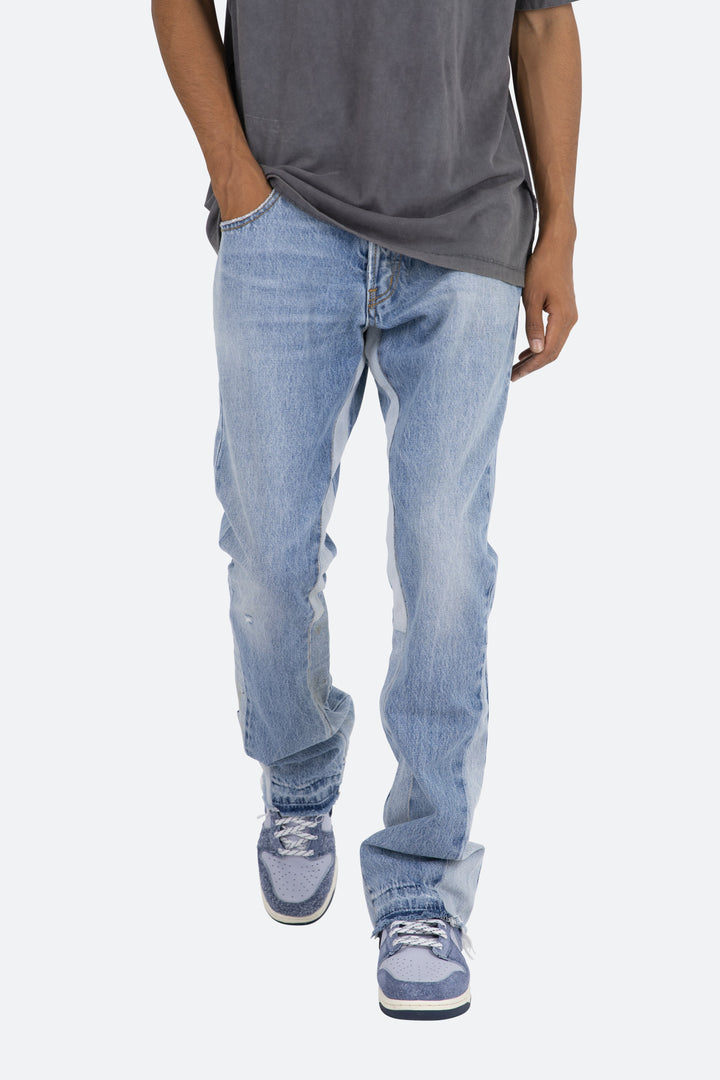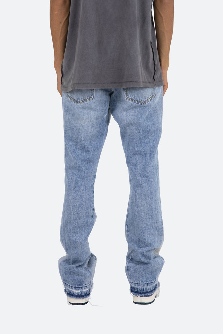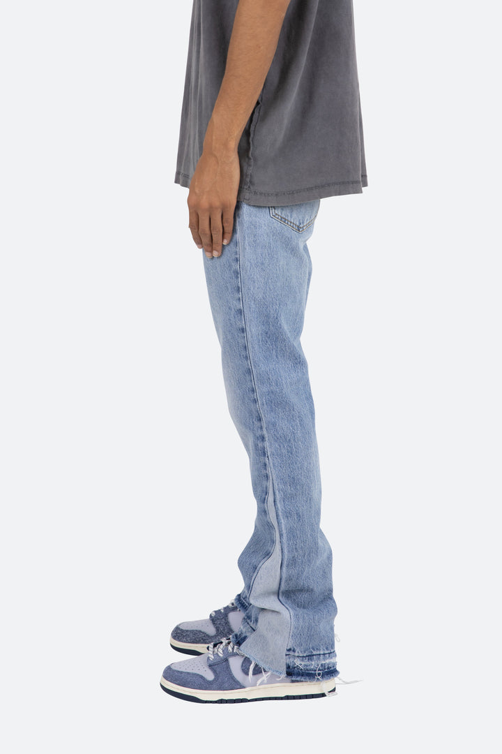 the B221 Flare Denim are designed with our new B fit, which is slim through the thigh and features a slight flare at the leg opening and is constructed from light washed blue denim, panelling at the inseam and outseam from contrasting blue denim for a slight flare and finished with a deconstructed hem.