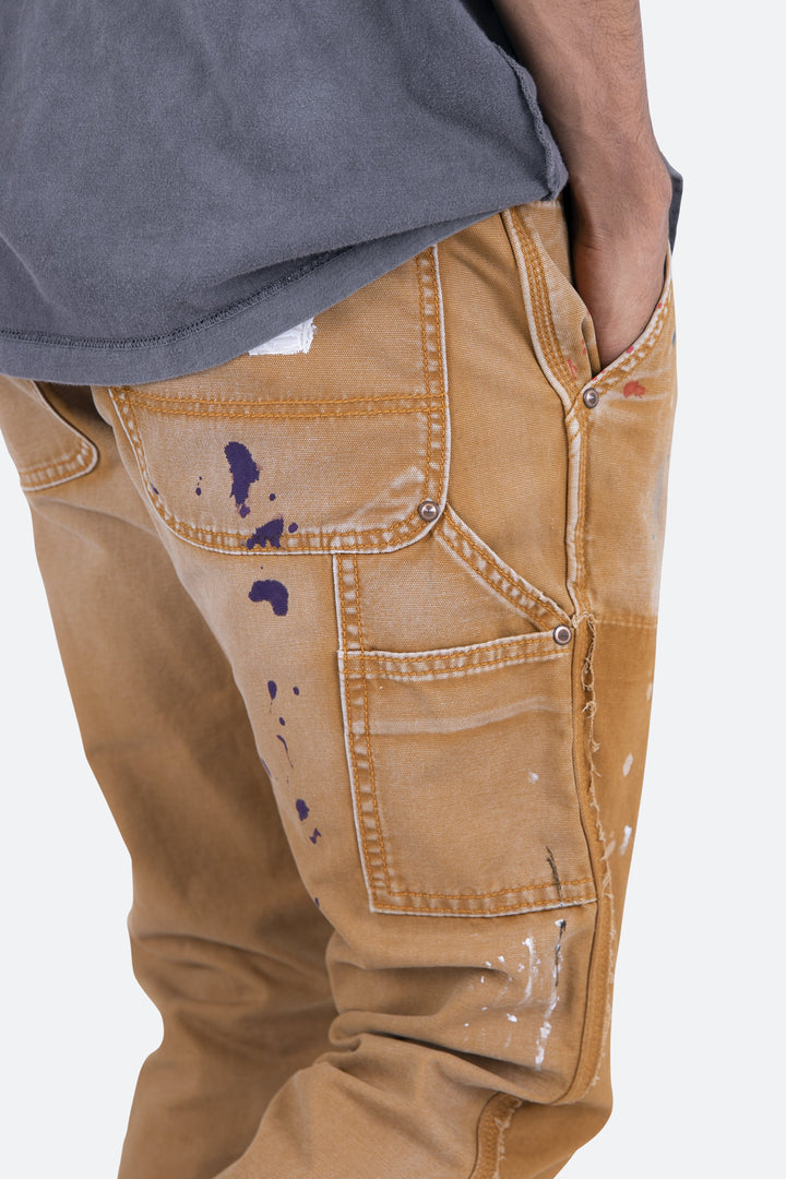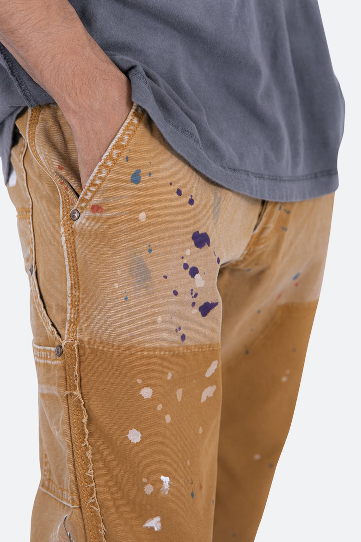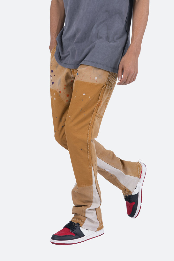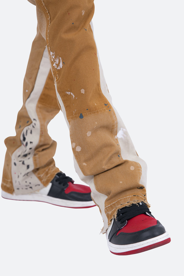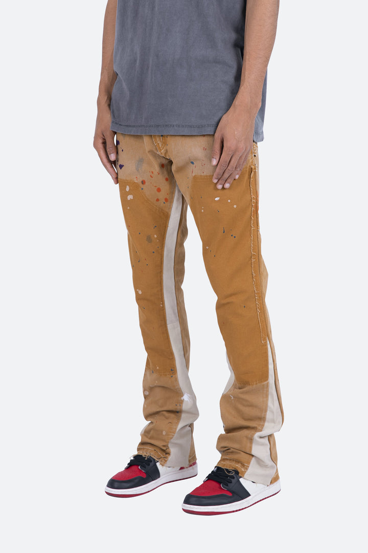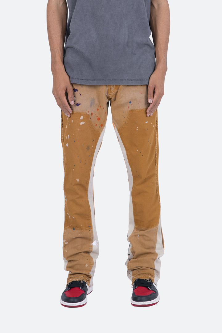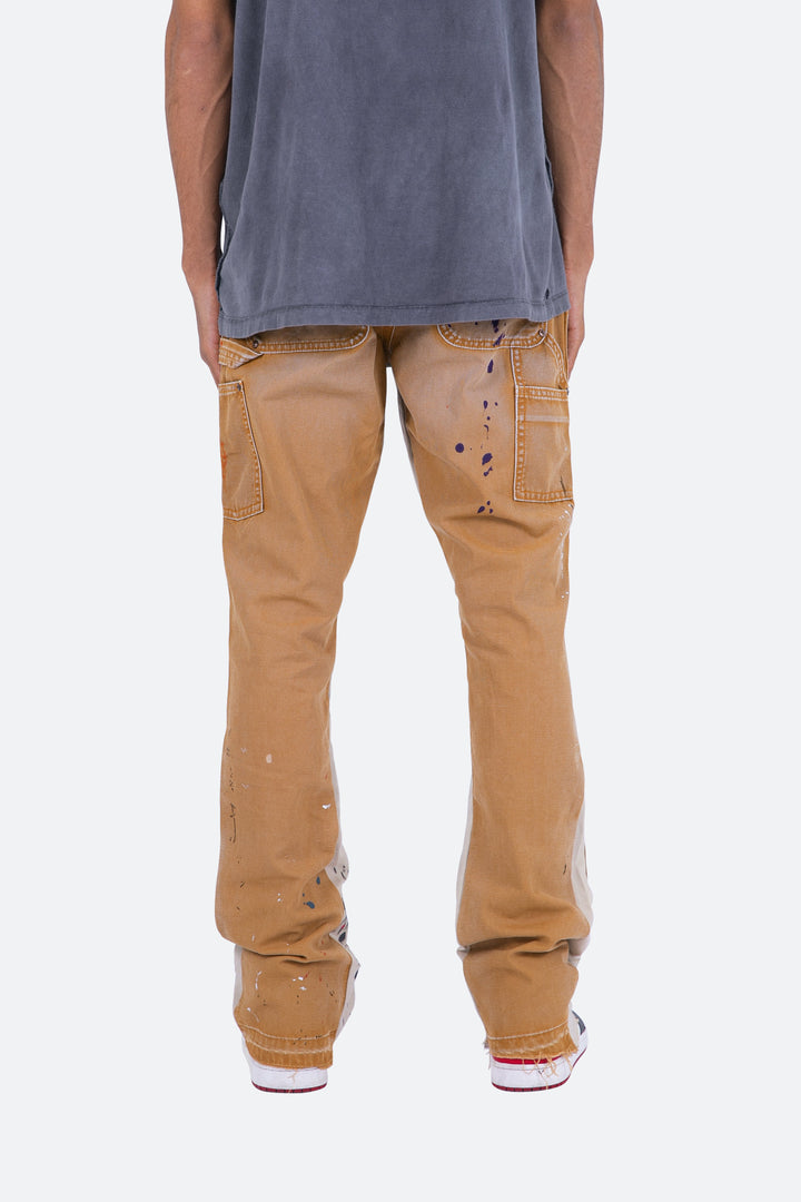 the B243 Flare Denim are designed with our new B fit, which is slim through the thigh and features a slight flare at the leg opening and is constructed from washed brown duck twill, work pants panelling removed after wash for contrasting wash area, panelling at the inseam and outseam for a slight flare, paint splatter throughout, and finished with a deconstructed hem.