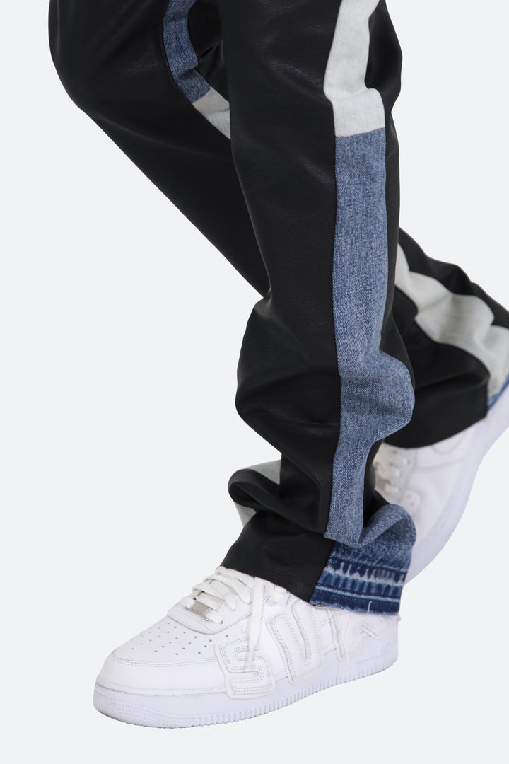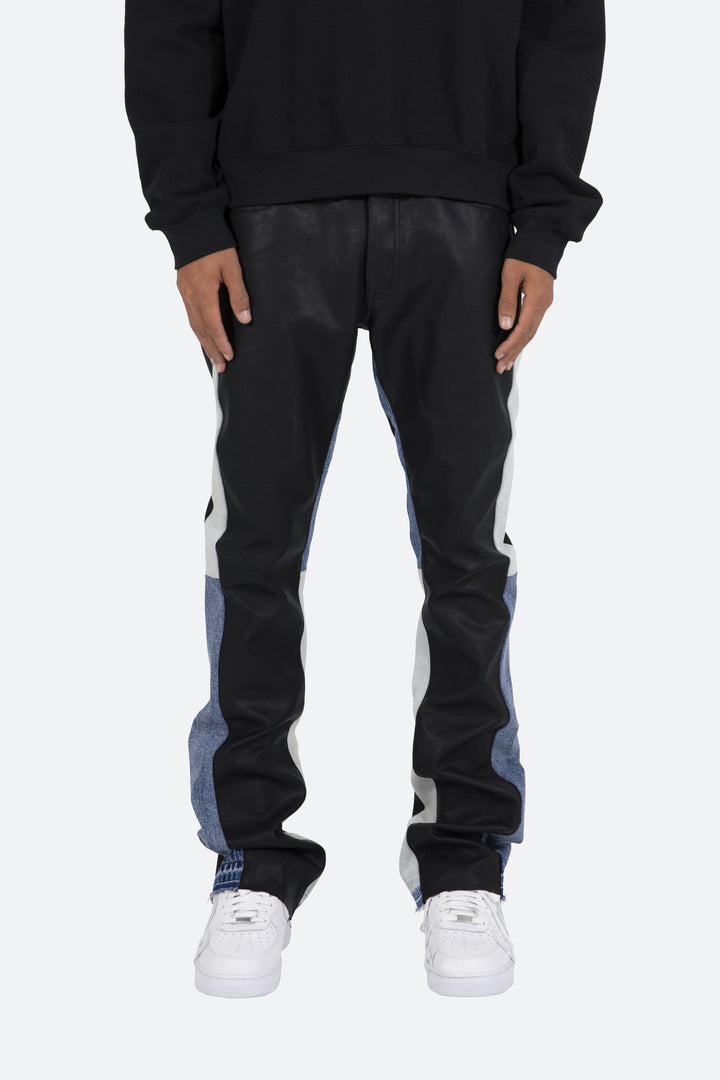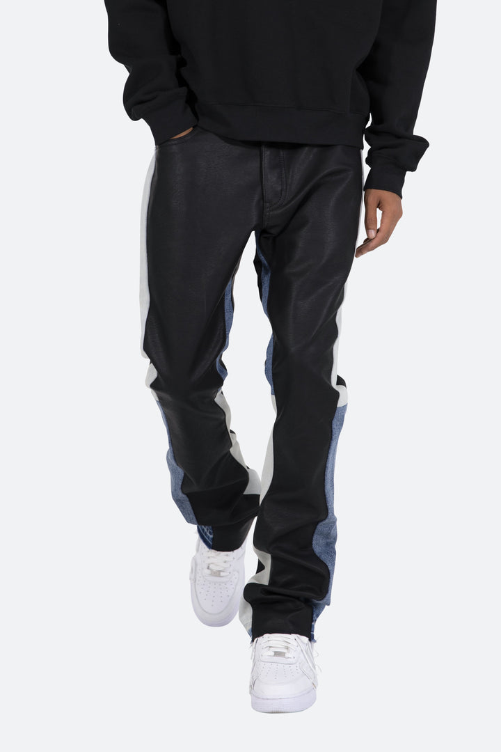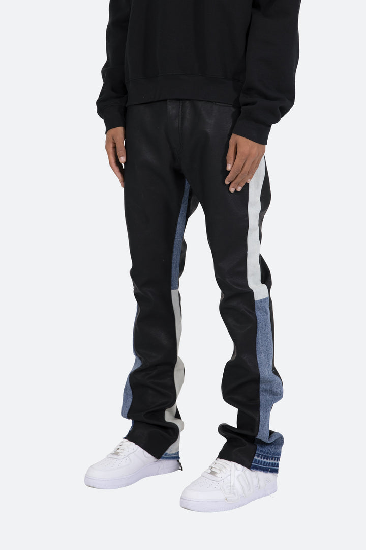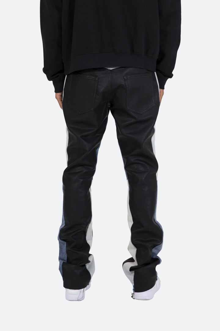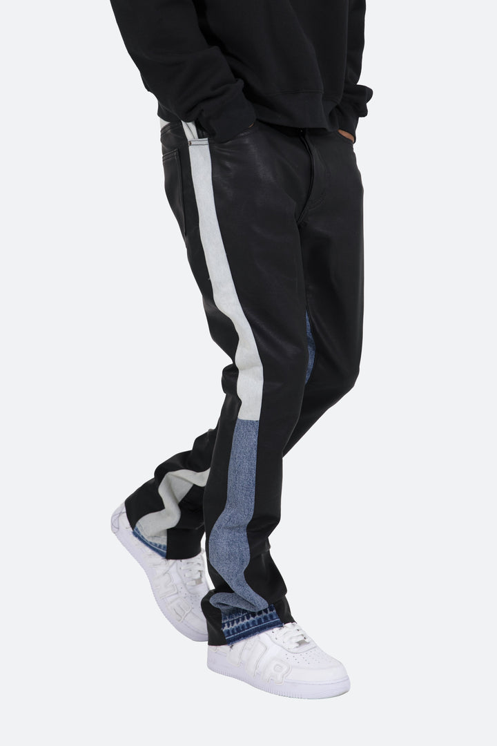 the B417 Leather Flare Denim are designed with our new B fit, which is slim through the thigh and features a slight flare at the leg opening and is constructed from washed vegan leather, denim panelling at the inseam, and finished with a deconstructed hem.