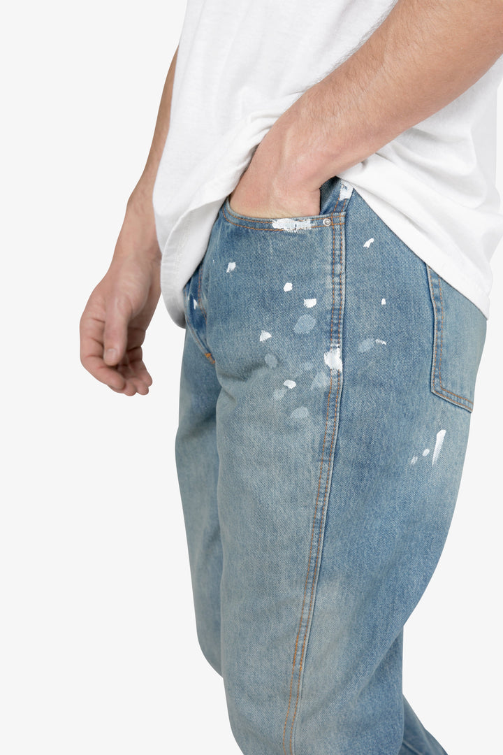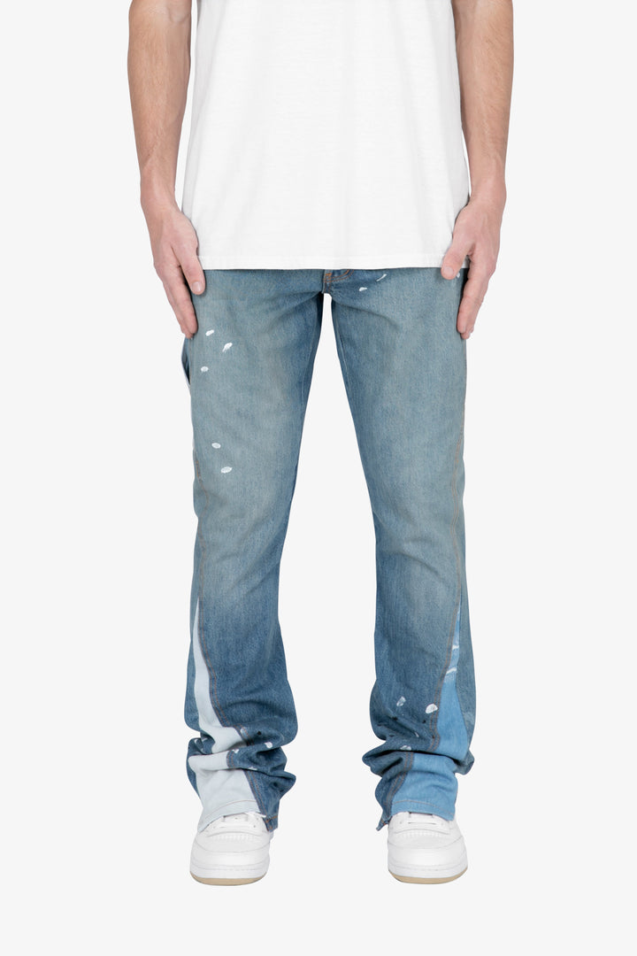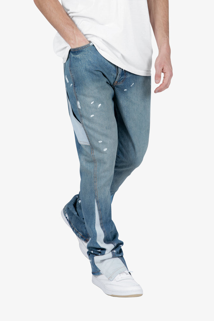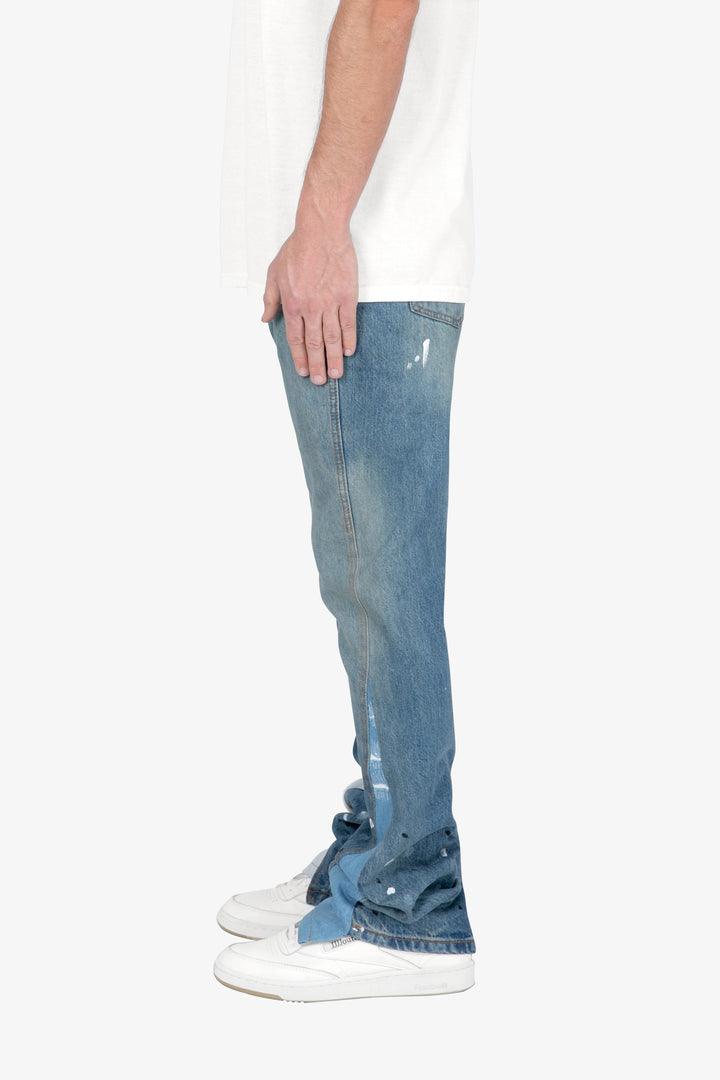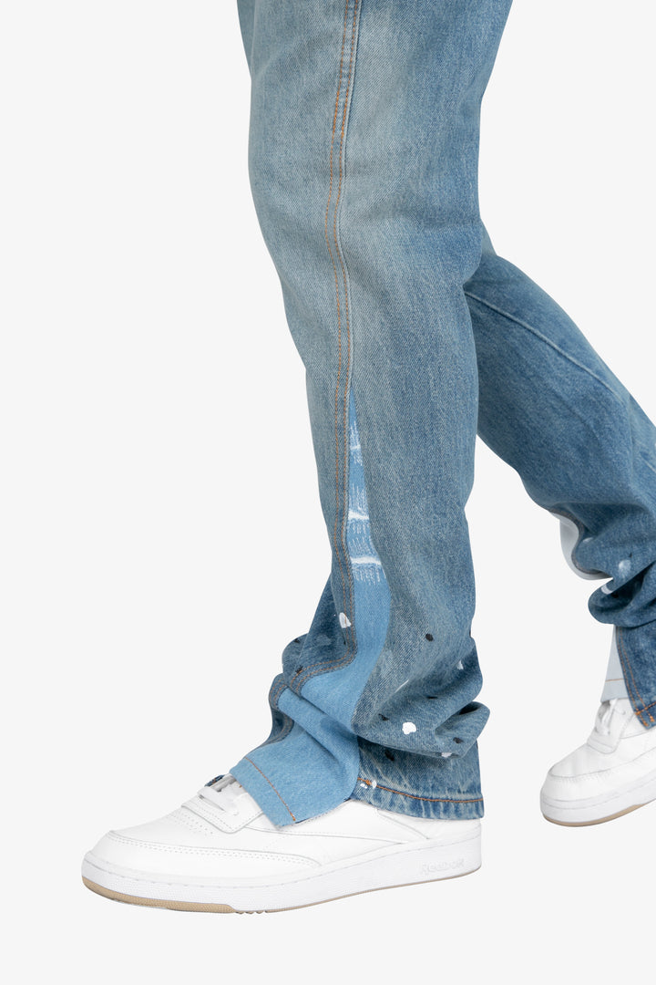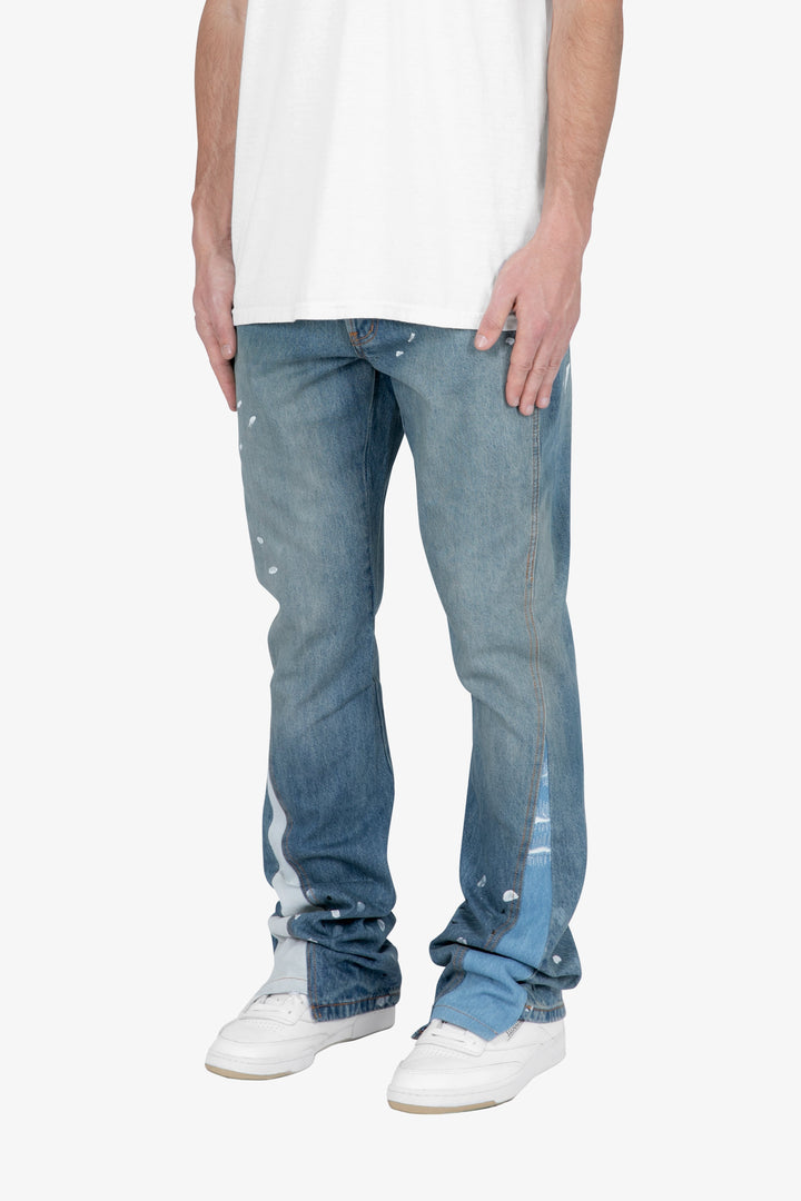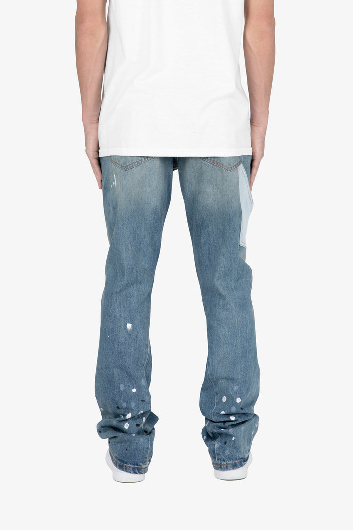the B425 Patch Flare Denim are designed with our new B fit, which is slim through the thigh and features a slight flare at the leg opening and is constructed from vintage washed blue denim, white paint splatter, patchwork panelling at the leg opening from contrasting blue denim for a slight flare and finished offset flare detail at the hem.