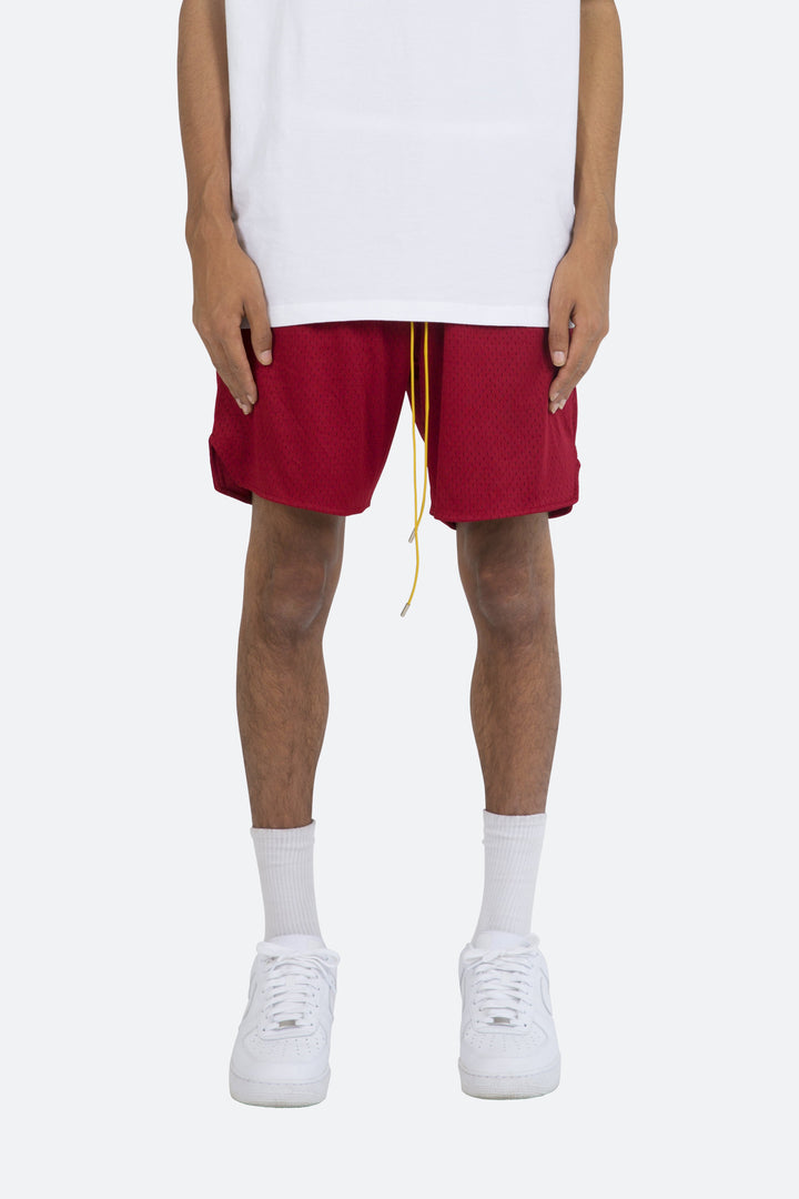 the Basic Mesh Shorts are constructed with a custom-knit mesh fabric in a relaxed fit. The short features striped ribbing at the waist, zipper pockets on the front, and a contrasting elastic drawstring.