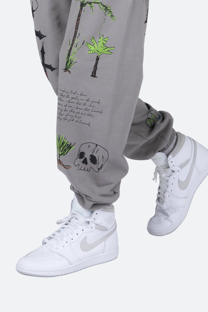 the Beach Sweatpants are designed with a relaxed fit throughout, featuring an elasticized self waist and leg opening, cotton drawstrings, and finished with screen prints throughout.