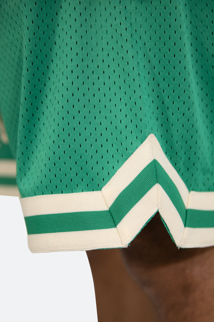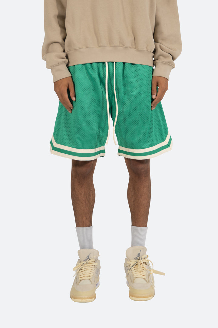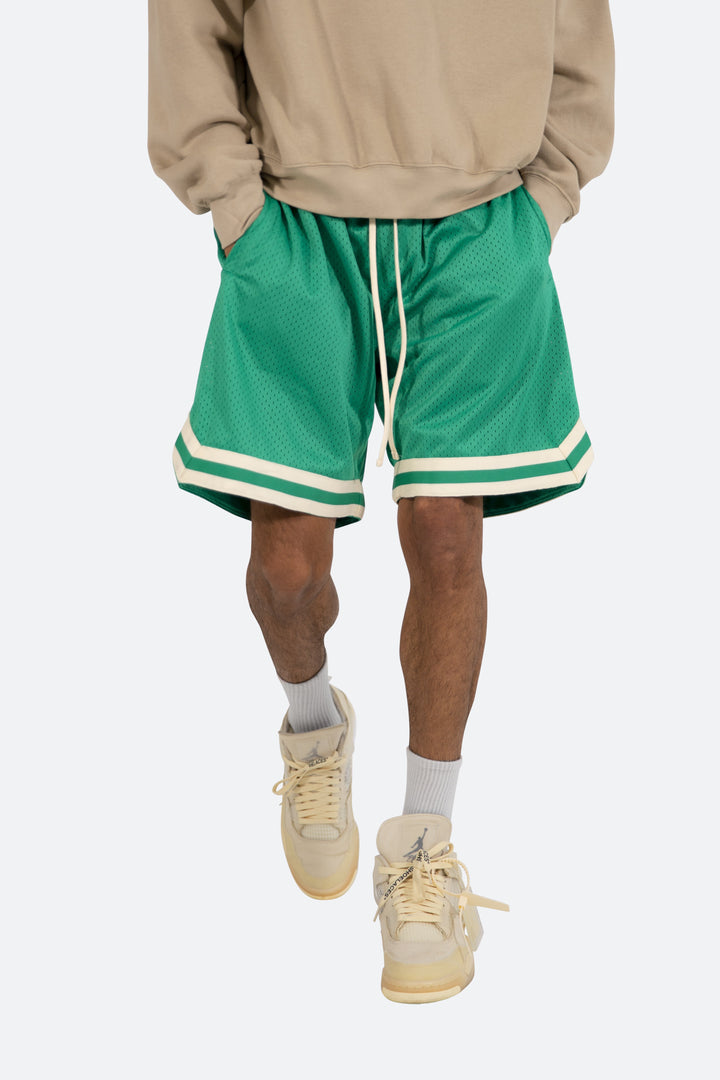 the Basic Basketball Shorts are constructed with a custom-knit mesh fabric in a relaxed fit. The short features striped ribbing at the waist, striped and notched taping at the bottom hem, welt pockets on the front, and a drawstring.