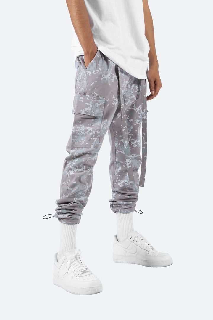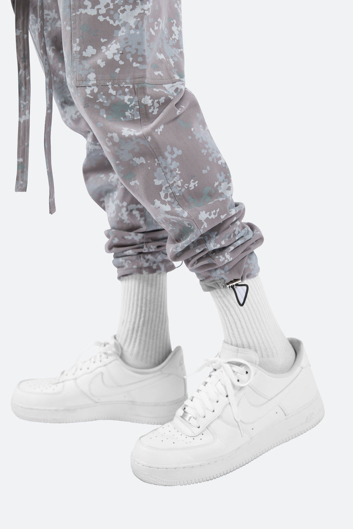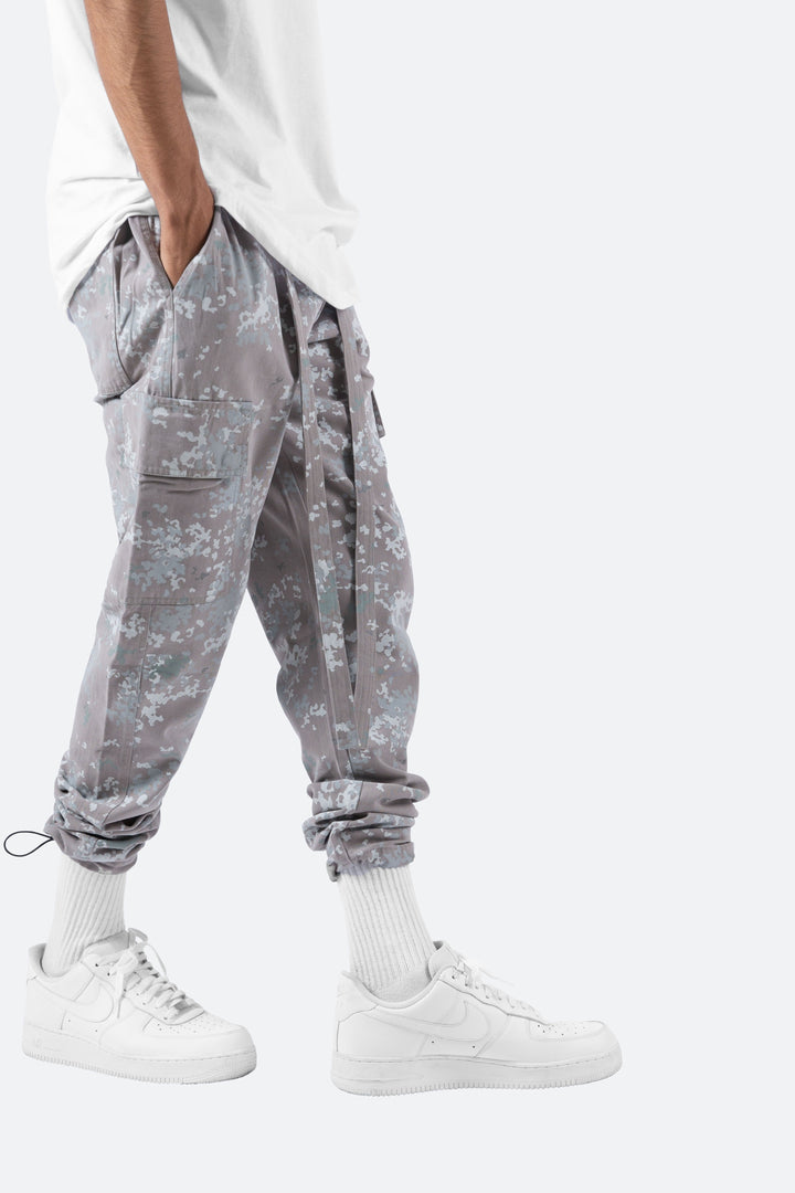 the Cargo Lounge Pants are designed with a baggy, relaxed fit throughout, featuring an elastic waistband, built in belt constructed of self-fabric, cargo pockets at side seam, with elastic cord locks at the leg opening, and finished with a custom camo print.