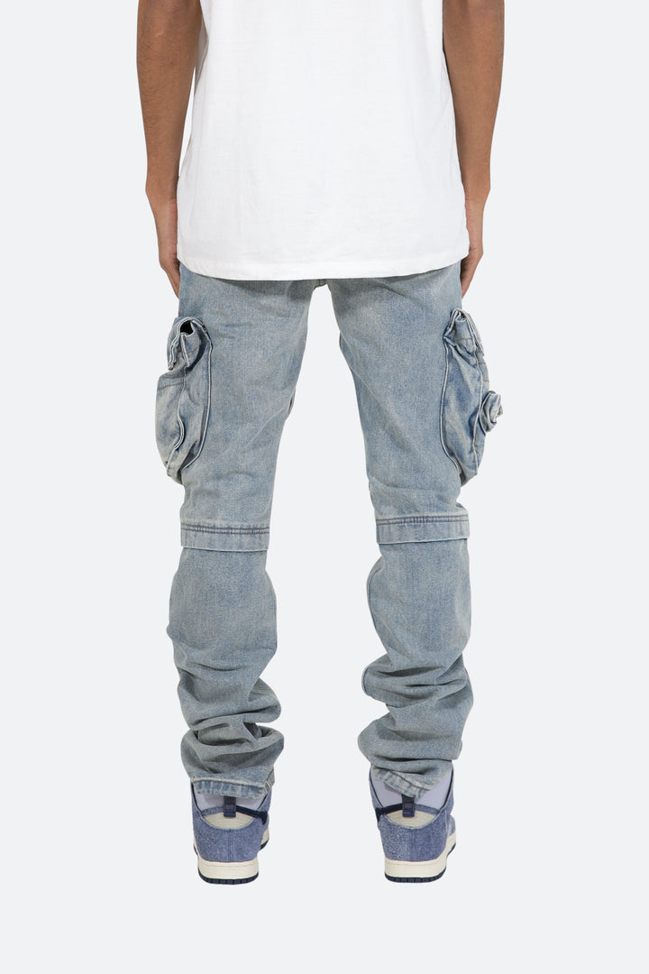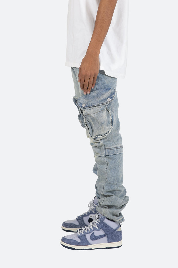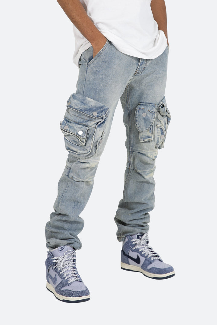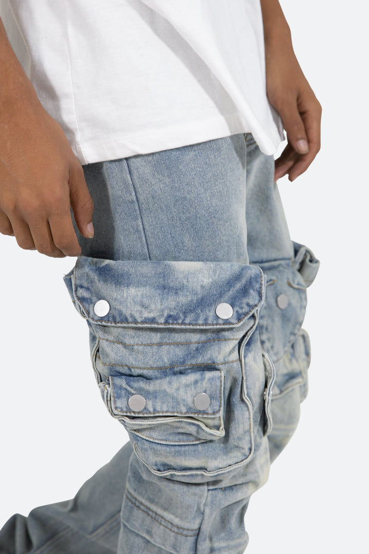 the Snap Denim Cargo Pants are designed with a relaxed fit throughout with cargo pockets at the side seam with snap button closures, a button fly, and finishing off with vintage wash blue denim.
