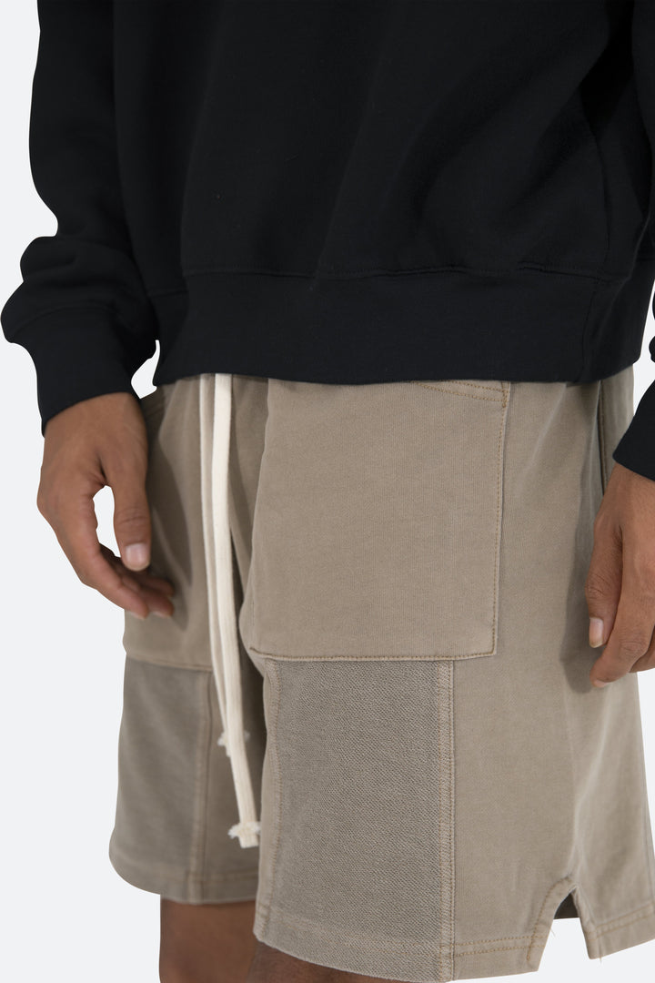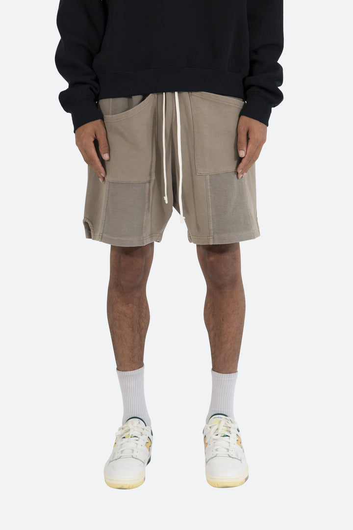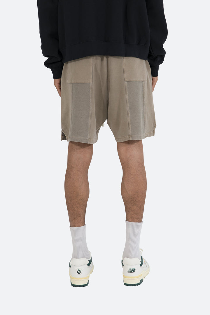 the Terry Paneled Shorts are constructed from french terry fabric in a relaxed fit and feature an elasticized waist in self fabric, patch pockets, a cotton drawstring, and finished with reverse facing panels.