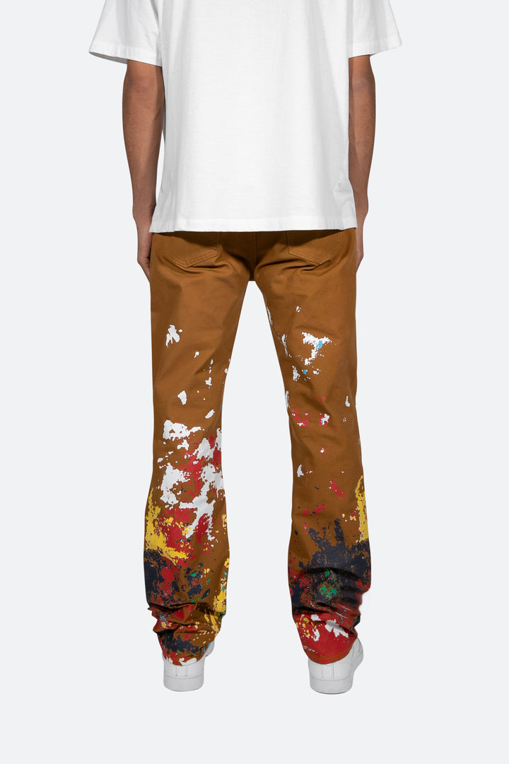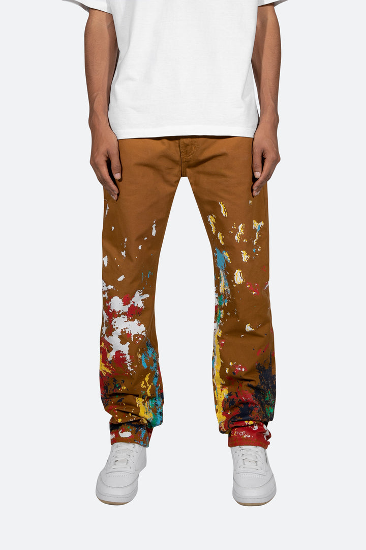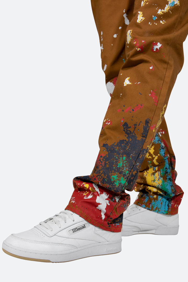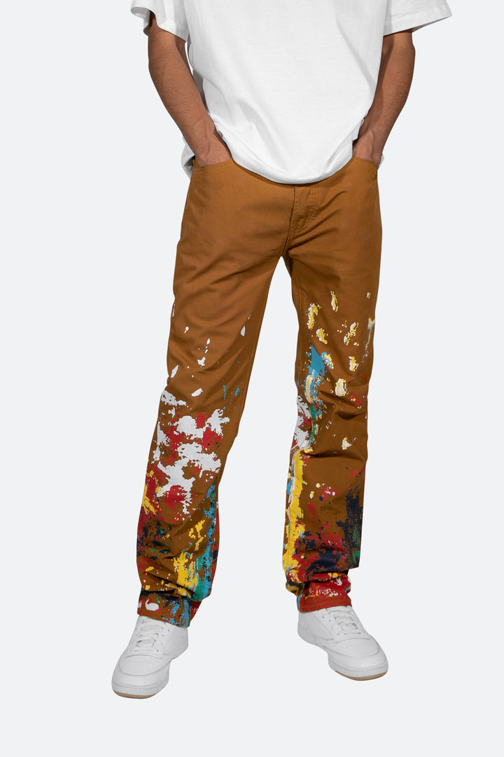 the Broken Paint Baggy Pants are designed with a relaxed fit throughout, constructed from a washed twill, traditional denim details, and finished with multi color paint details throughout.