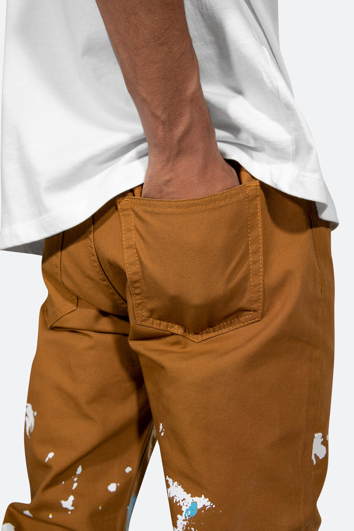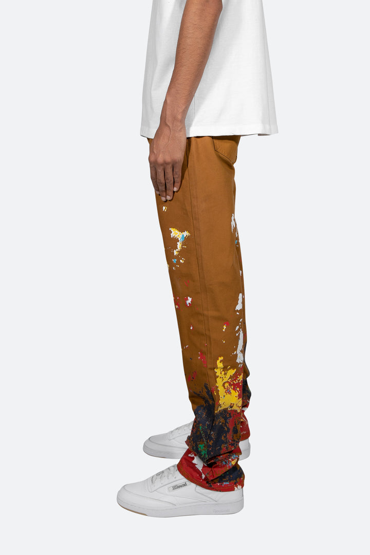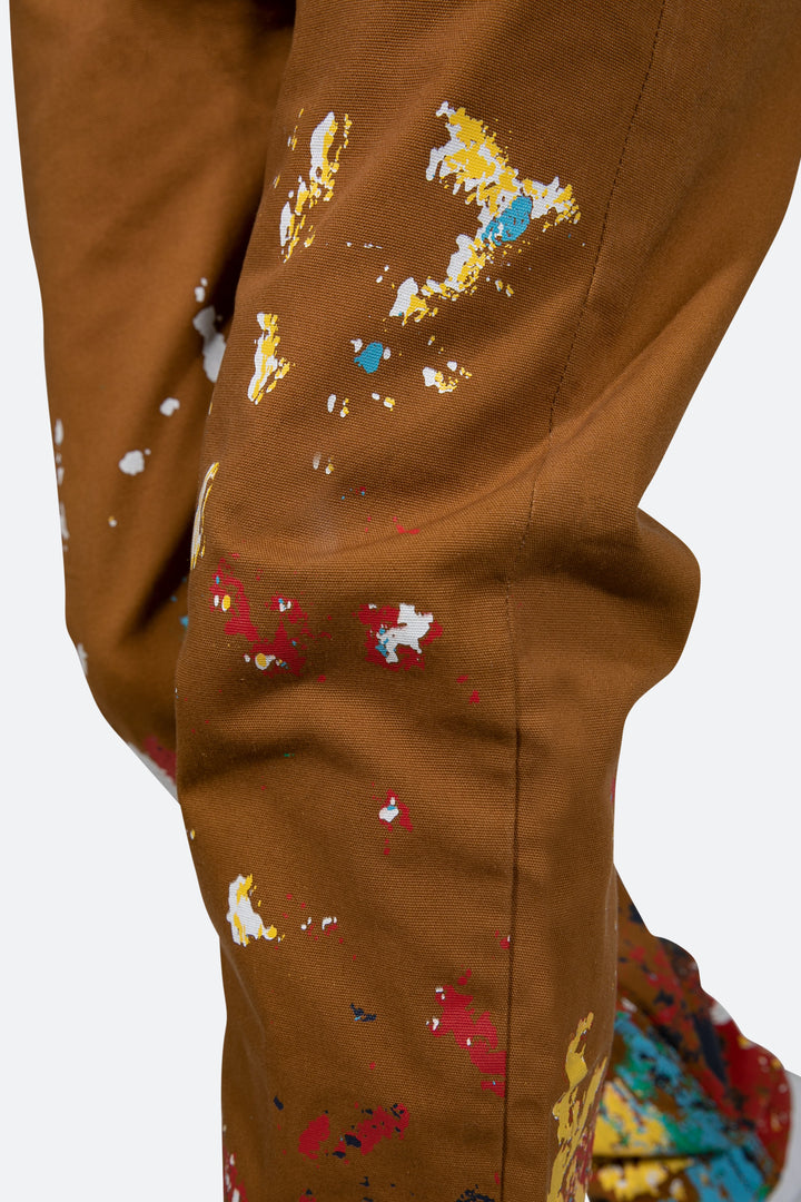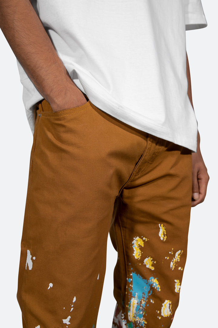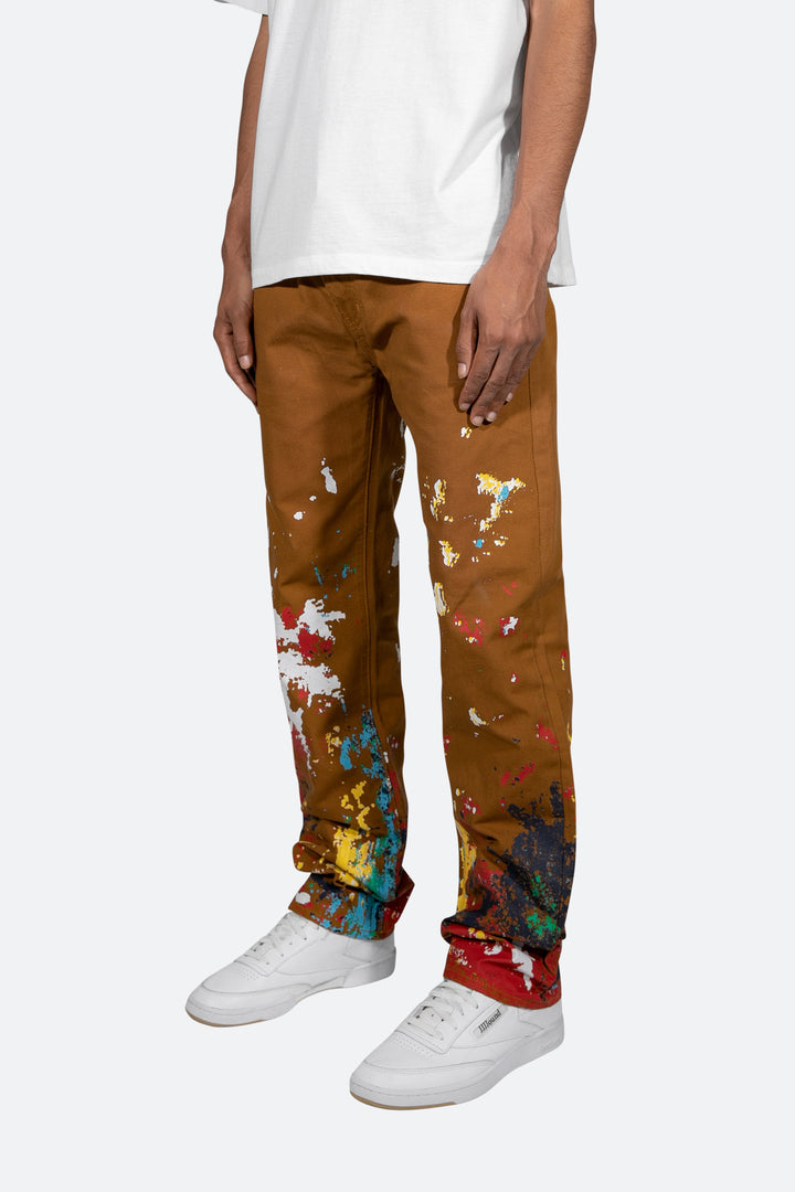 the Broken Paint Baggy Pants are designed with a relaxed fit throughout, constructed from a washed twill, traditional denim details, and finished with multi color paint details throughout.