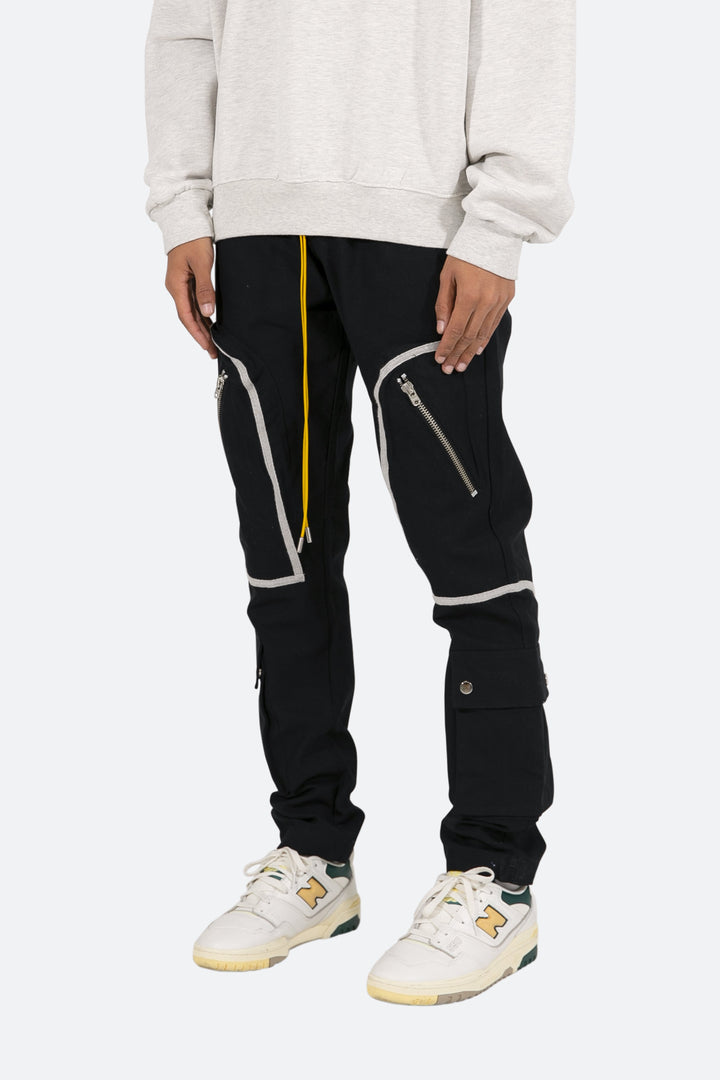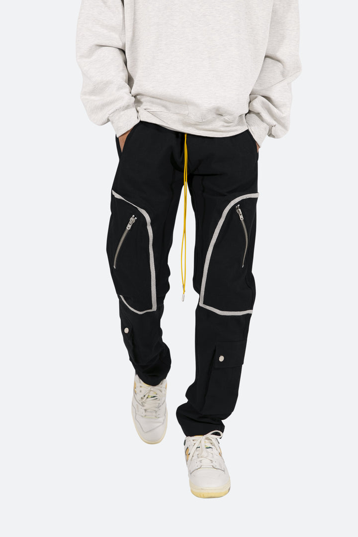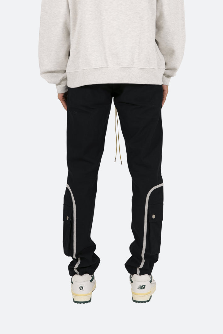 the Contrast Taped Cargo Pants are designed with a relaxed fit throughout the leg, with large cargo pockets located on the front with contrast taping, an elastic waistband, yellow elastic drawcord, and finished with welt pockets at the side seam.