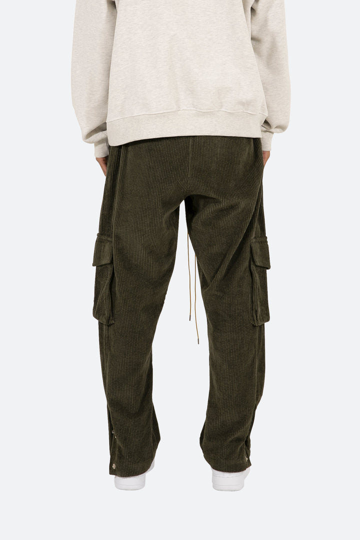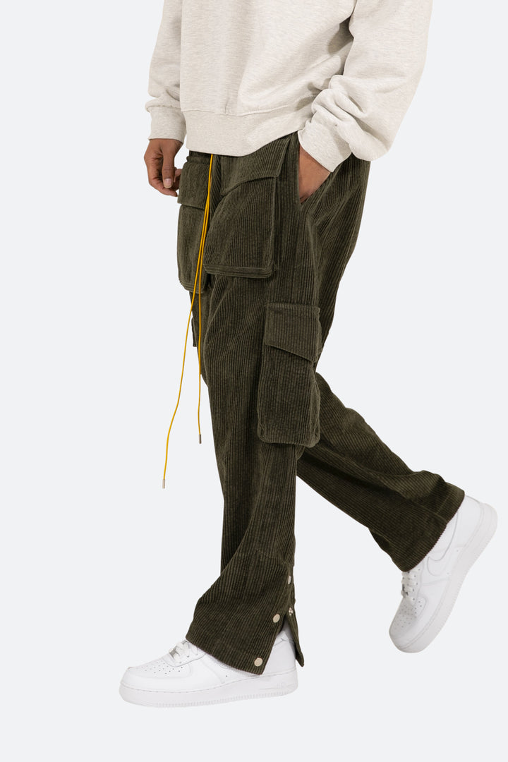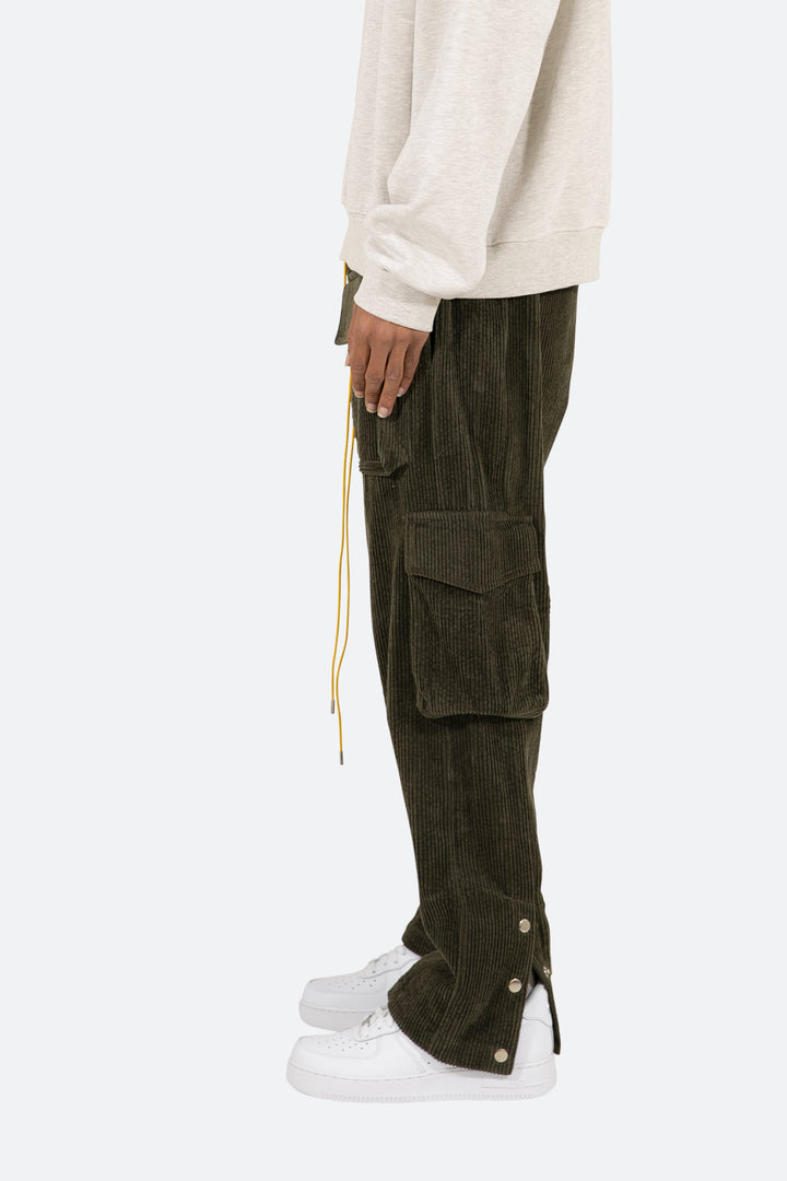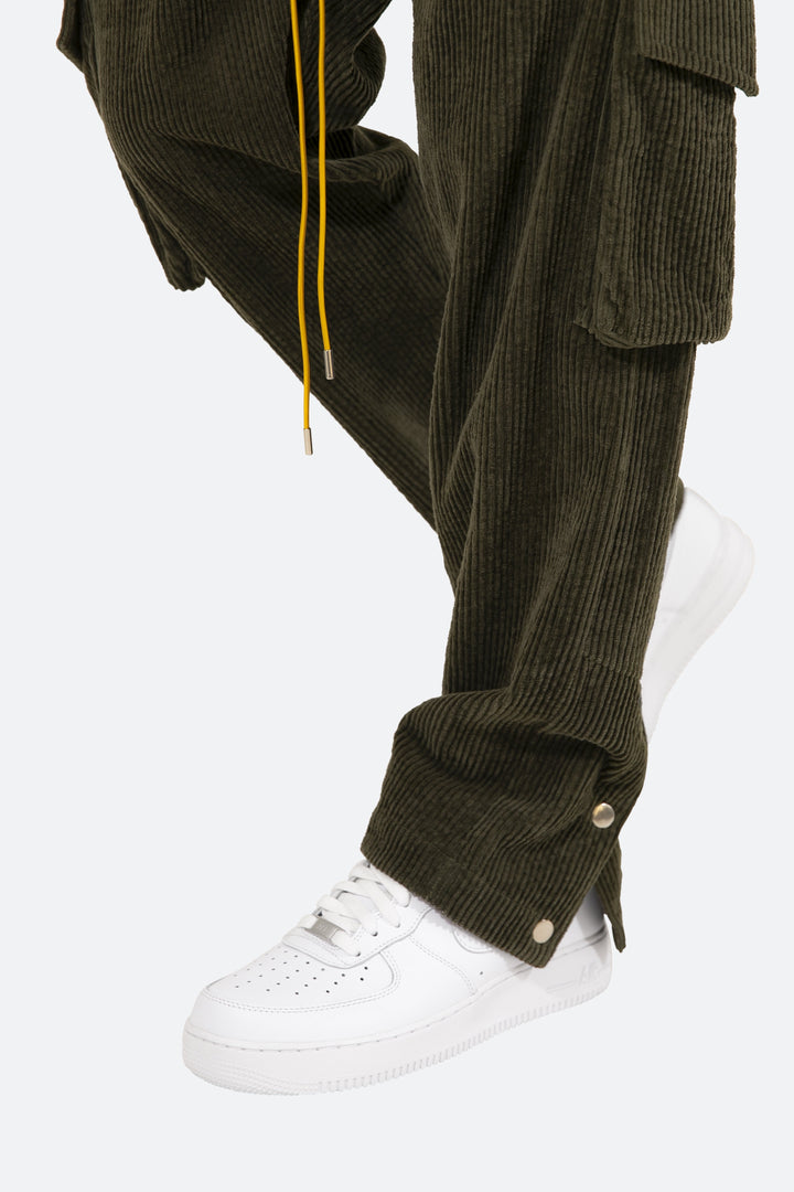 the Corduroy Snap II Cargo Pants are designed with an updated, relaxed, fit throughout, cargo pockets located on the front thigh and side seam, an elastic waistband with elastic drawcord, and finished off with a snap enclosure at the outseam.