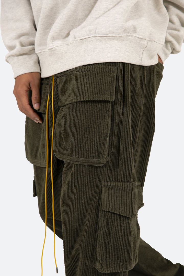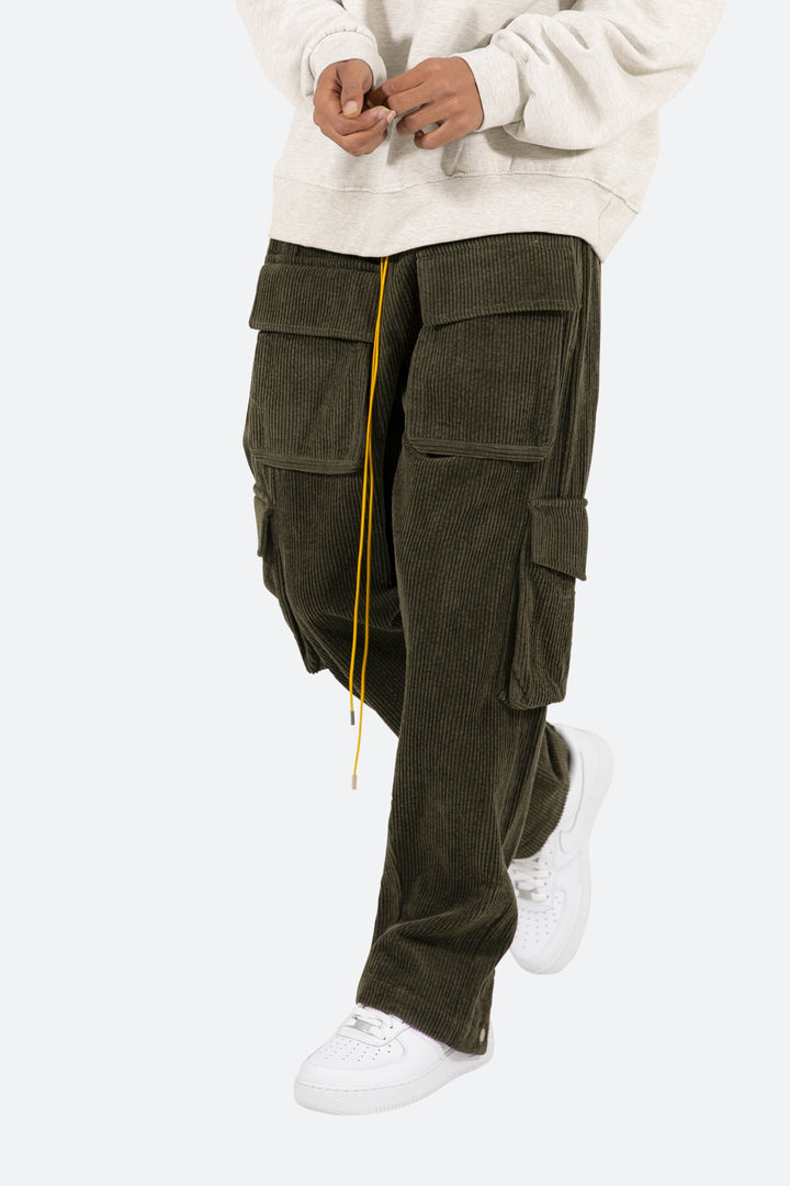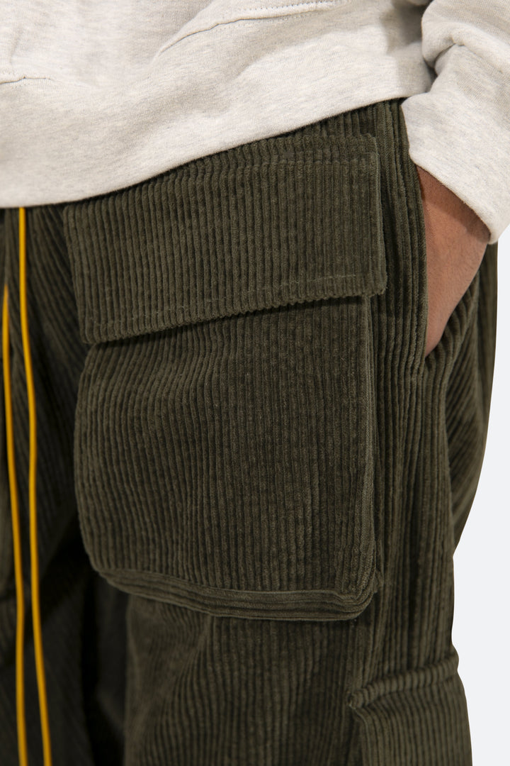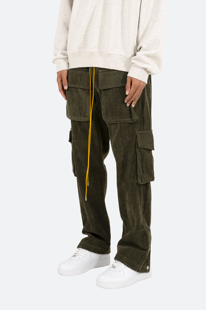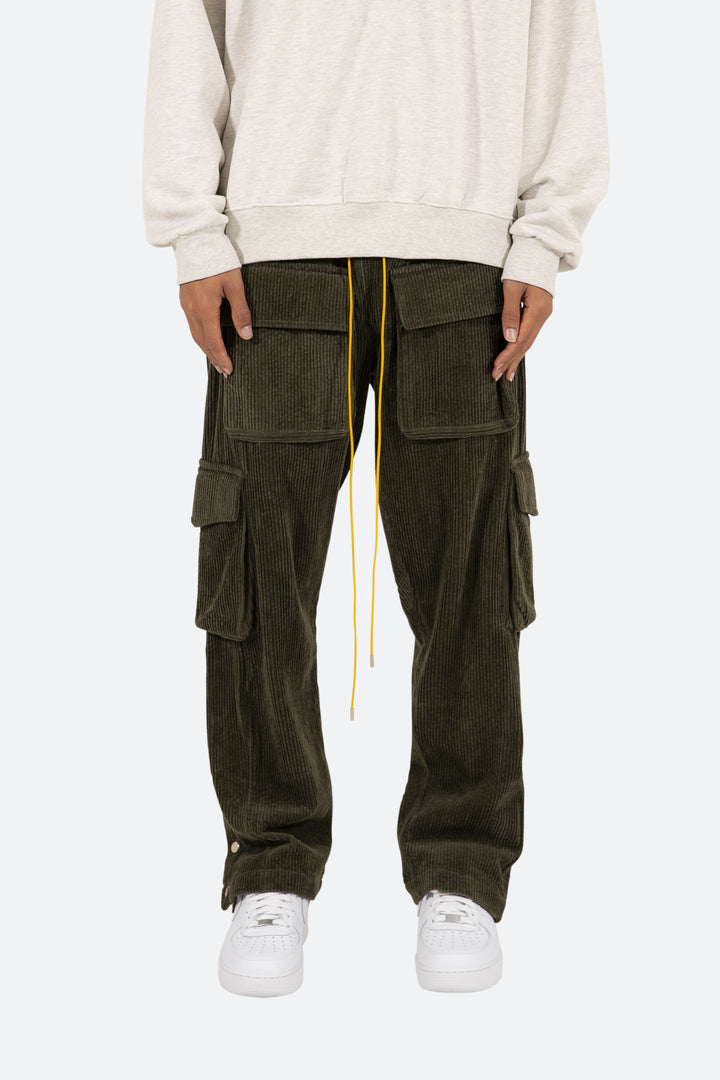 the Corduroy Snap II Cargo Pants are designed with an updated, relaxed, fit throughout, cargo pockets located on the front thigh and side seam, an elastic waistband with elastic drawcord, and finished off with a snap enclosure at the outseam.