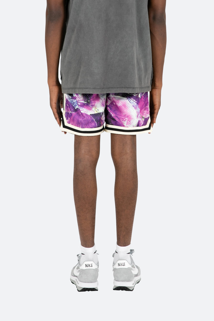 the Crystal Basketball Shorts are constructed with a knit mesh fabric in a relaxed fit with all over sublimated artwork. The short features striped ribbing at the waist, striped taping at the bottom hem and outseam, welt pockets on the front, and a cotton drawstring.