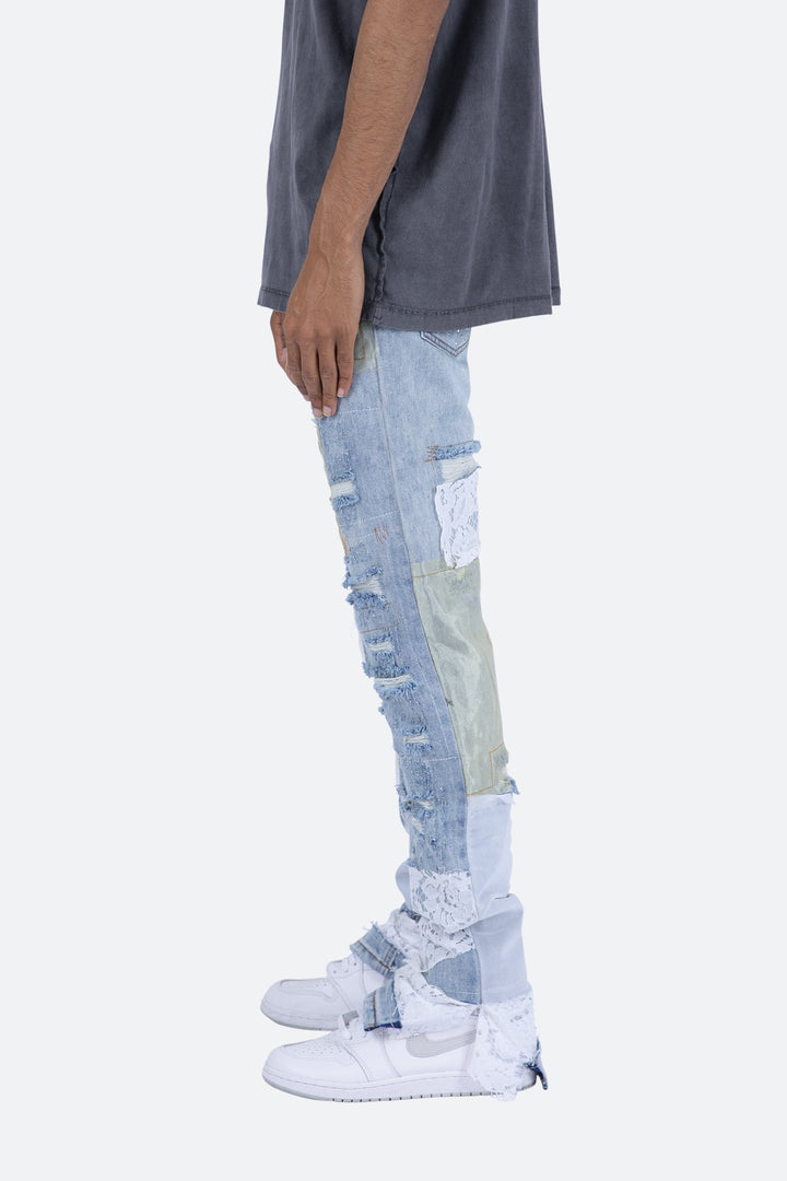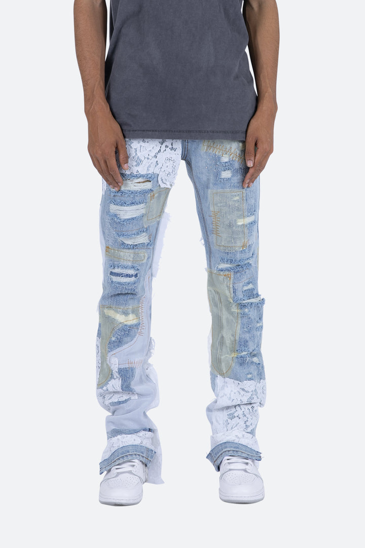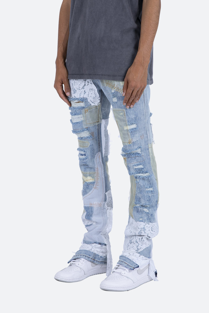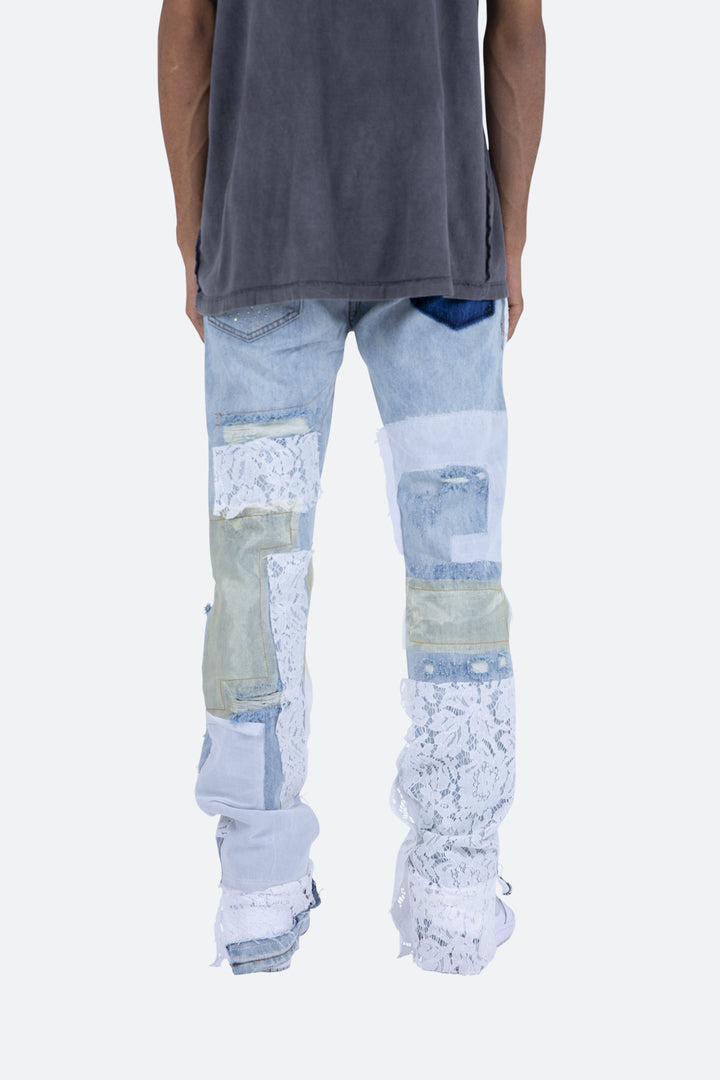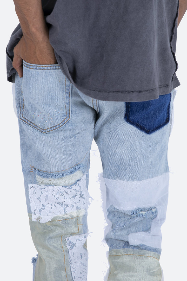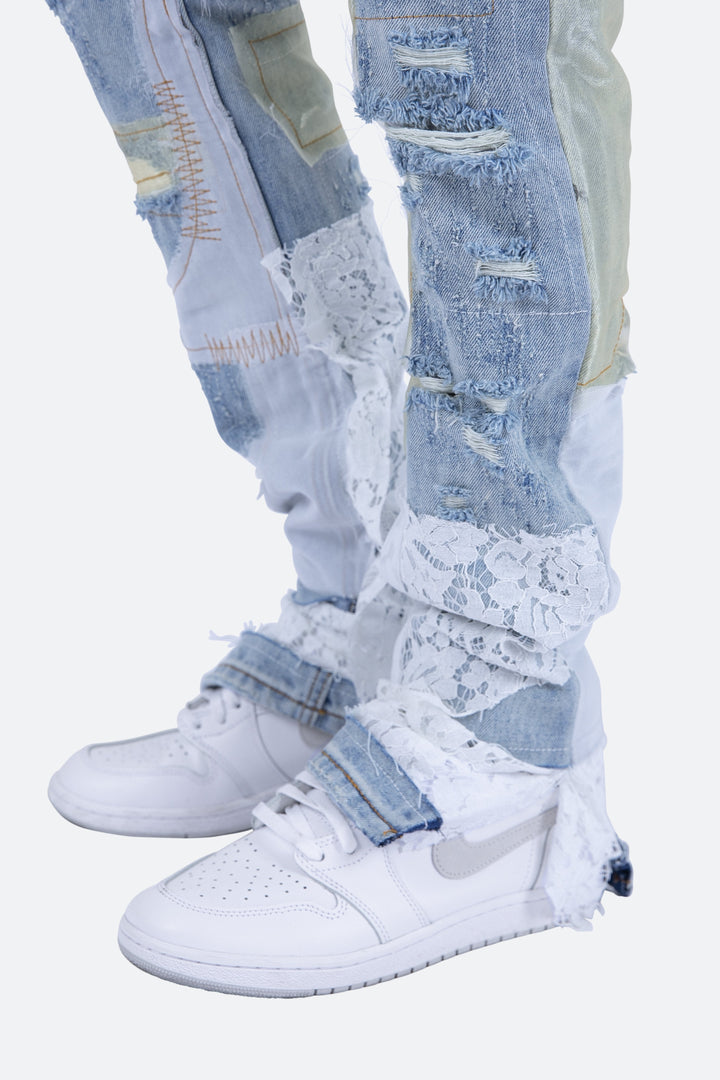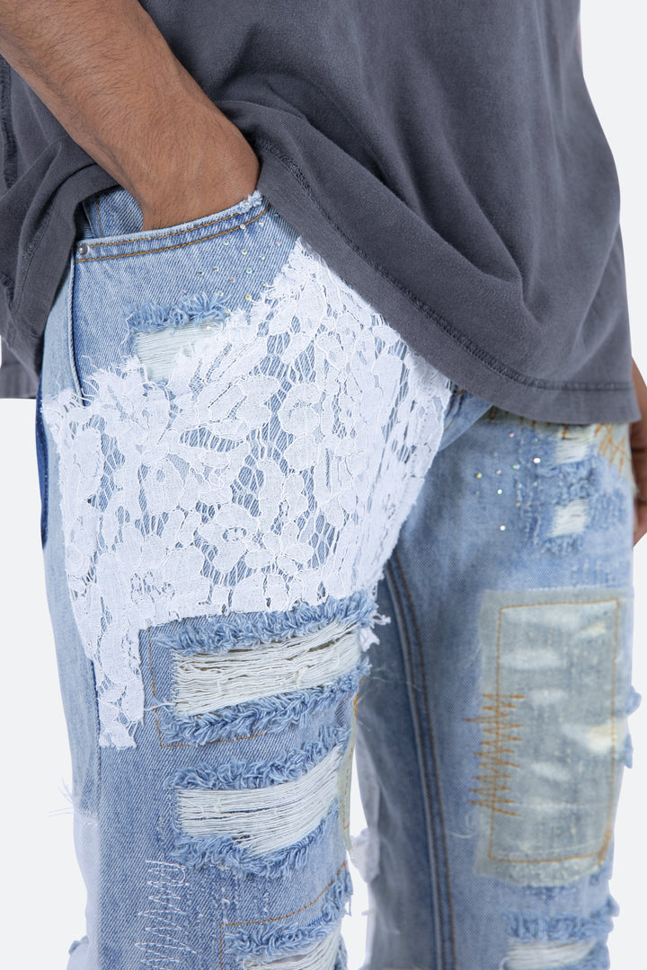 the D101 Denim is designed with our new D fit which is relaxed throughout with an extended inseam for stacking and features a base of a light wash denim, distressing and repairs throughout, fusing and lace patches throughout, rhinestone details on the wearer’s back left pocket, removed wearer’s right back pocket, and finished with lace flare details at the leg opening.