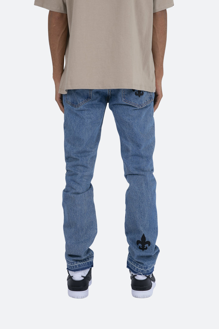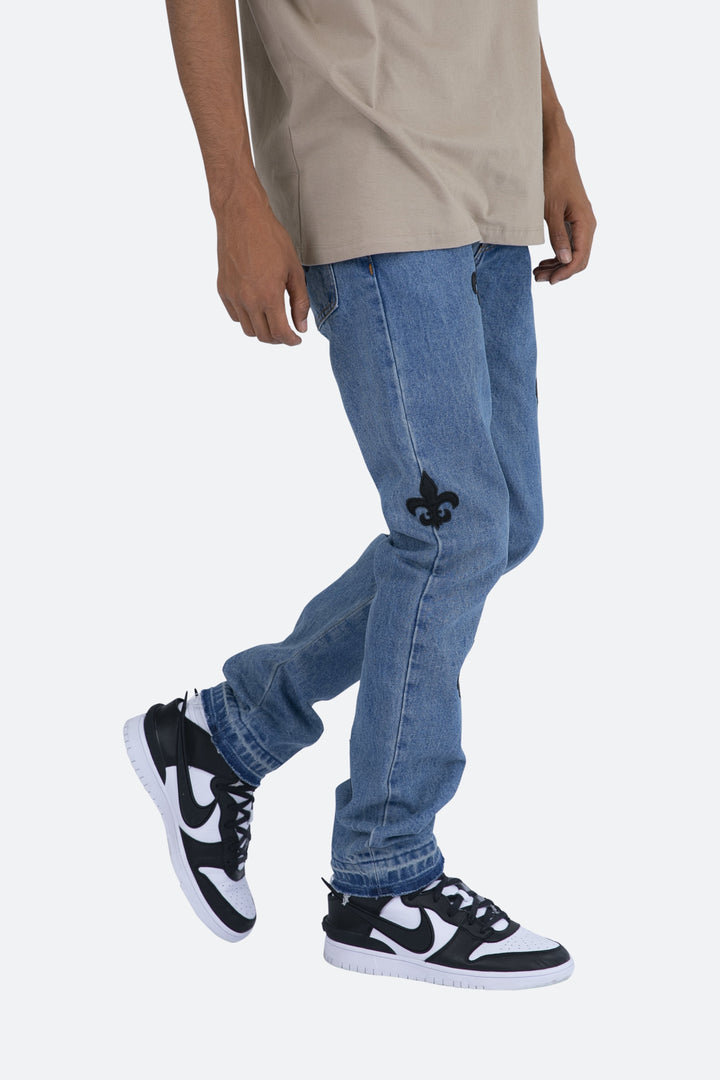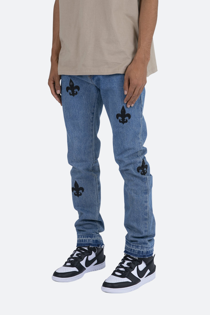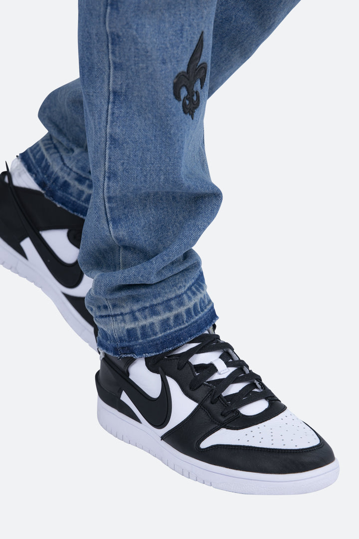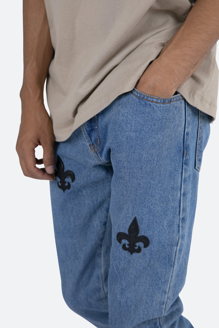 the D112 Fleur Denim is designed with our new D fit which is relaxed throughout with an extended inseam for stacking and features a warm, vintage wash, with whiskering and sanding throughout, and finished with poly-leather fleur de lis appliques throughout.