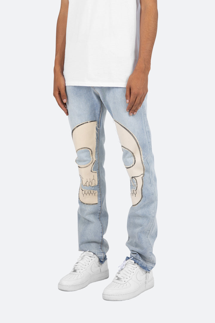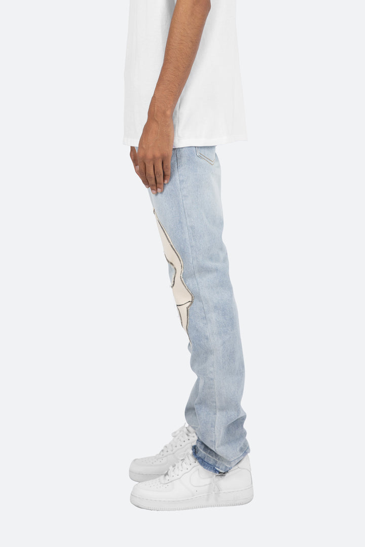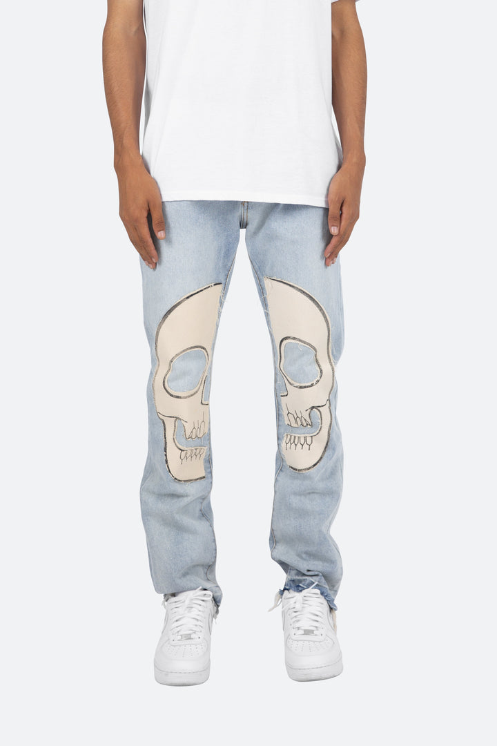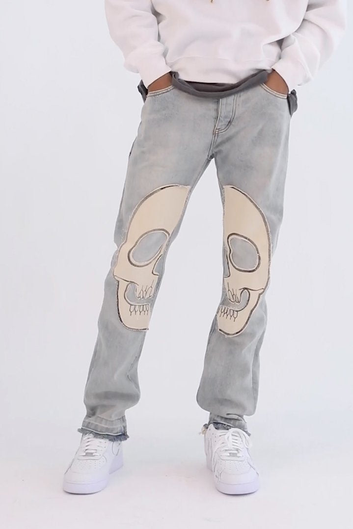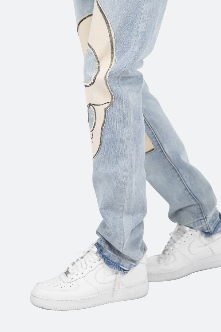 the D181 Denim is designed with our new D fit which is relaxed throughout with an extended inseam for stacking and features sewn-on skeleton artwork in canvas on both legs and is constructed from black denim with a raw leg opening.