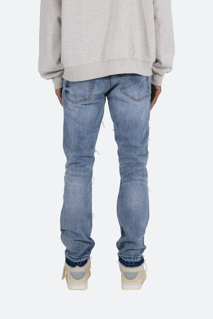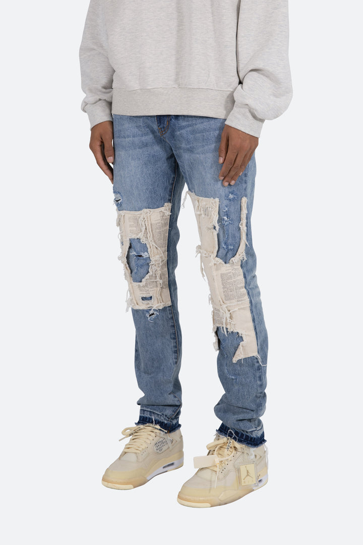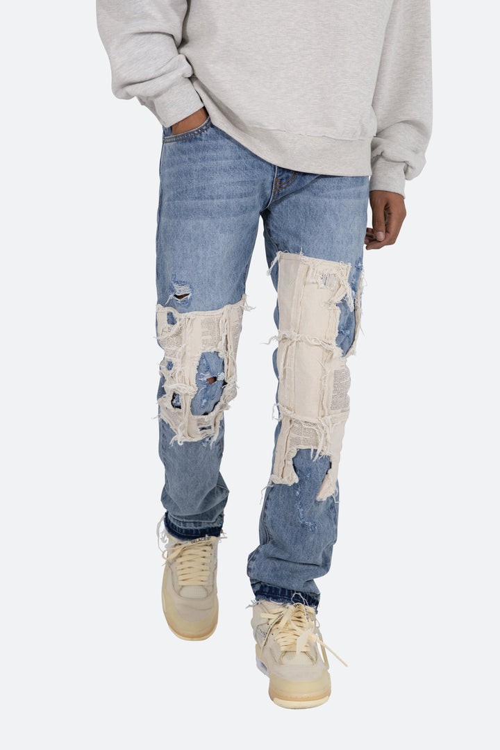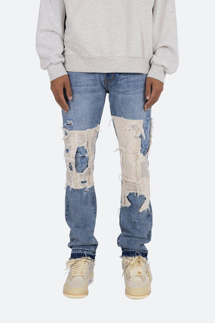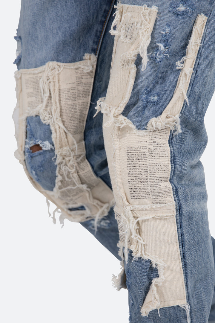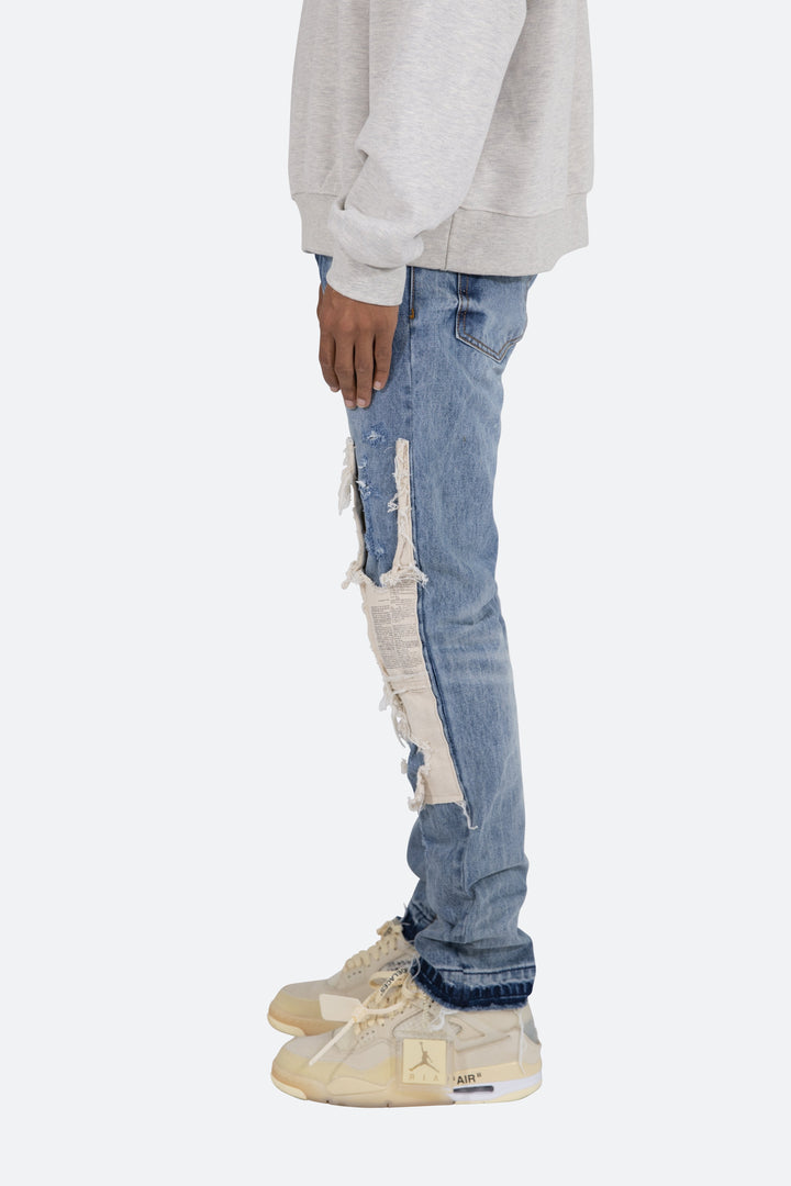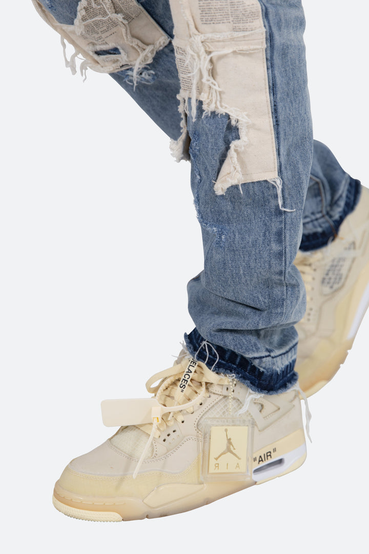 the D197 Poem Denim is designed with our new D fit which is relaxed throughout with an extended inseam for stacking and features a medium wash, and finished with printed cotton canvas panels at the knee and finished with distressing throughout.