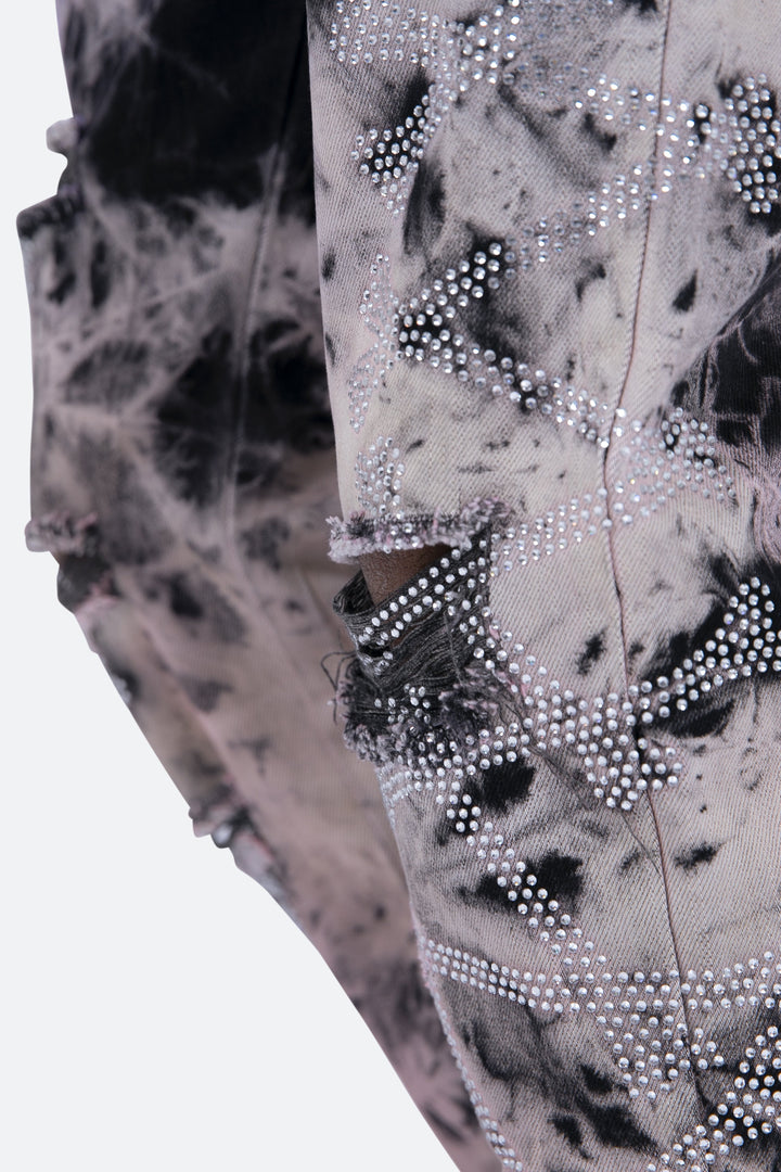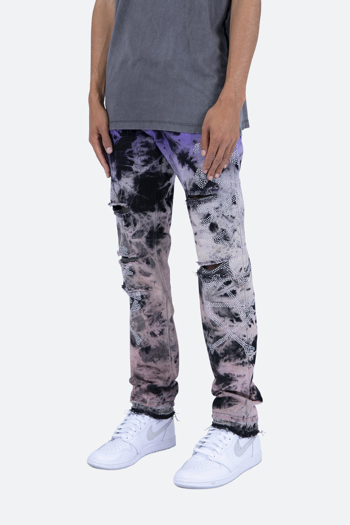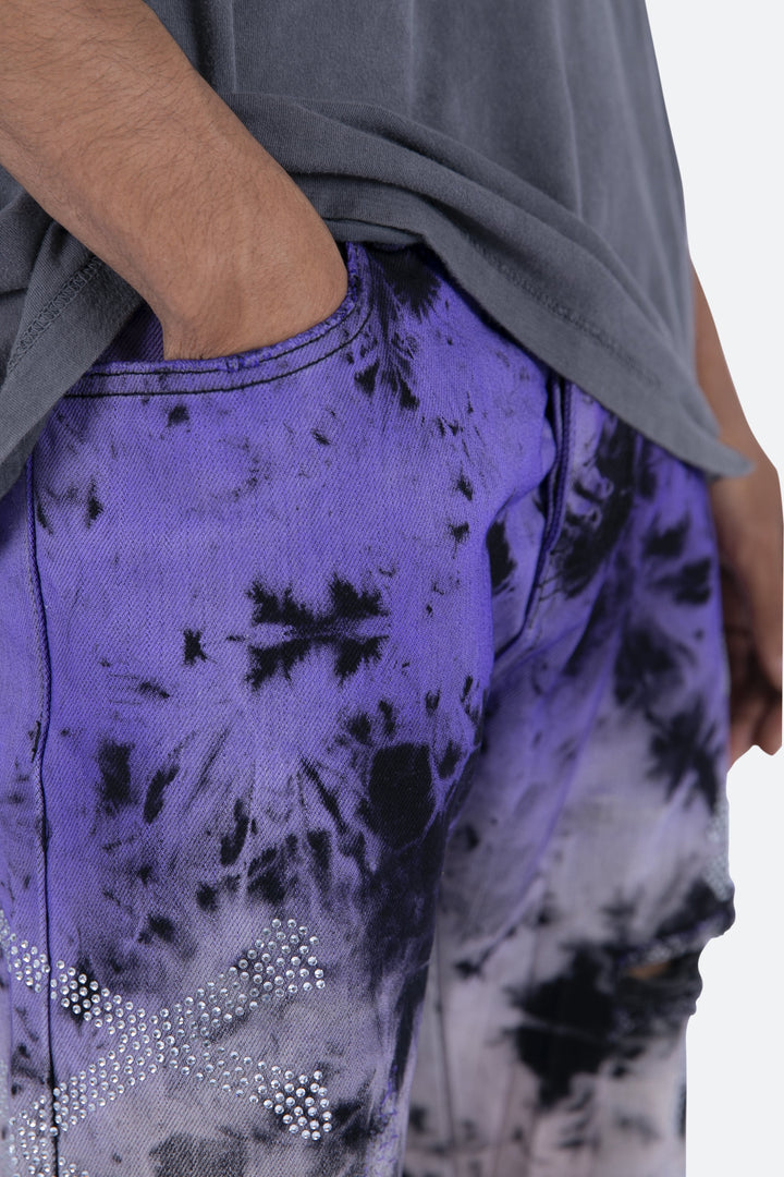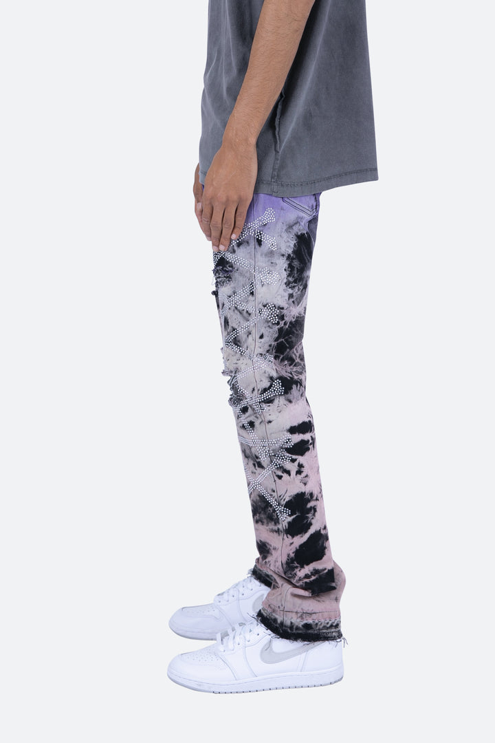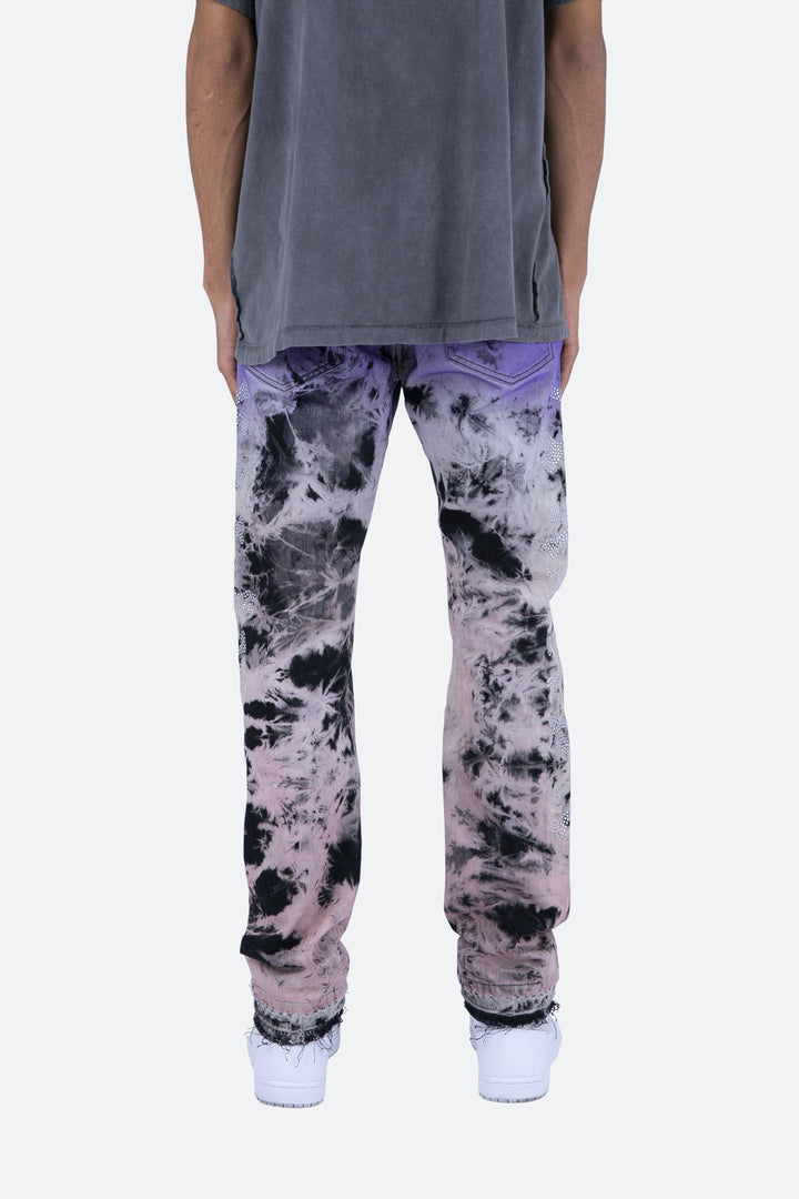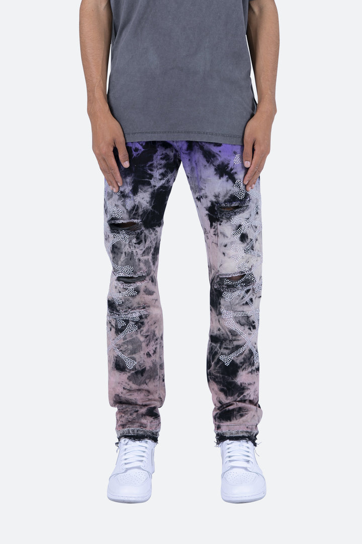 the D208 Dyed Bones Denim is designed with our new D fit which is relaxed throughout with an extended inseam for stacking and features bone artwork in rhinestones on the outseam of both legs and is constructed from tie-dyed denim with a fade from purple to white.