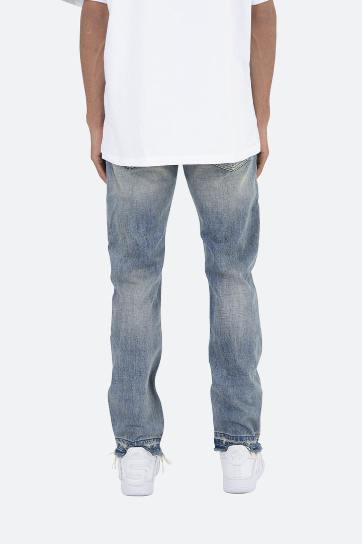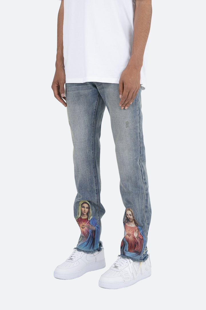 the D241 Denim is designed with our new D fit which is relaxed throughout with an extended inseam for stacking and full color religious heat press artwork at the leg opening and finished with an unconstructed hem.