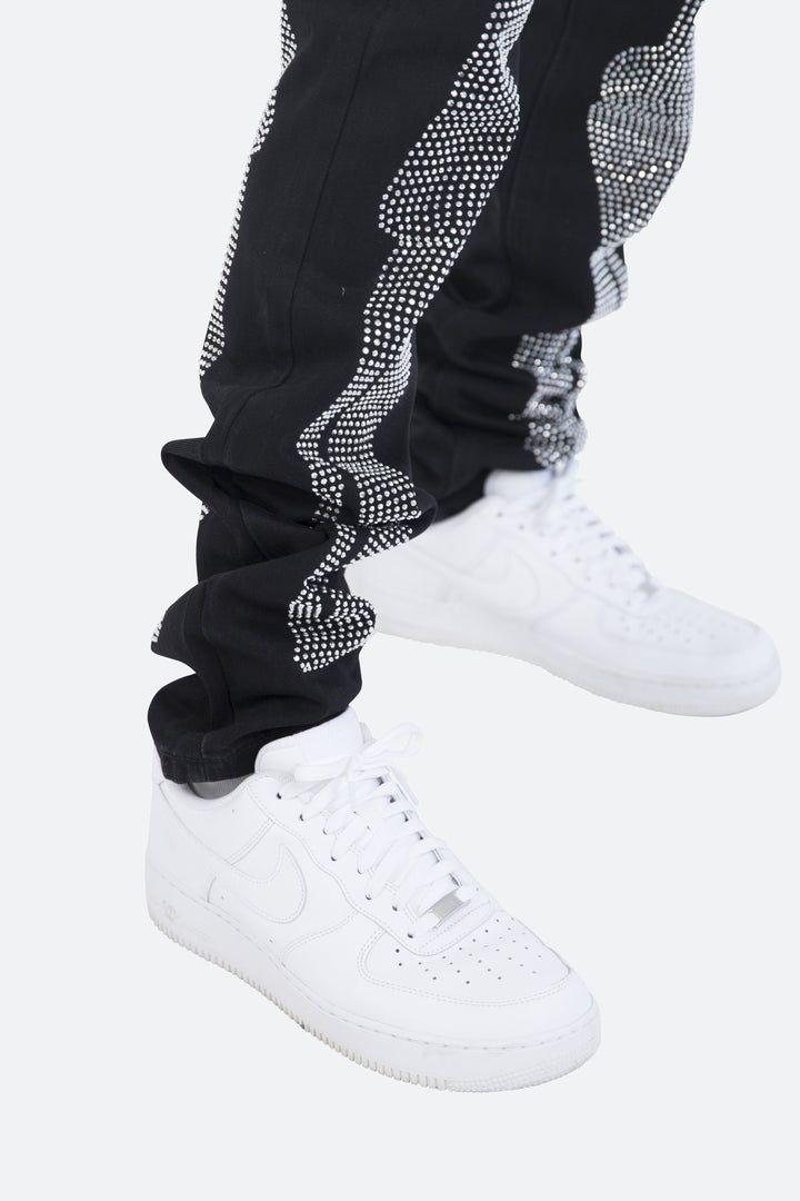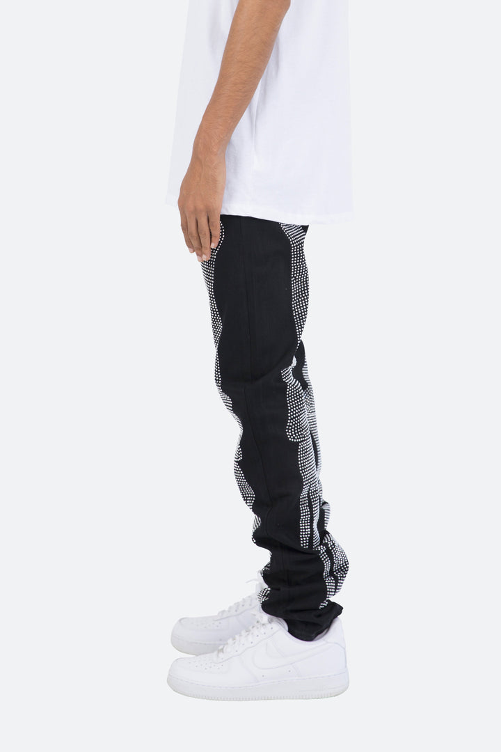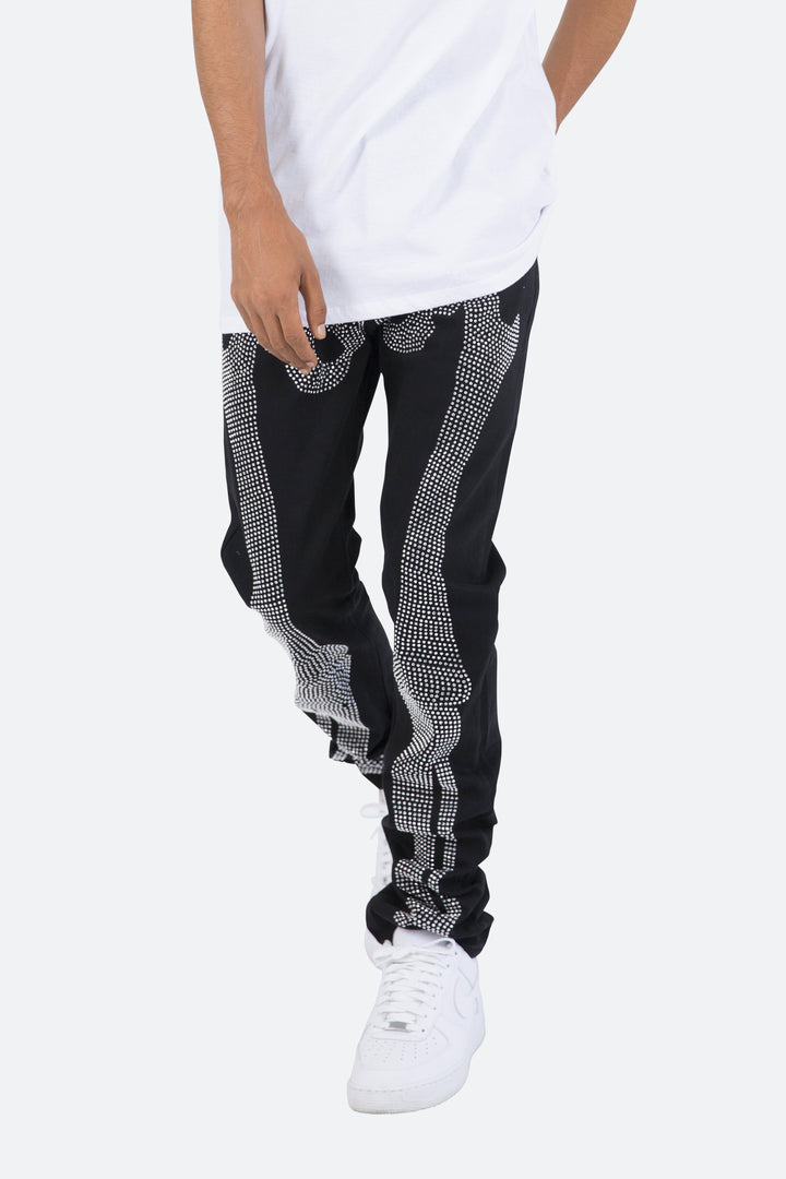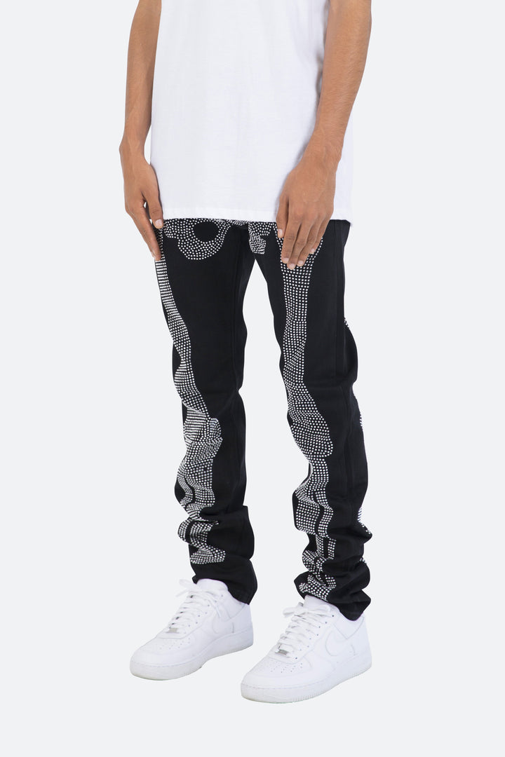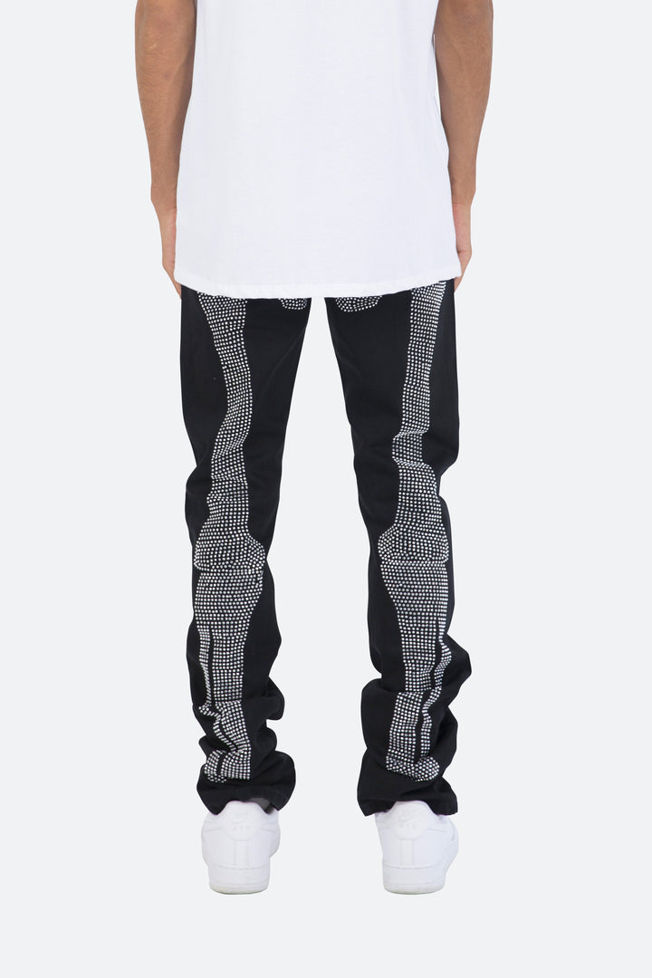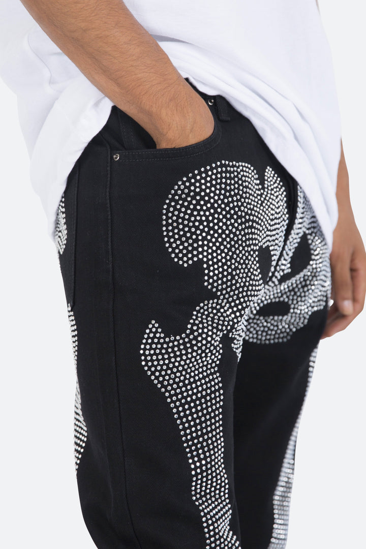 the D249 Skeleton Denim is designed with our new D fit which is relaxed throughout with an extended inseam for stacking and features skeleton artwork in rhinestones on both legs and is constructed from black denim with a raw leg opening.