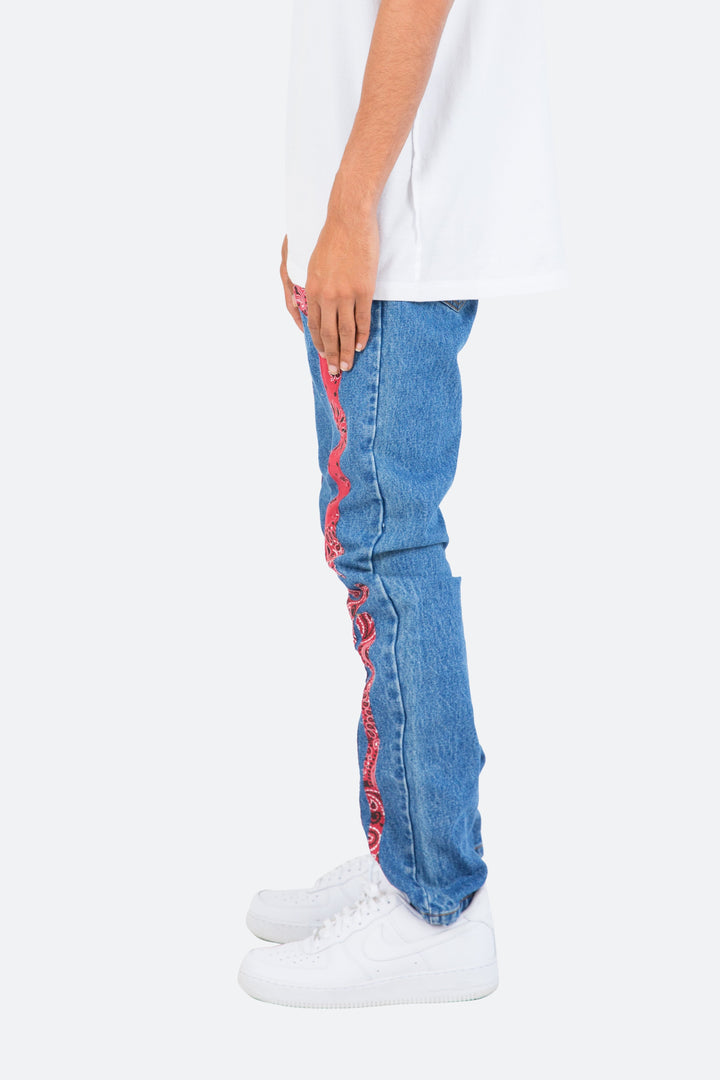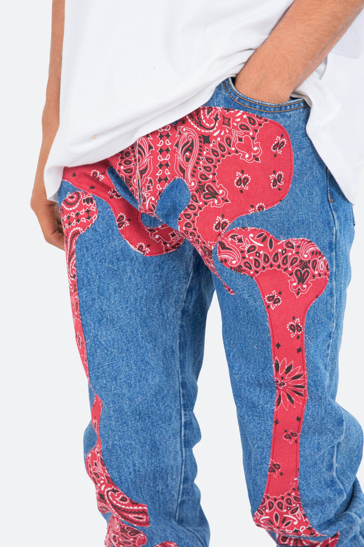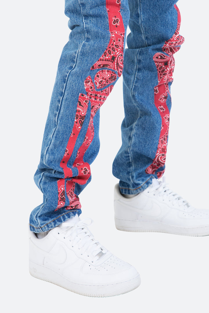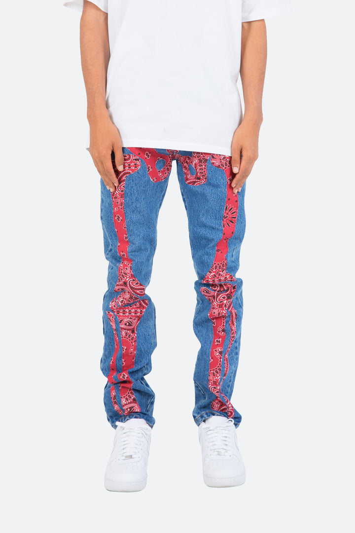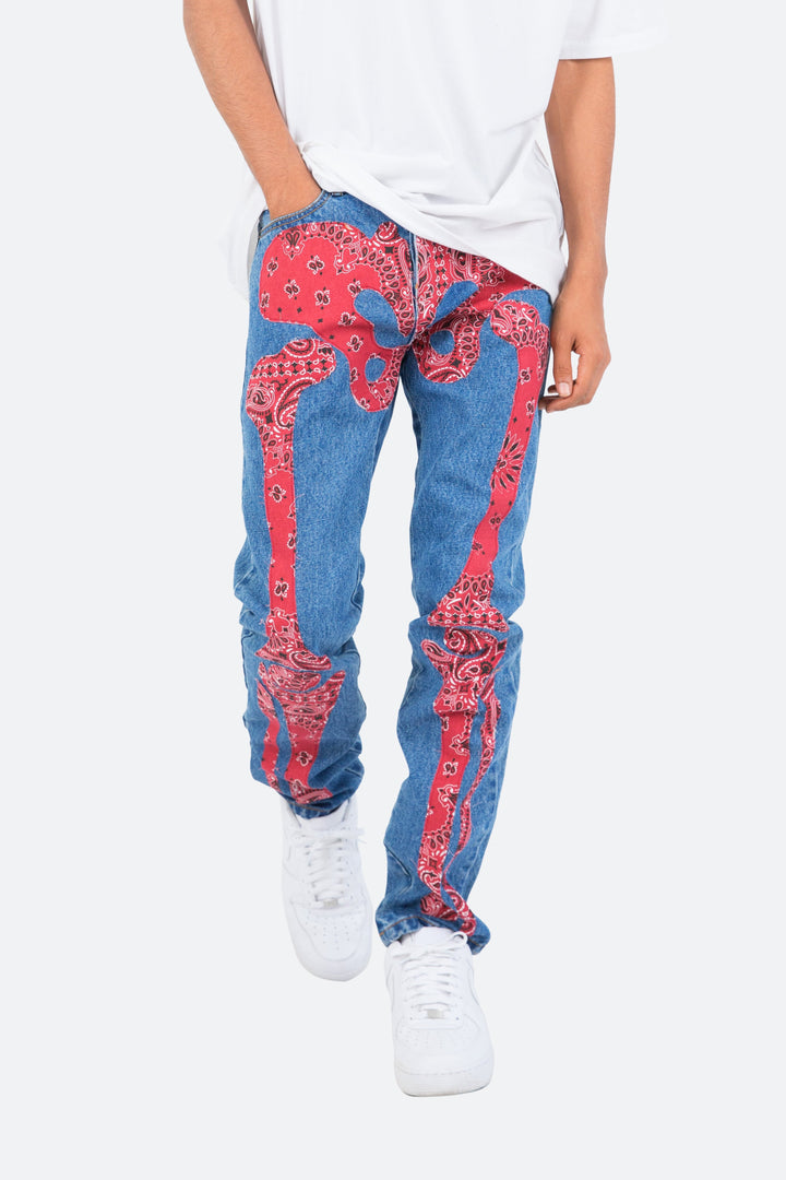the D261 Skeleton Denim is designed with our new D fit which is relaxed throughout with an extended inseam for stacking and features sewn-on skeleton artwork in a paisley print on both legs and is constructed from medium wash denim with a raw leg opening.
