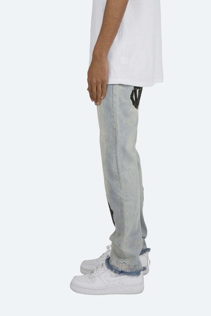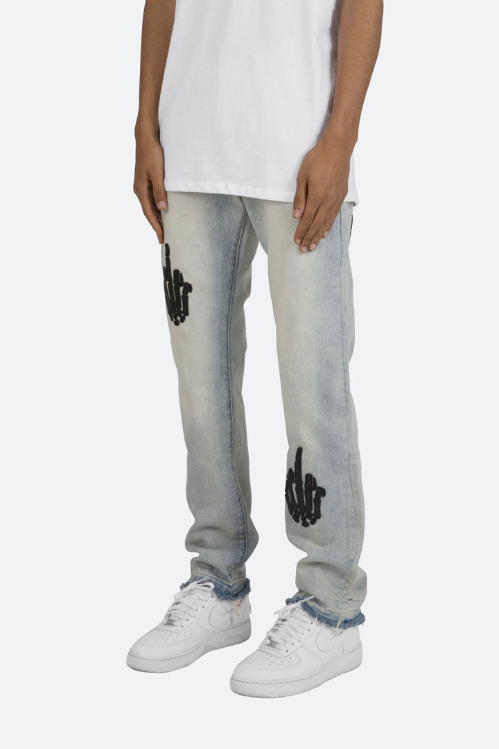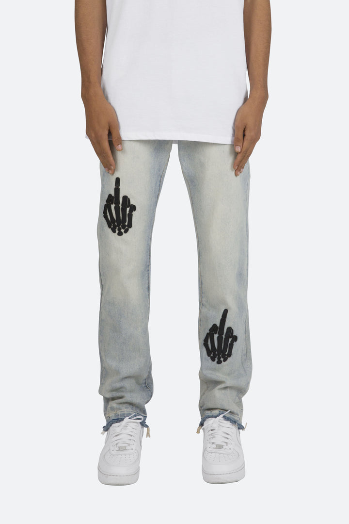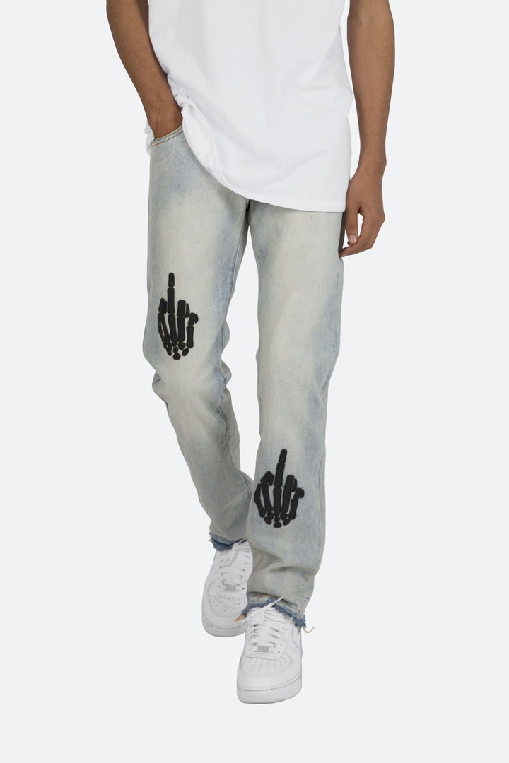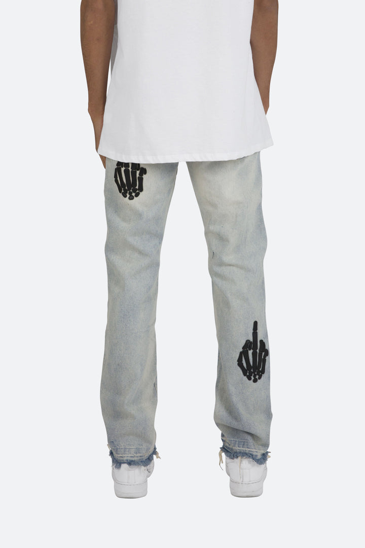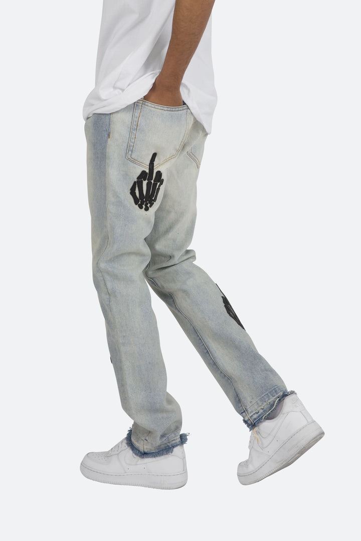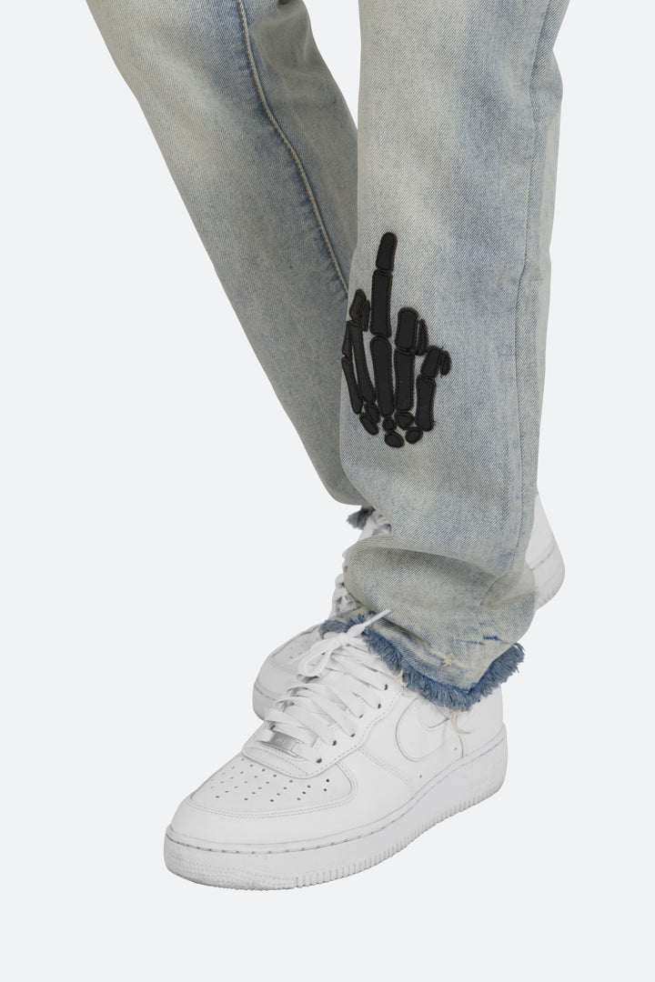 the D272 Skeleton Denim is designed with our new D fit which is relaxed throughout with an extended inseam for stacking and features a warm, light wash, with whiskering and sanding throughout, and finished with poly-leather skeleton appliques throughout.