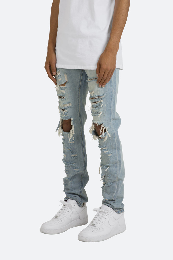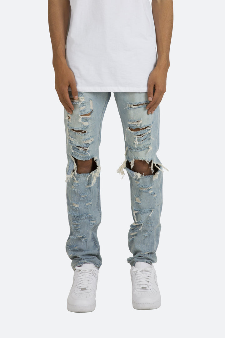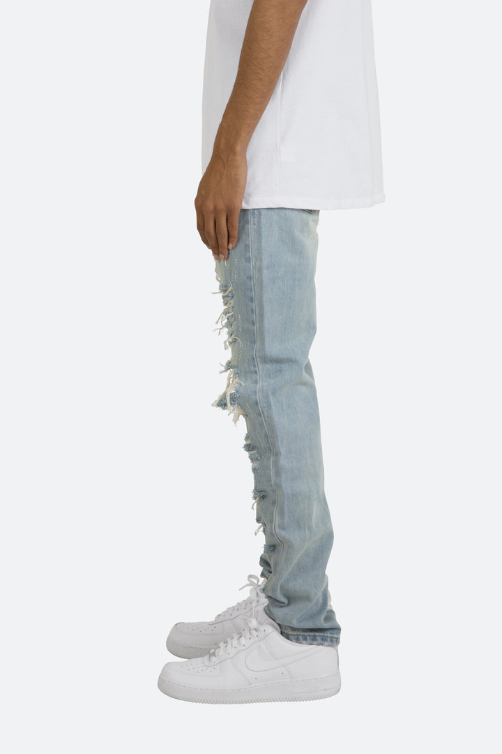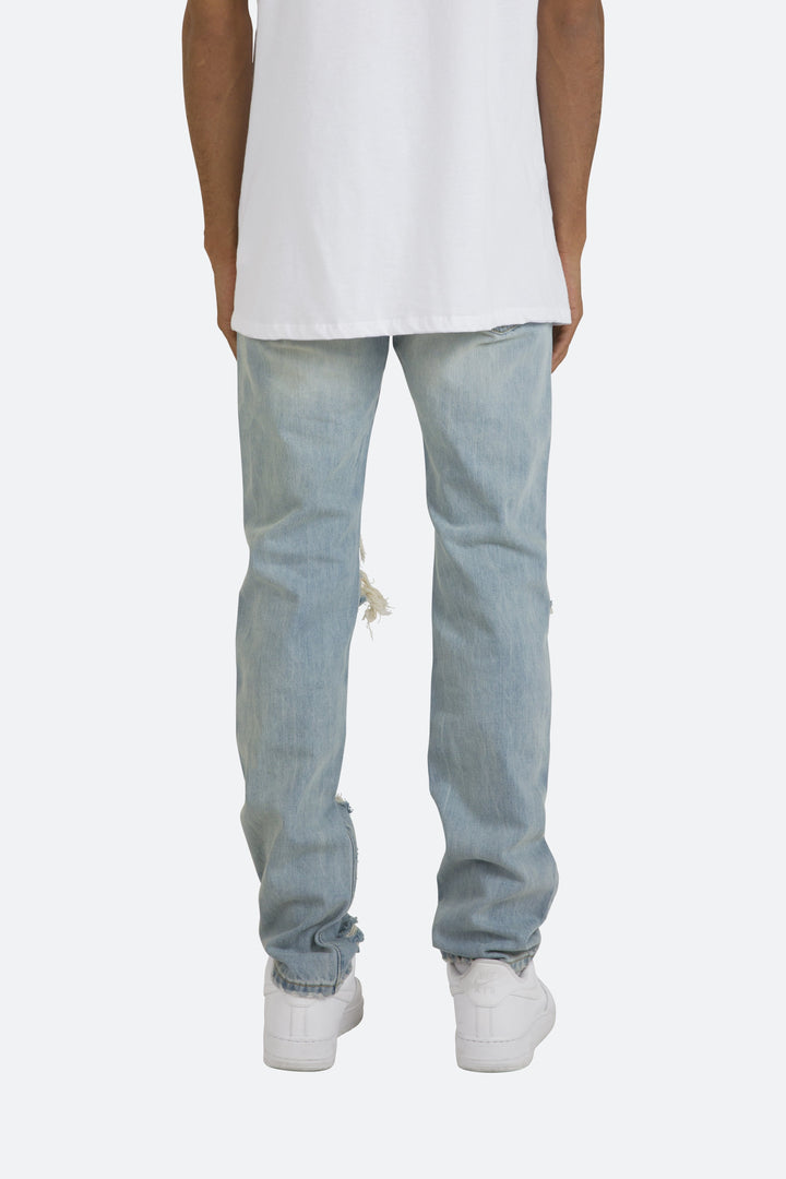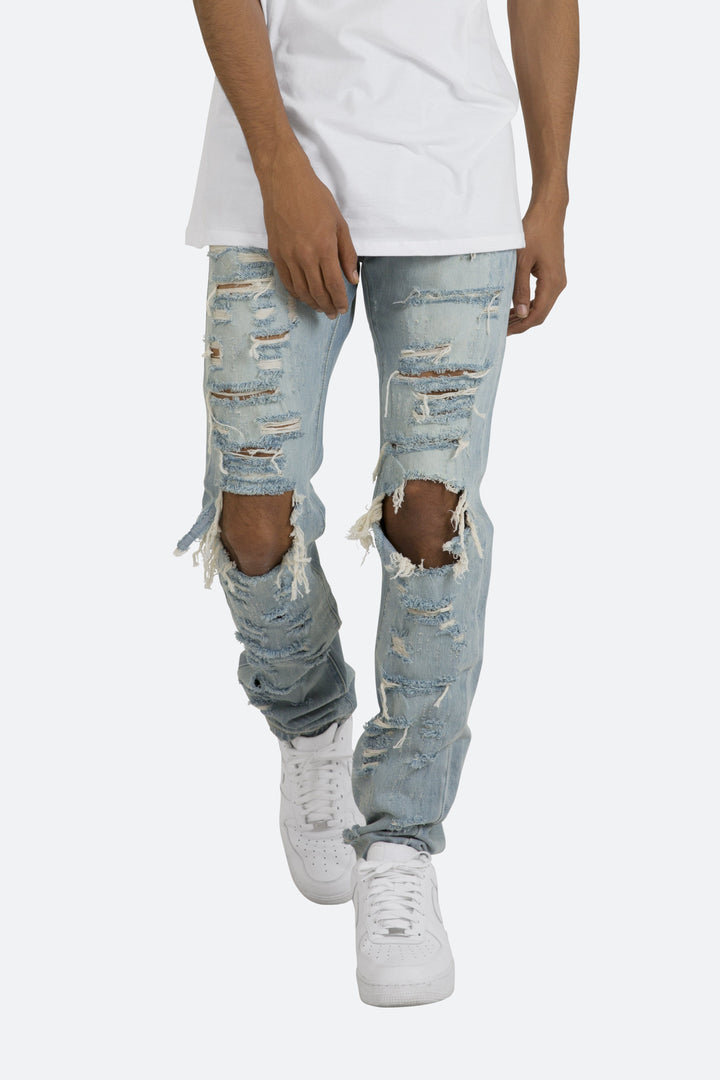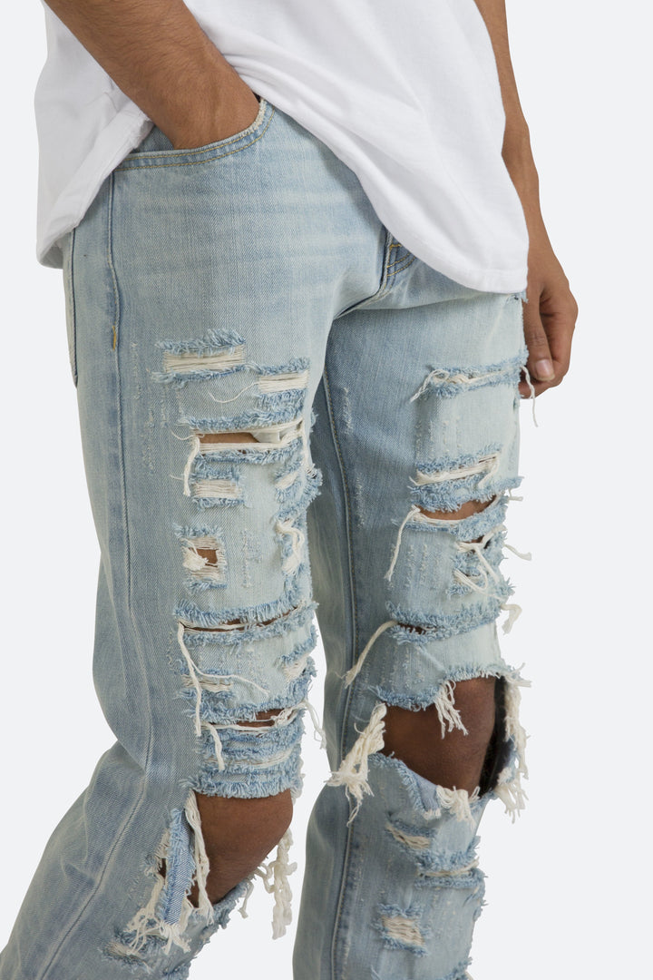 the D275 Denim is designed with our new D fit which is relaxed throughout with an extended inseam for stacking and features a medium vintage wash with distressing throughout.