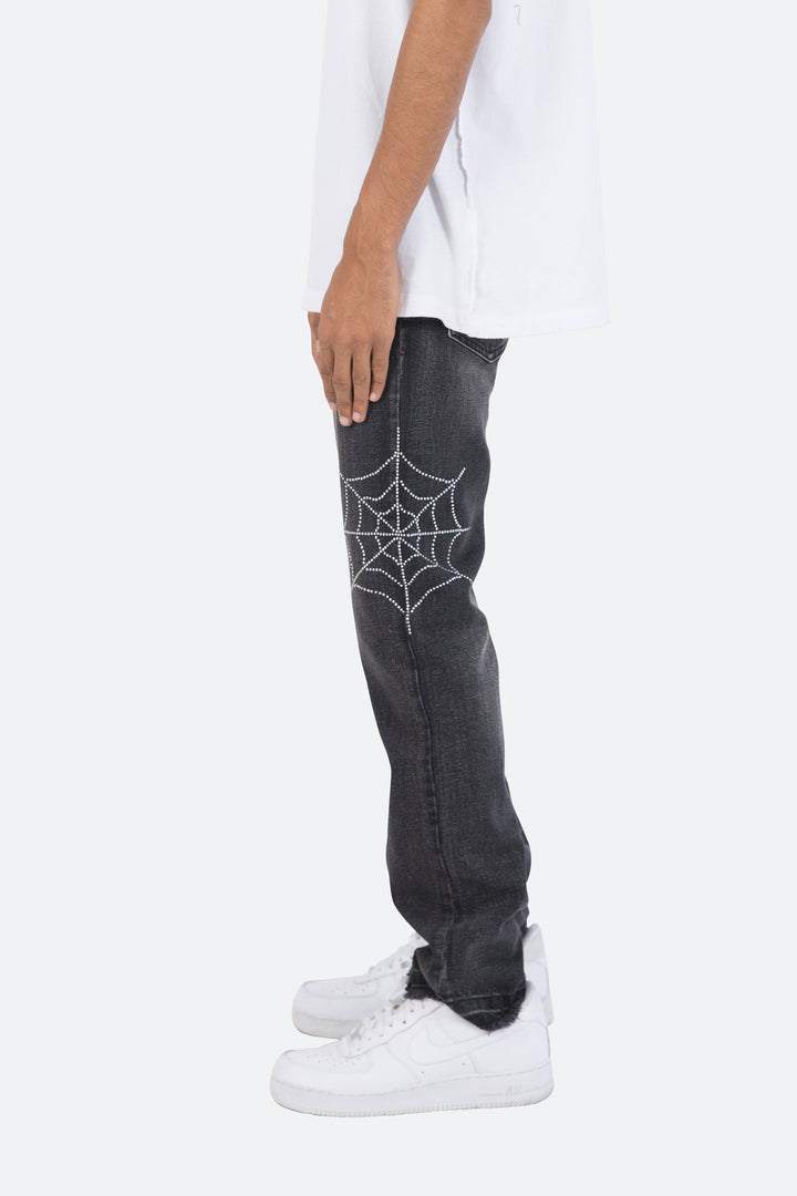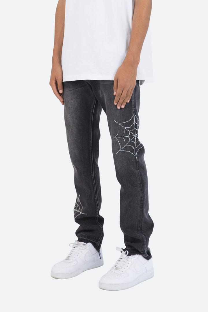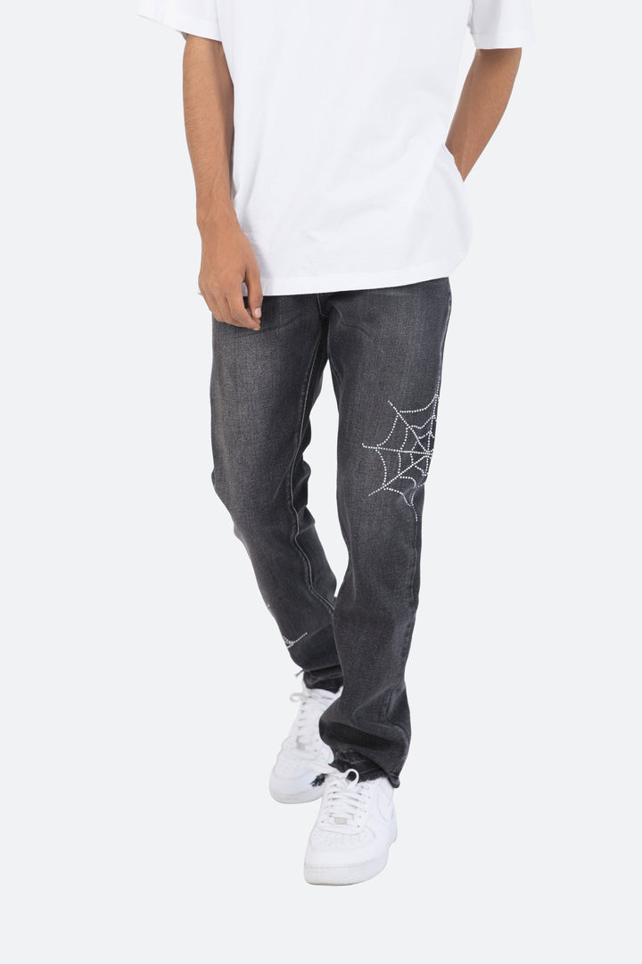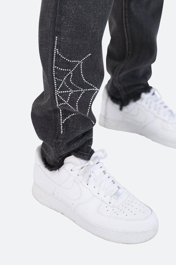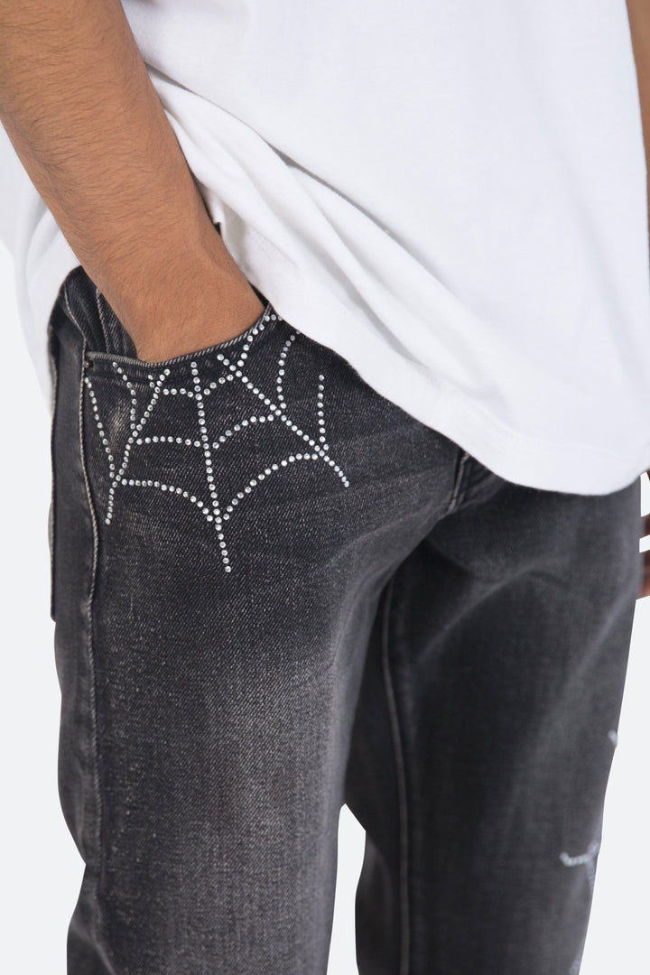 the D278 Spider Denim is designed with our new D fit which is relaxed throughout with an extended inseam for stacking and features spider web artwork in rhinestones on both legs and is constructed from black denim with a raw leg opening.