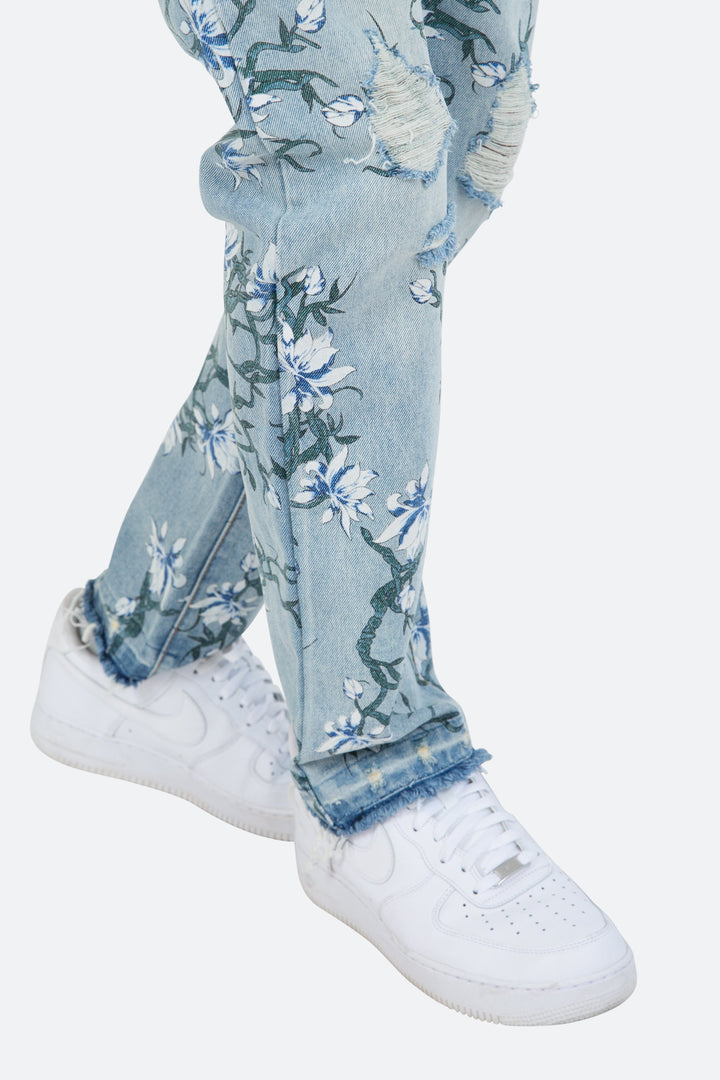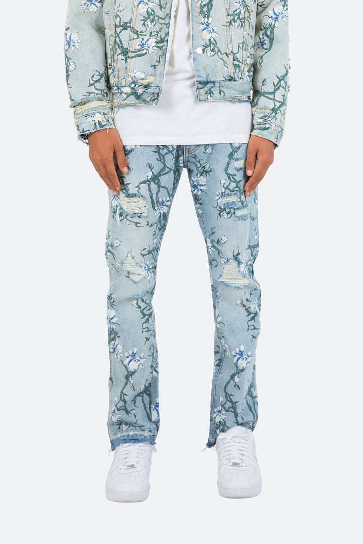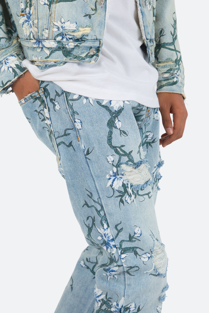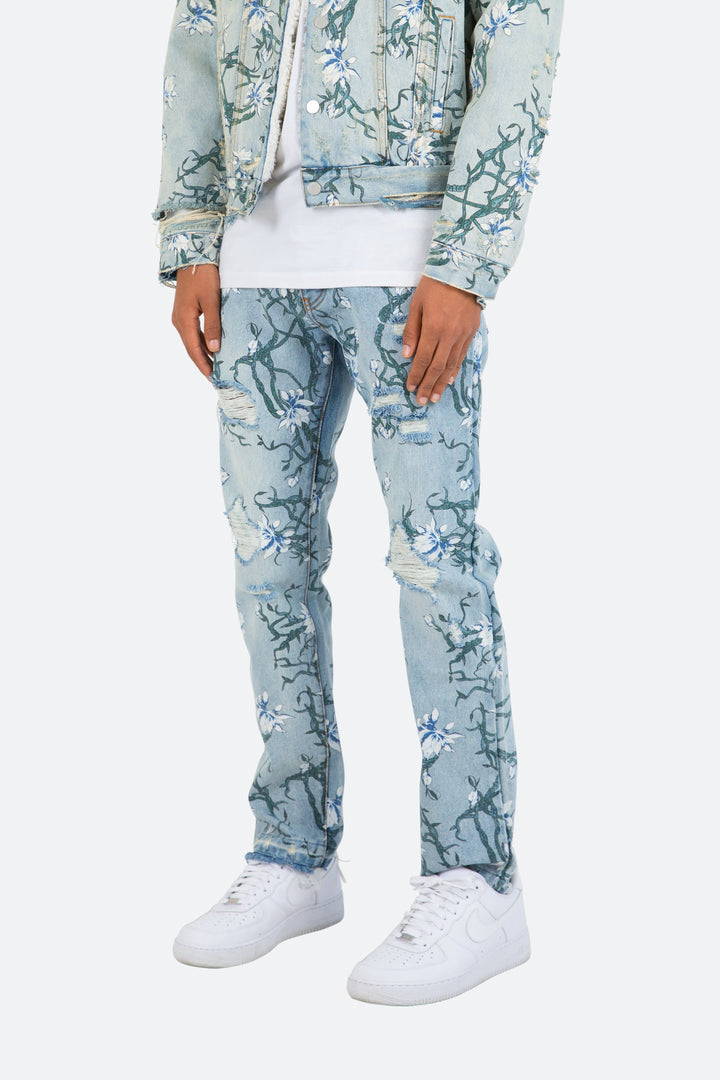 the D282 Denim is designed with our new D fit which is relaxed throughout with an extended inseam for stacking and features a light wash, and finished with an all-over print thorn graphic.