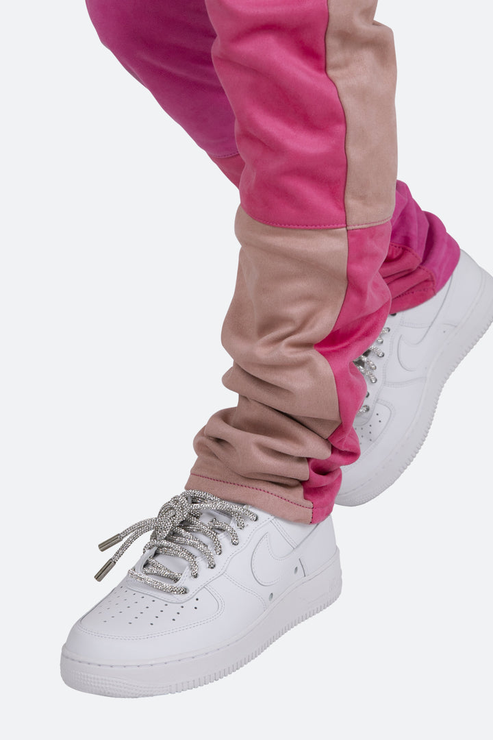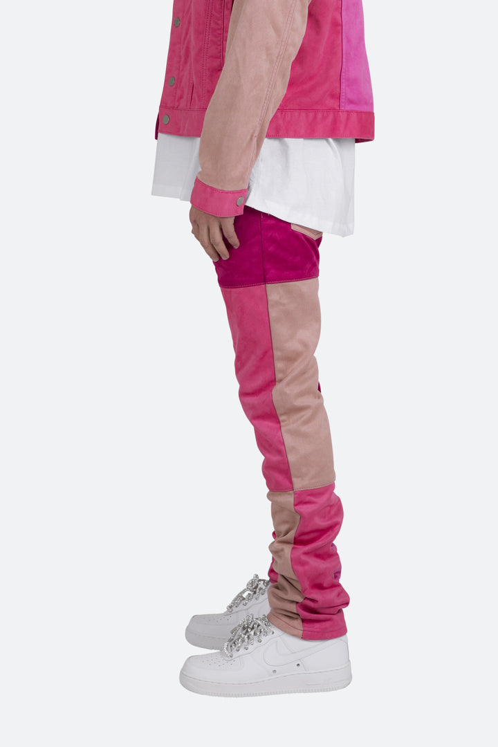 the D354 Patchwork Denim is designed with our new D fit which is relaxed throughout with an extended inseam for stacking and is constructed from patchwork faux suede fabric in multiple pink tones.