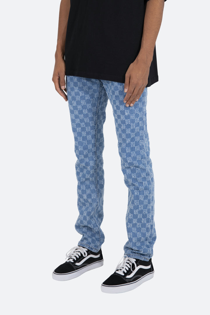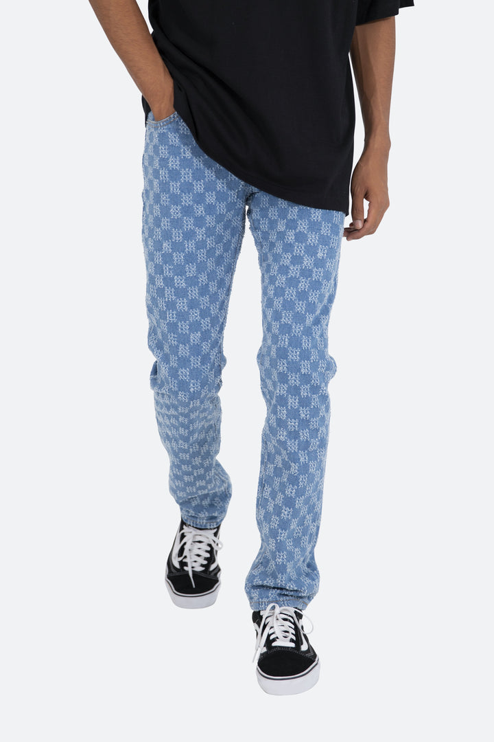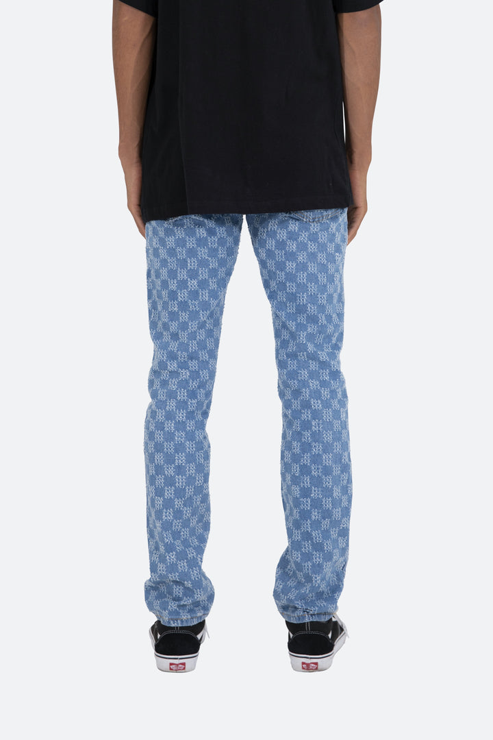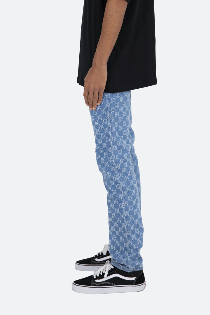 the D407 Checker Denim is designed with our new D fit which is relaxed throughout with an extended inseam for stacking and features a medium wash, and finished with jacquard checkerboard pattern in the fabric.
