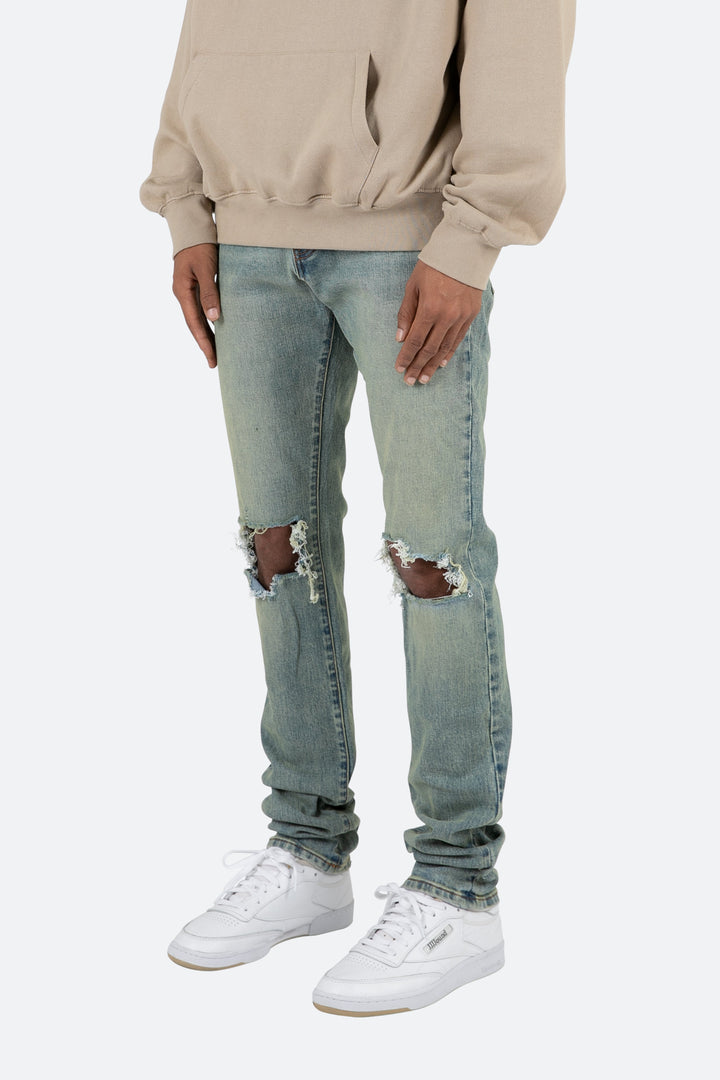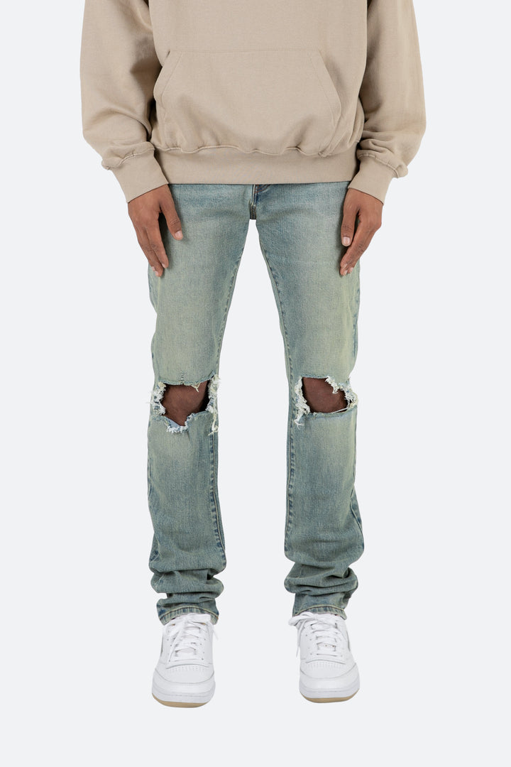 the D441 Denim is designed with our new D fit which is relaxed throughout with an extended inseam for stacking and features a warm, light wash, distressing at the knees, and finished with whiskering and sanding throughout.