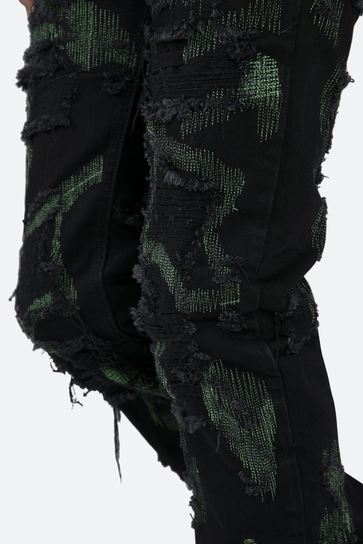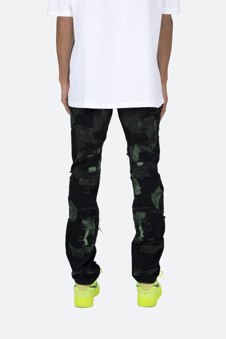 the D456 Repaired Denim is designed with our new D fit which is relaxed throughout with an extended inseam for stacking and features a vintage washed black denim, and finished with green stitched repair details throughout.