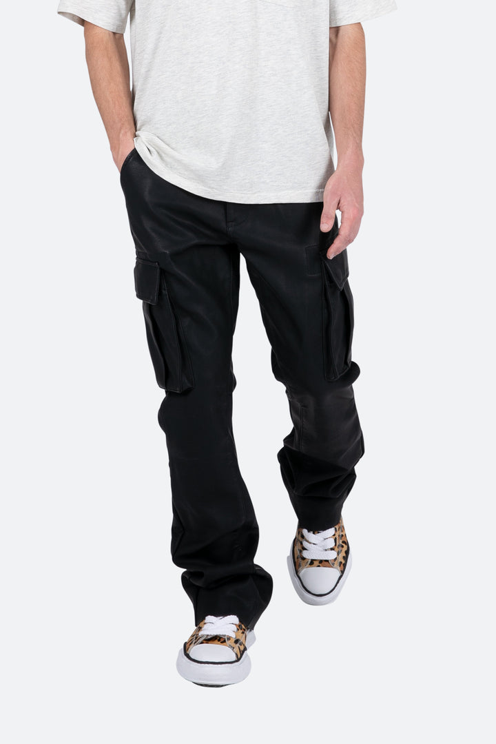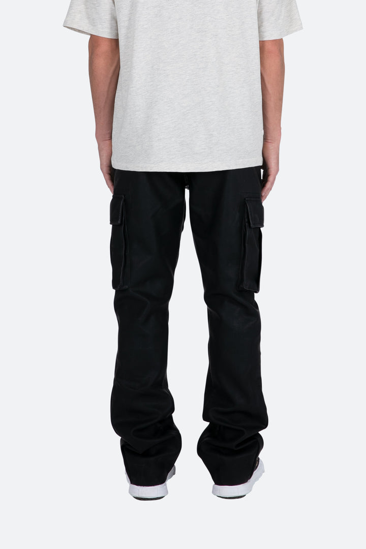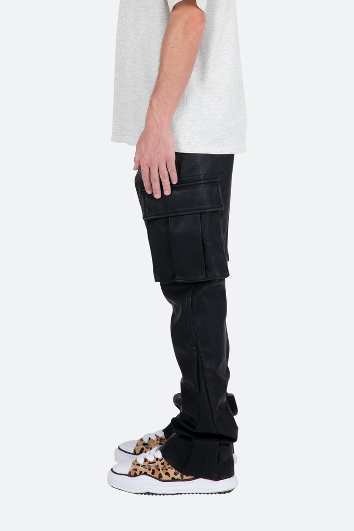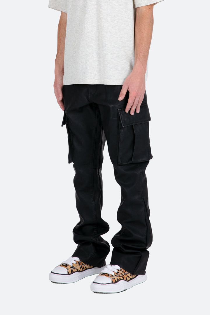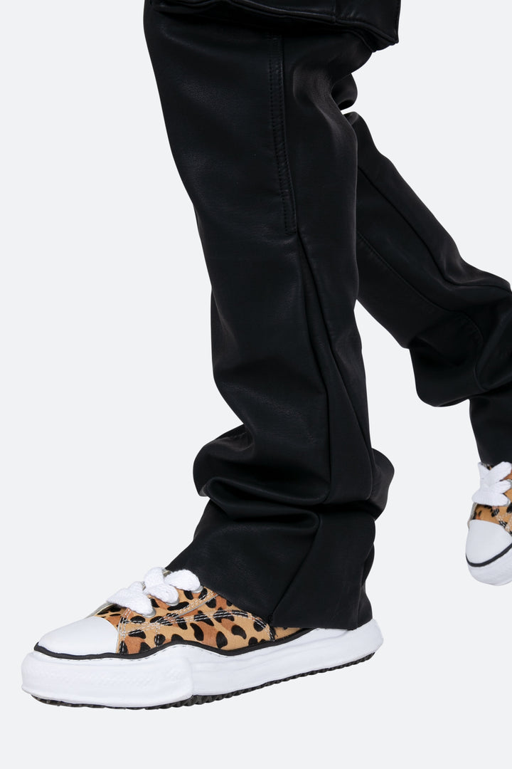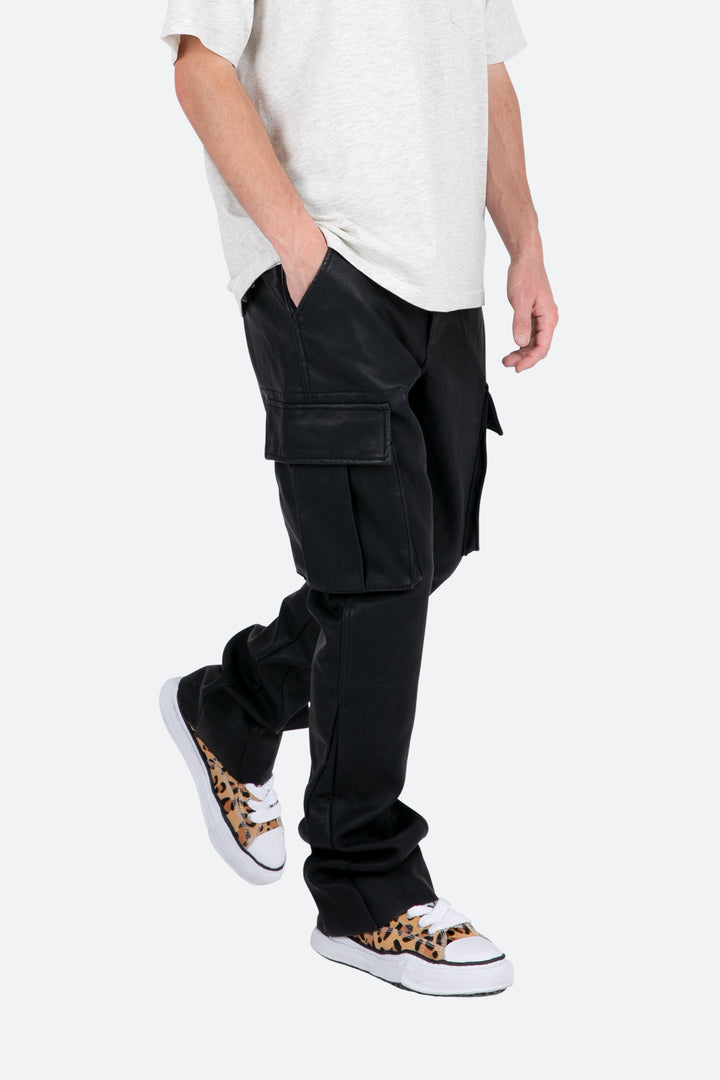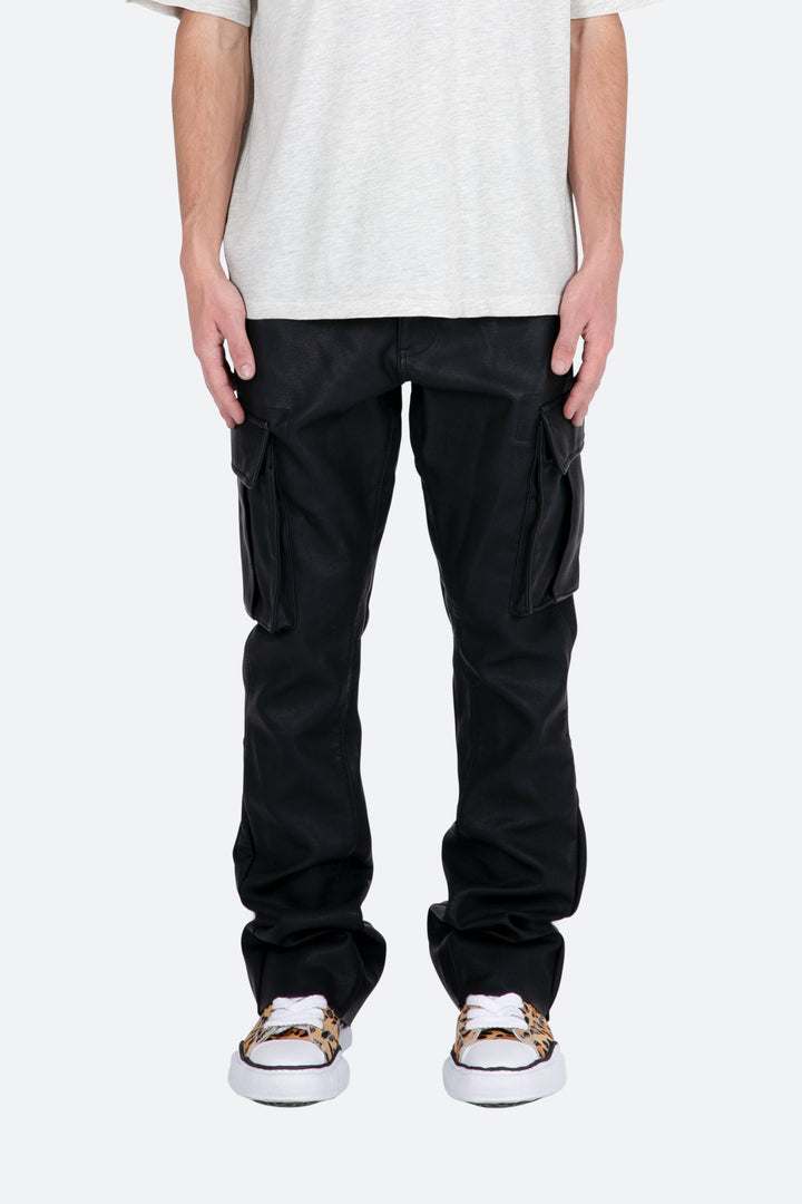 the B449 Leather Cargo Flare Denim are designed with our new B fit, which is slim through the thigh and features a slight flare at the leg opening and is constructed from poly leather fabric, panelling at the inseam and outseam from self fabric for a slight flare, a deconstructed hem, and finished with cargo pockets at the thigh.