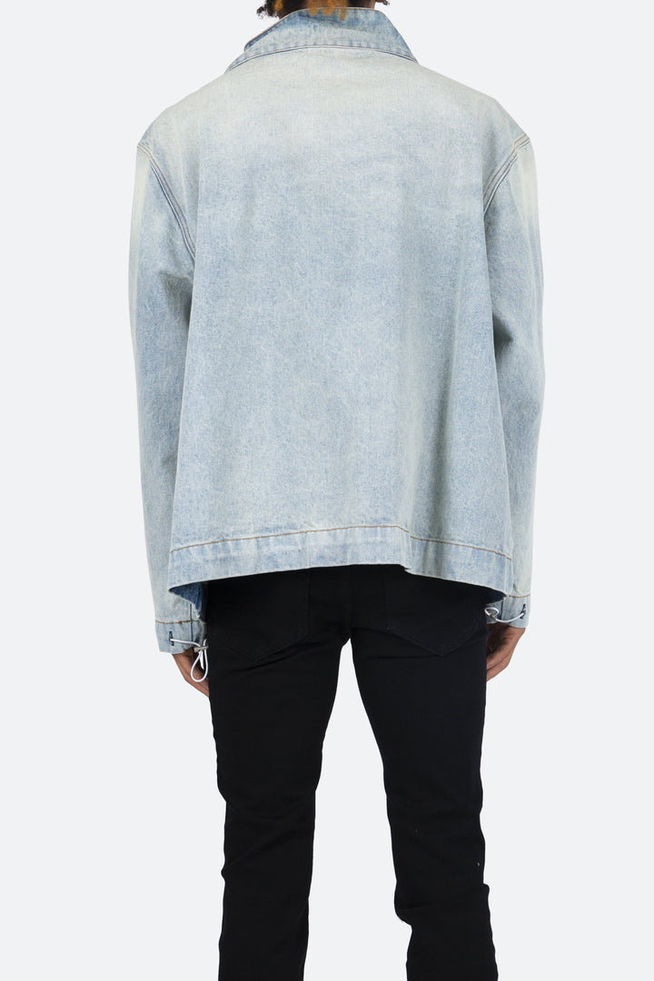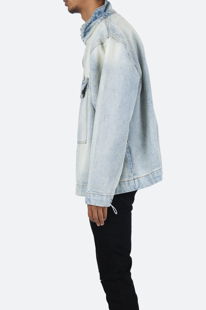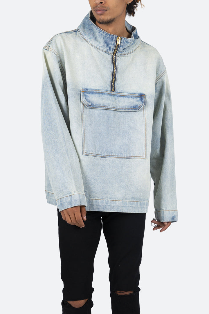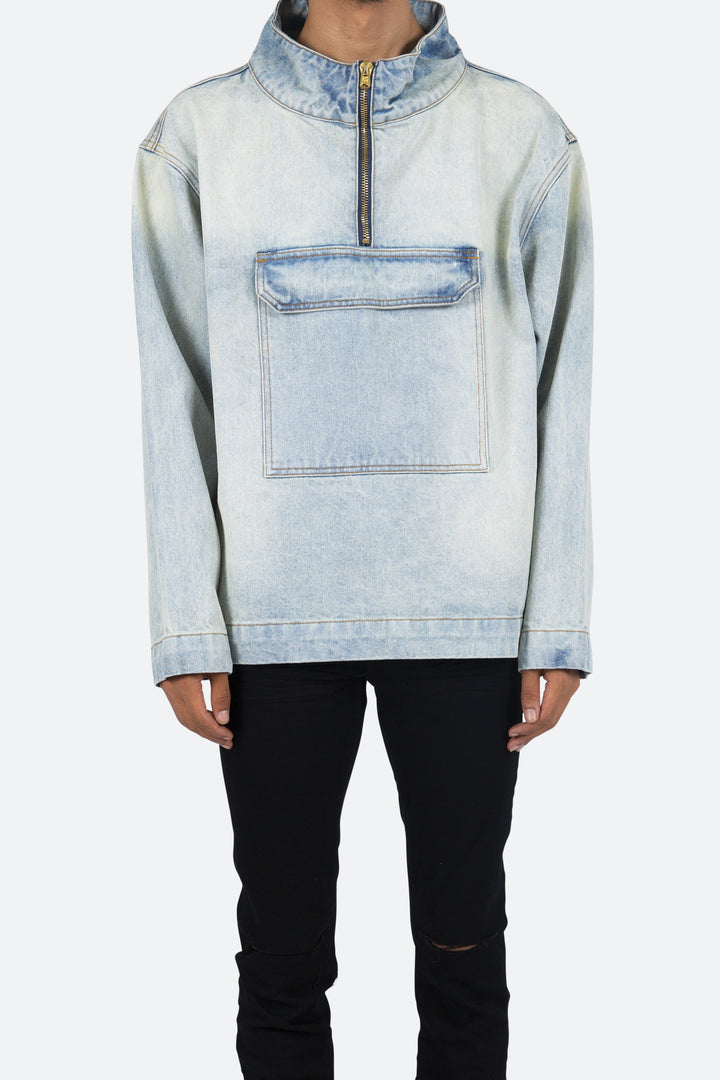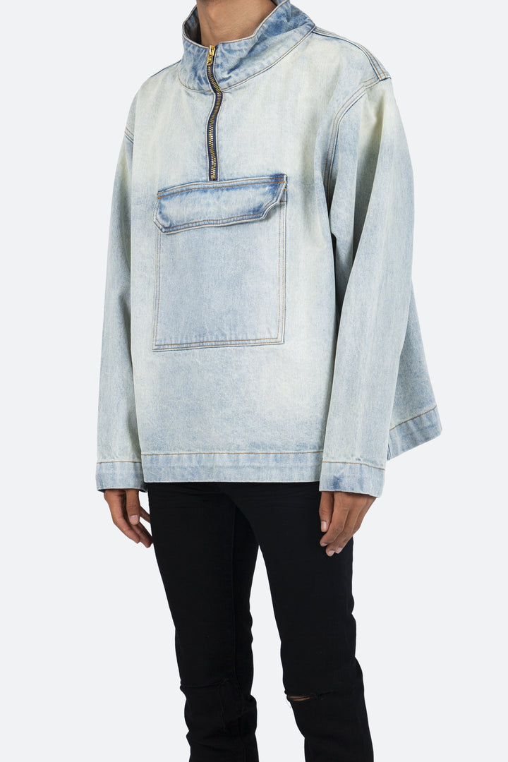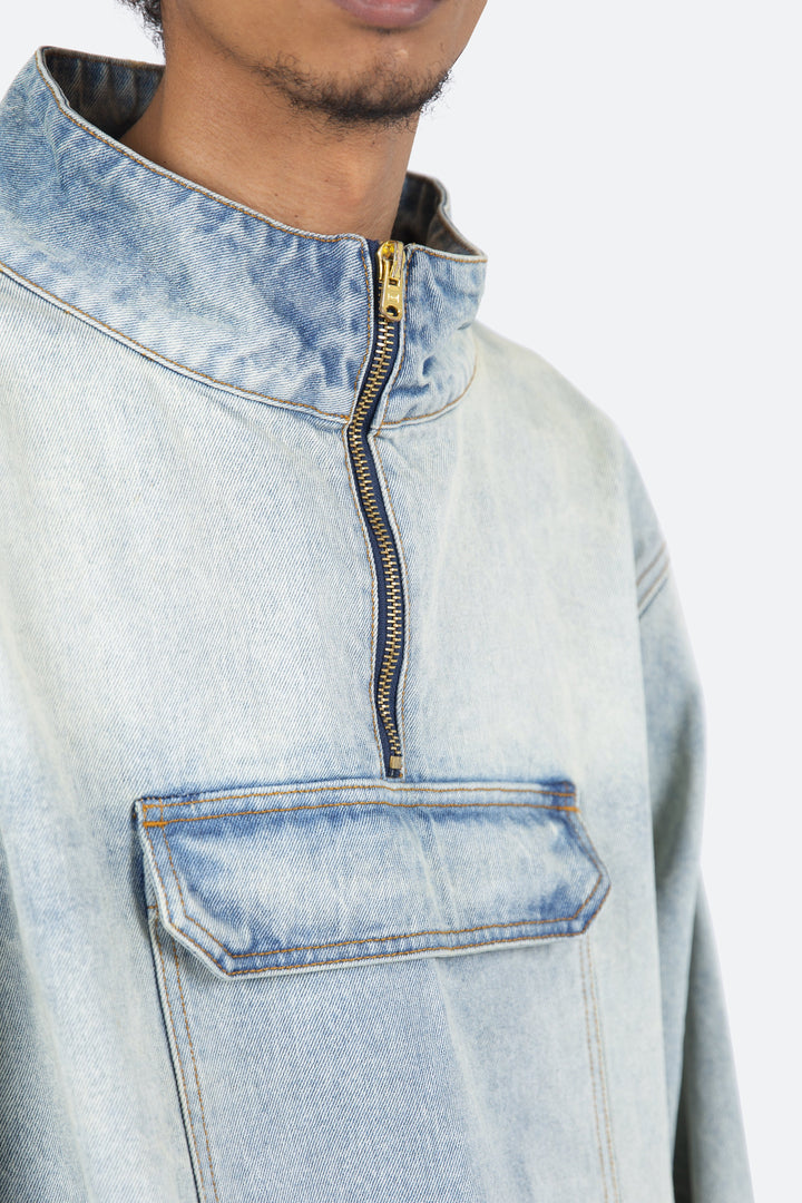 the Denim Pullover Jacket is designed with a relaxed fit and features a cropped body, extended sleeves, half zip at the chest, and finished with elastic cinch at the sleeve and waist.