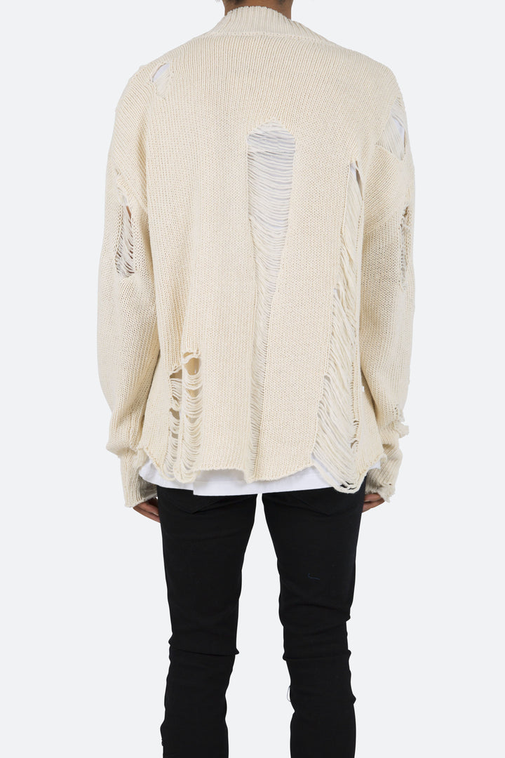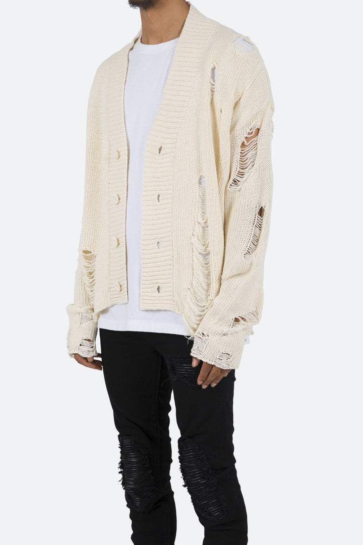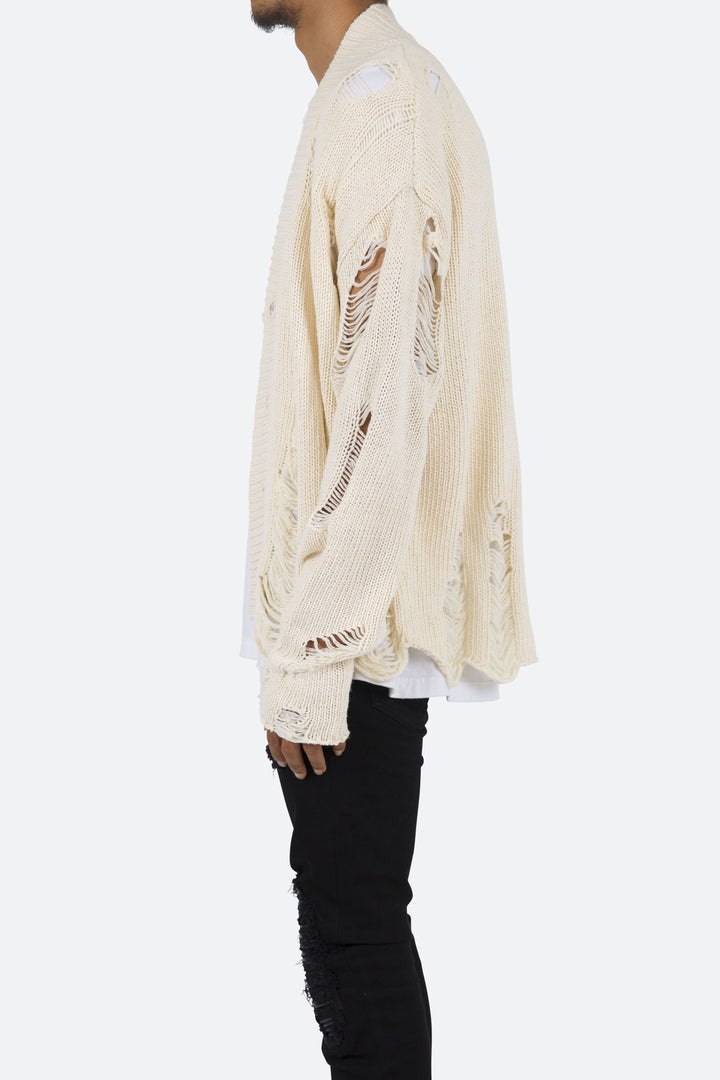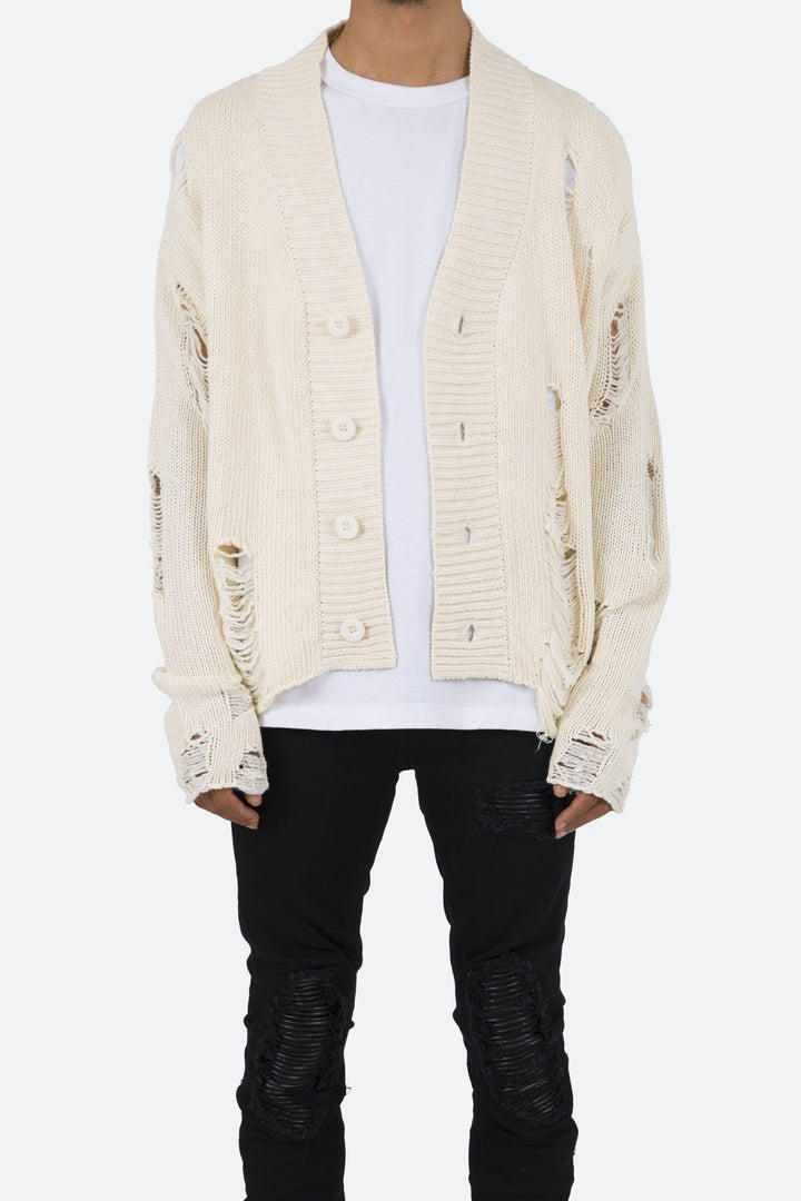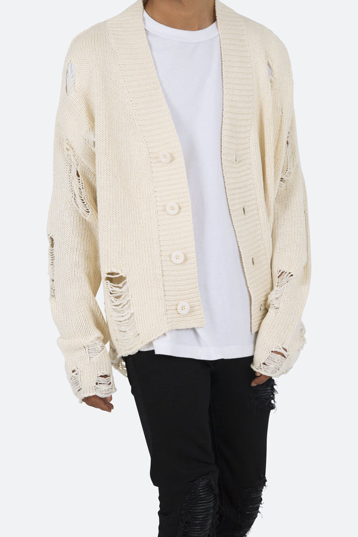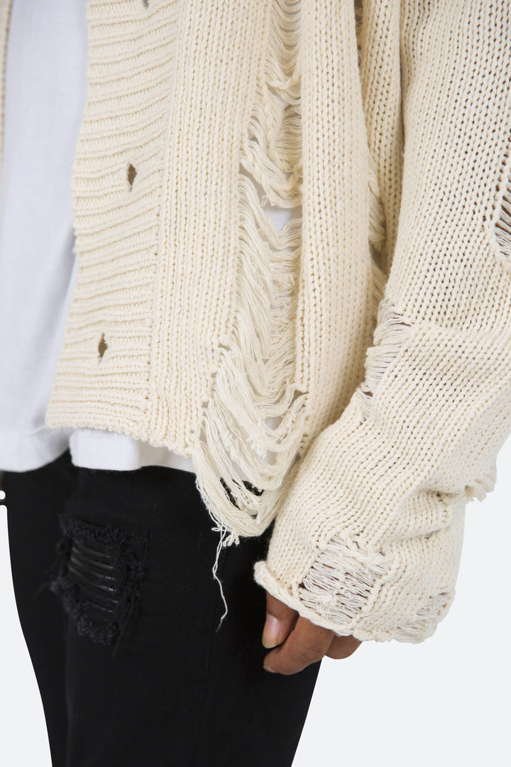 the Distressed Cardigan is a custom knit sweater that is constructed from acrylic and features a button placket and is finished with runs and distressing throughout.