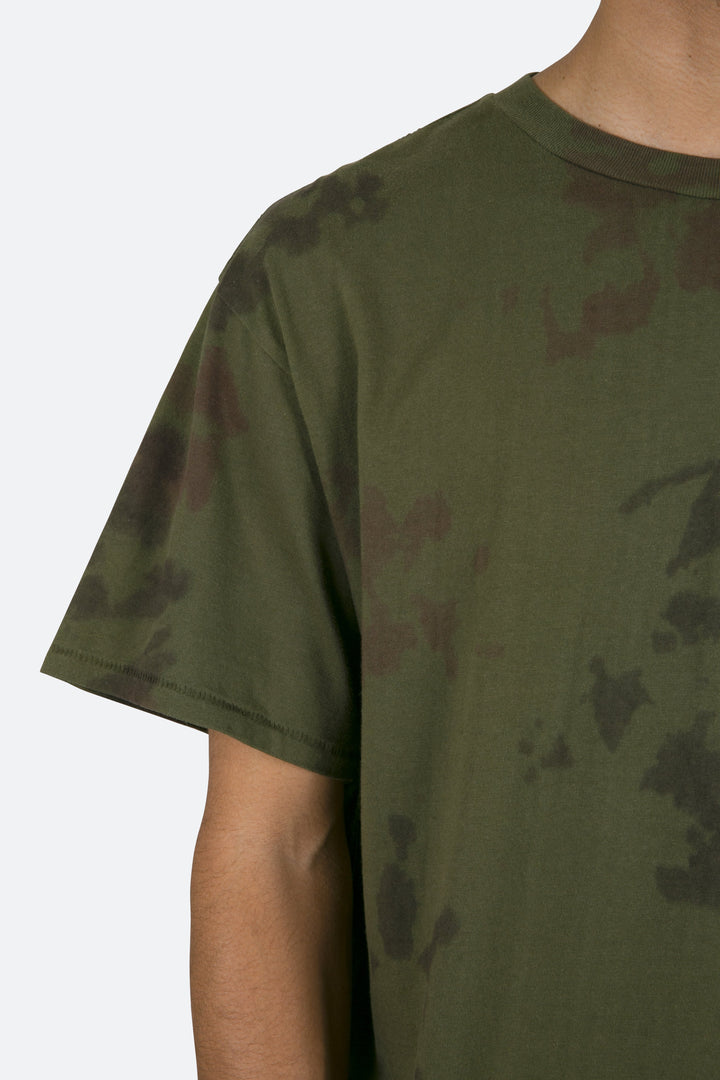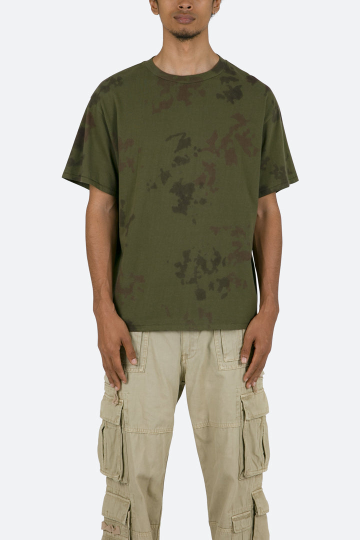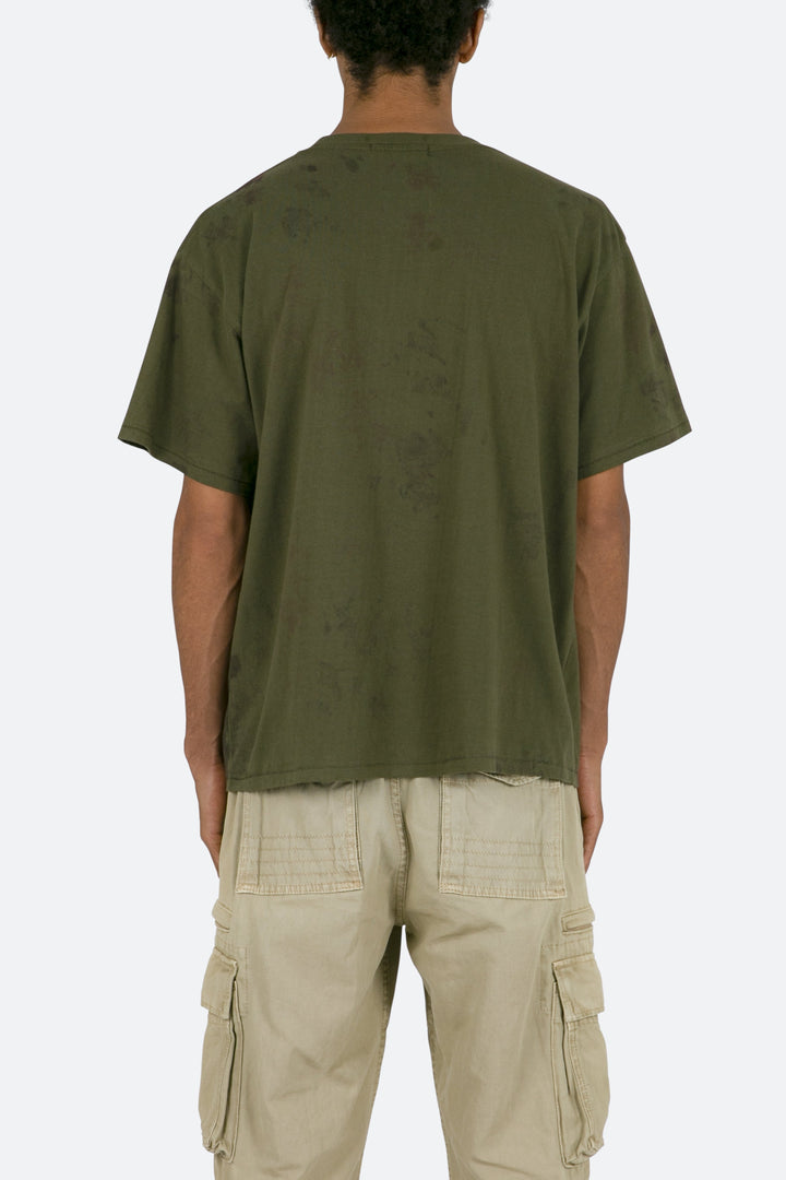 the Drab Tee features a flat hem line and an extended shoulder seam for a relaxed, dropped shoulder fit, constructed from a washed cotton fabric, and finished with multi colored dye details throughout