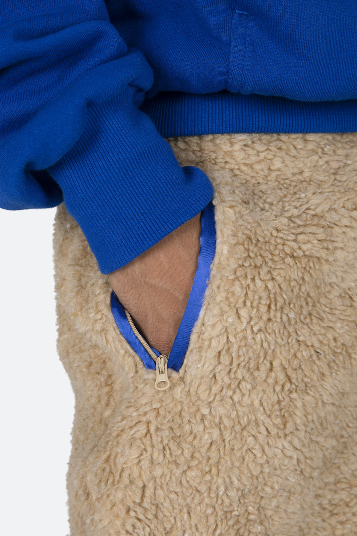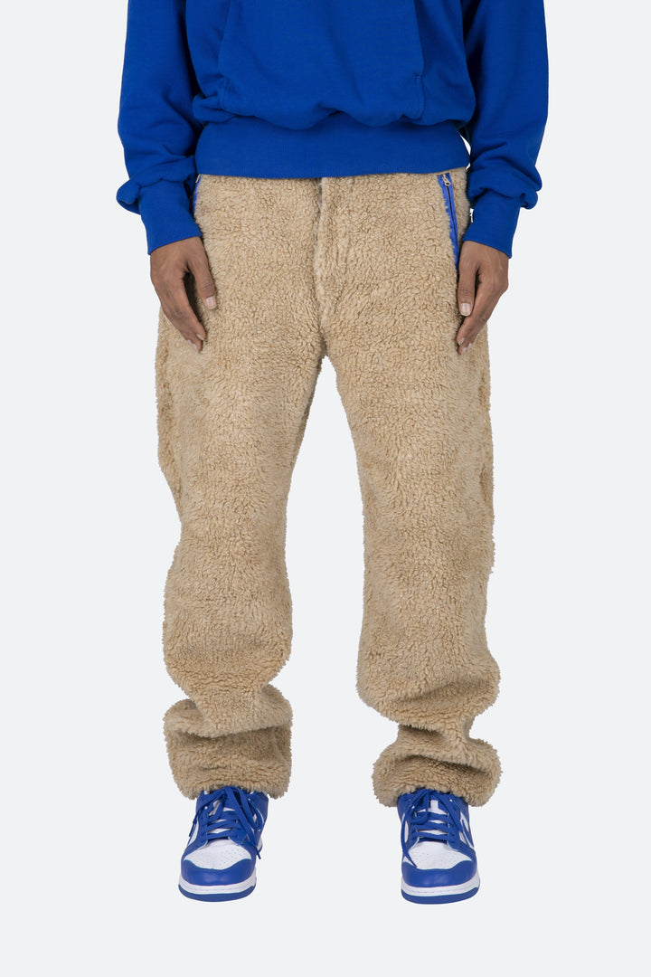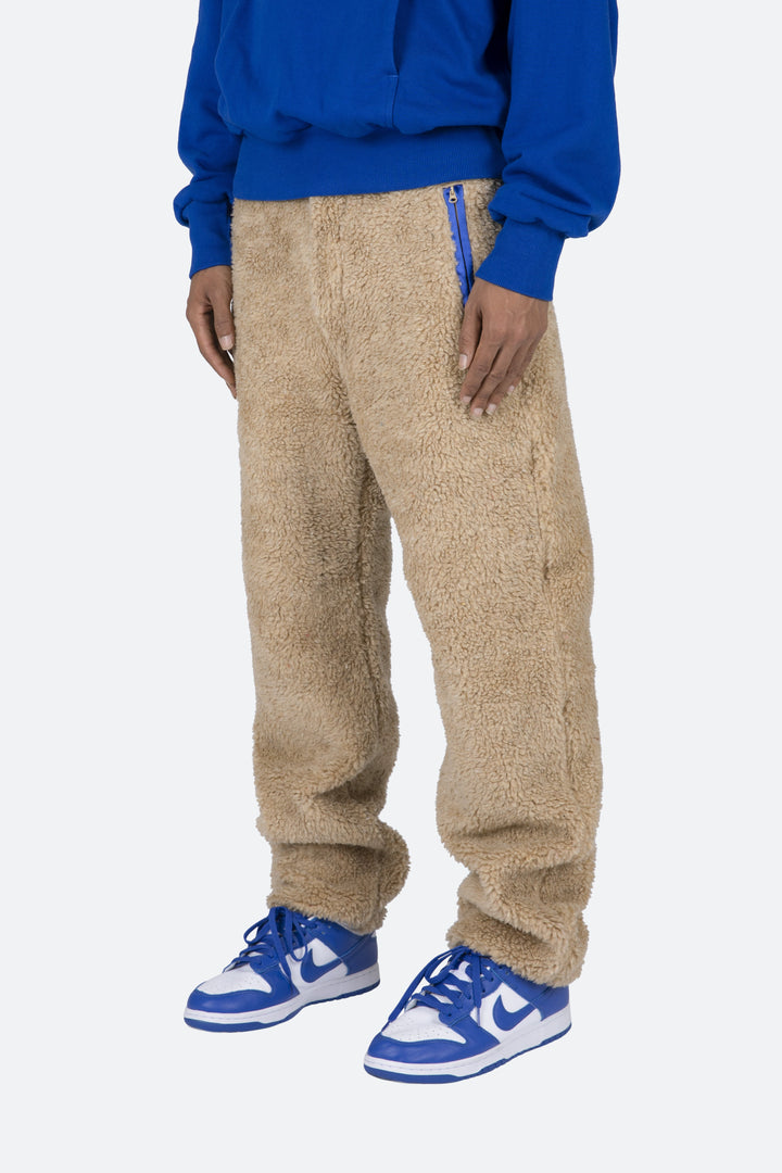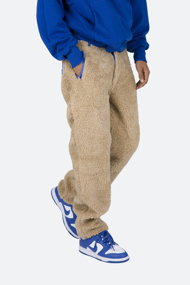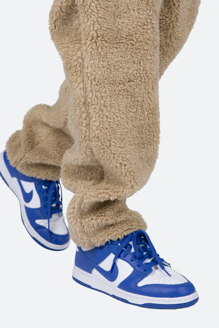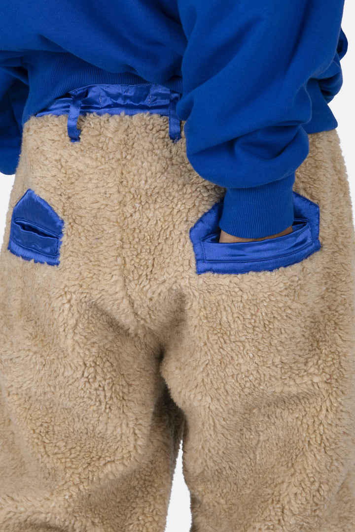 the Faux Fur Pants are designed with a baggy, relaxed fit throughout, featuring a contrasting blue satin waistband, belt loops, and plackets at the pockets, welt pockets, and constructed from a washed sherpa fabric.