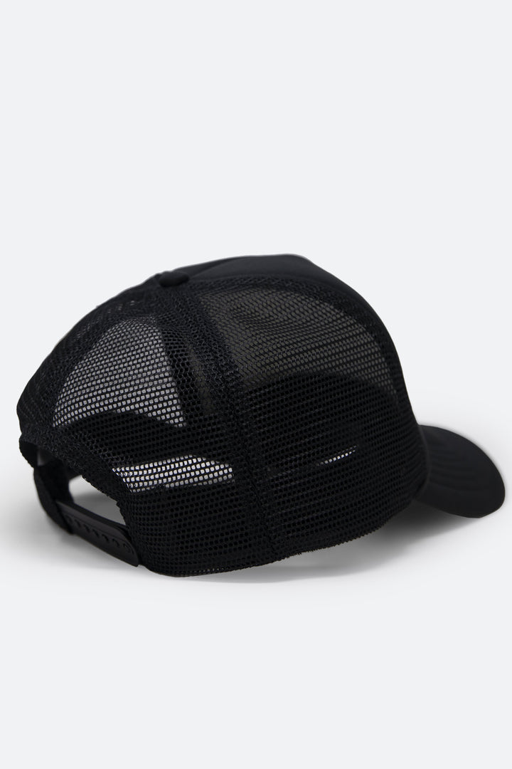 the Fear City Trucker Cap is constructed from a neoprene front panel and brim, mesh back, and finished with a screenprint at the front.