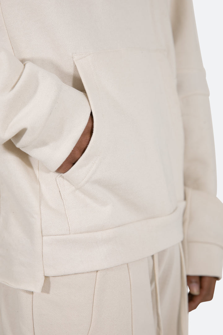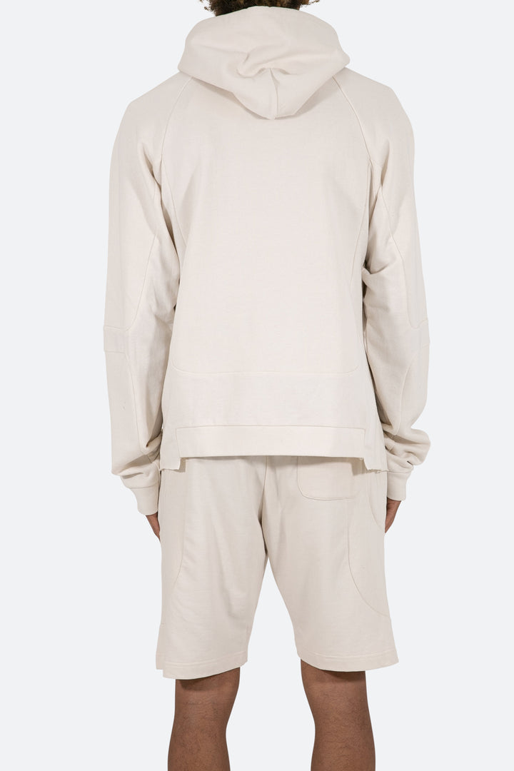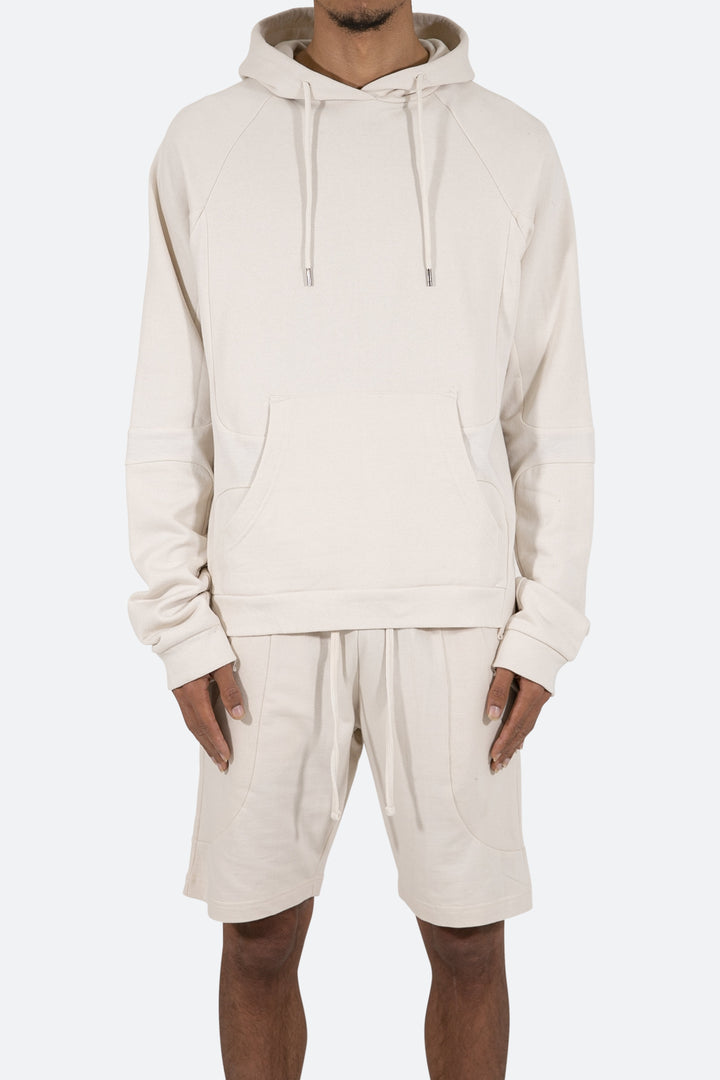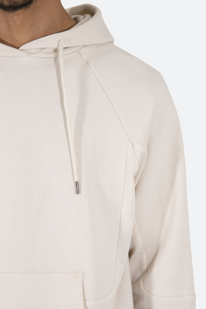 The Geo Paneled Hoodie features a relaxed fit with a raglan shoulder, front pouch pocket, ribbing at the wrists and waist, and finished in tonal paneling throughout.