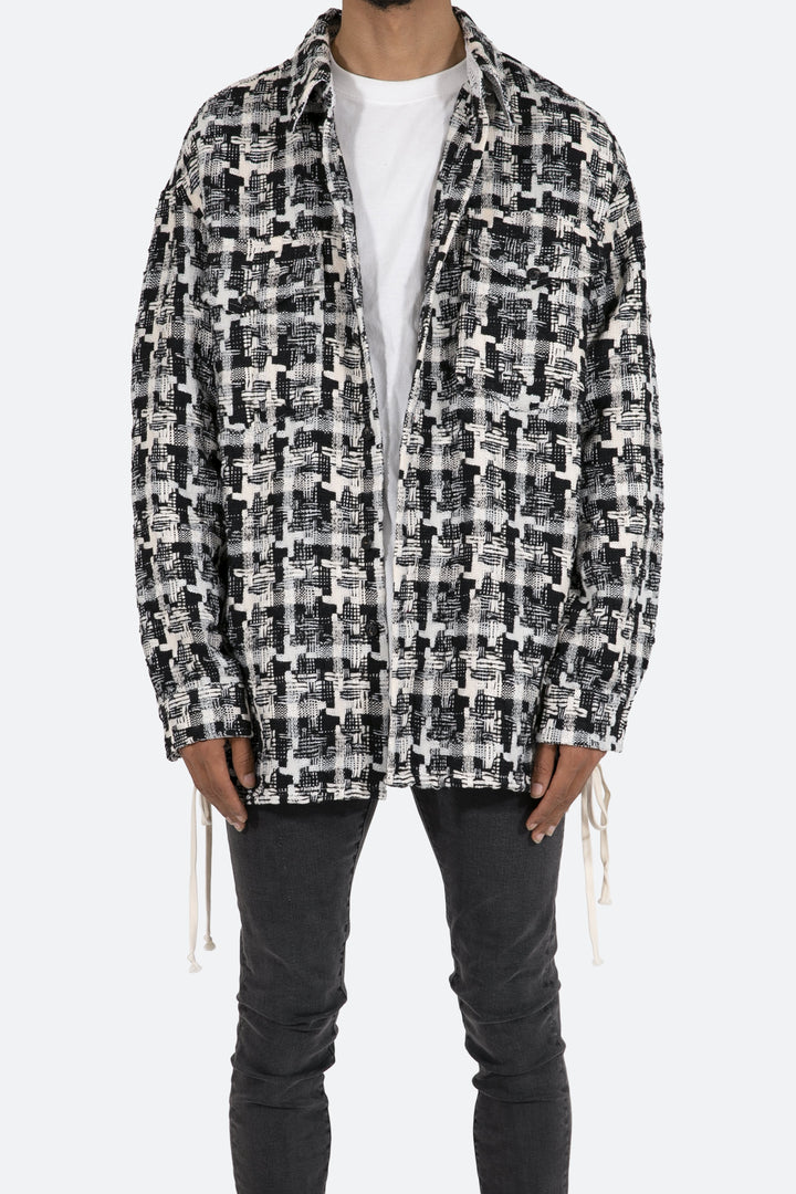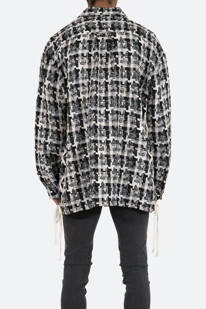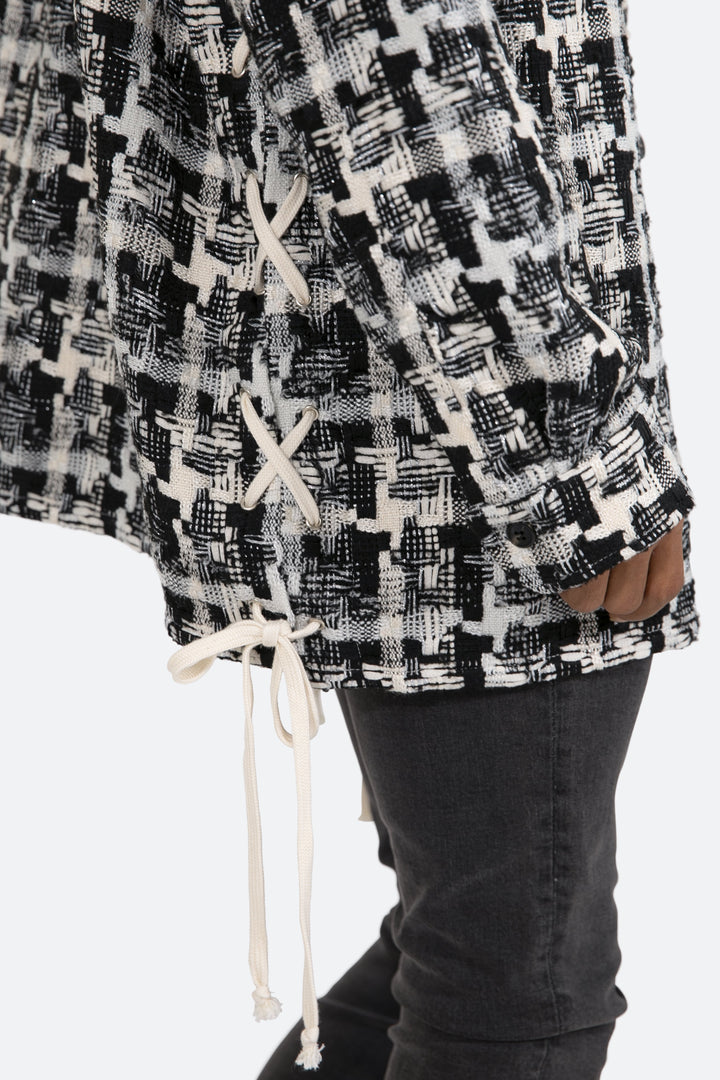the Laced Loose Woven Shirt is designed with an oversized fit, a raw hemline, pleats at the wrist with an adjustable button closure, lace details up the side seam, and finished in a loose weave custom polyester plaid fabric.