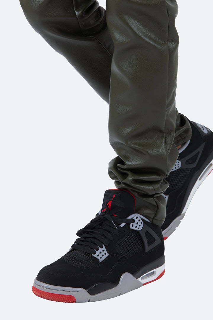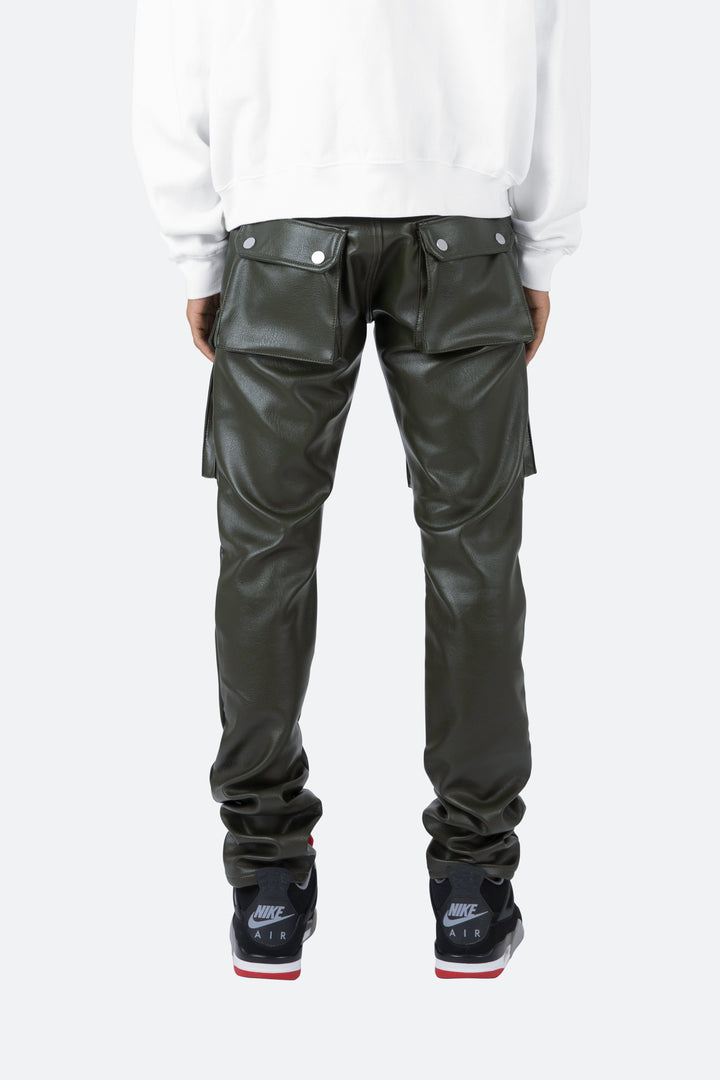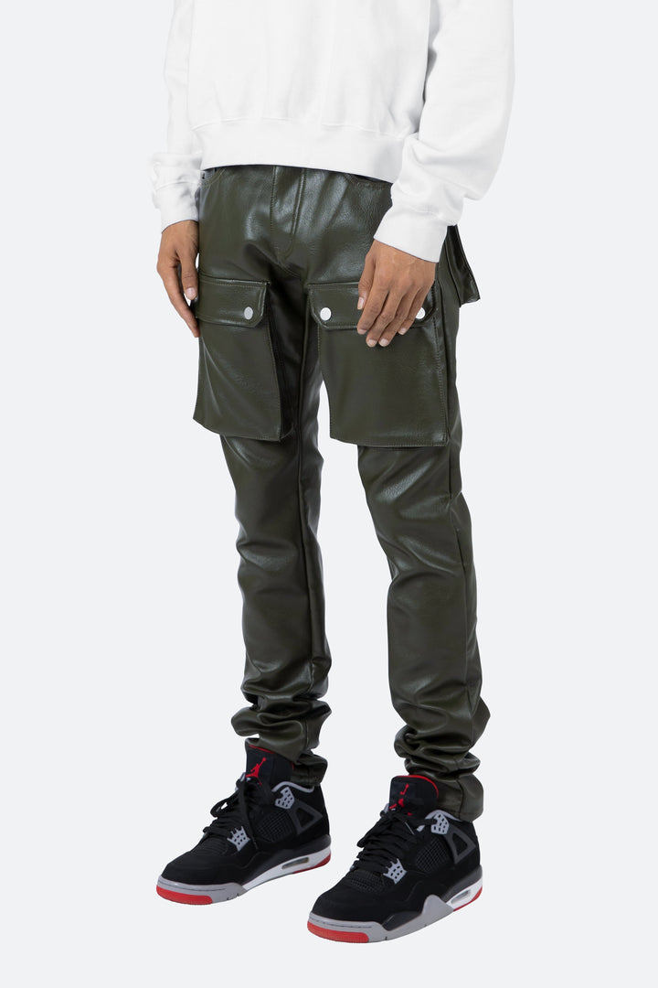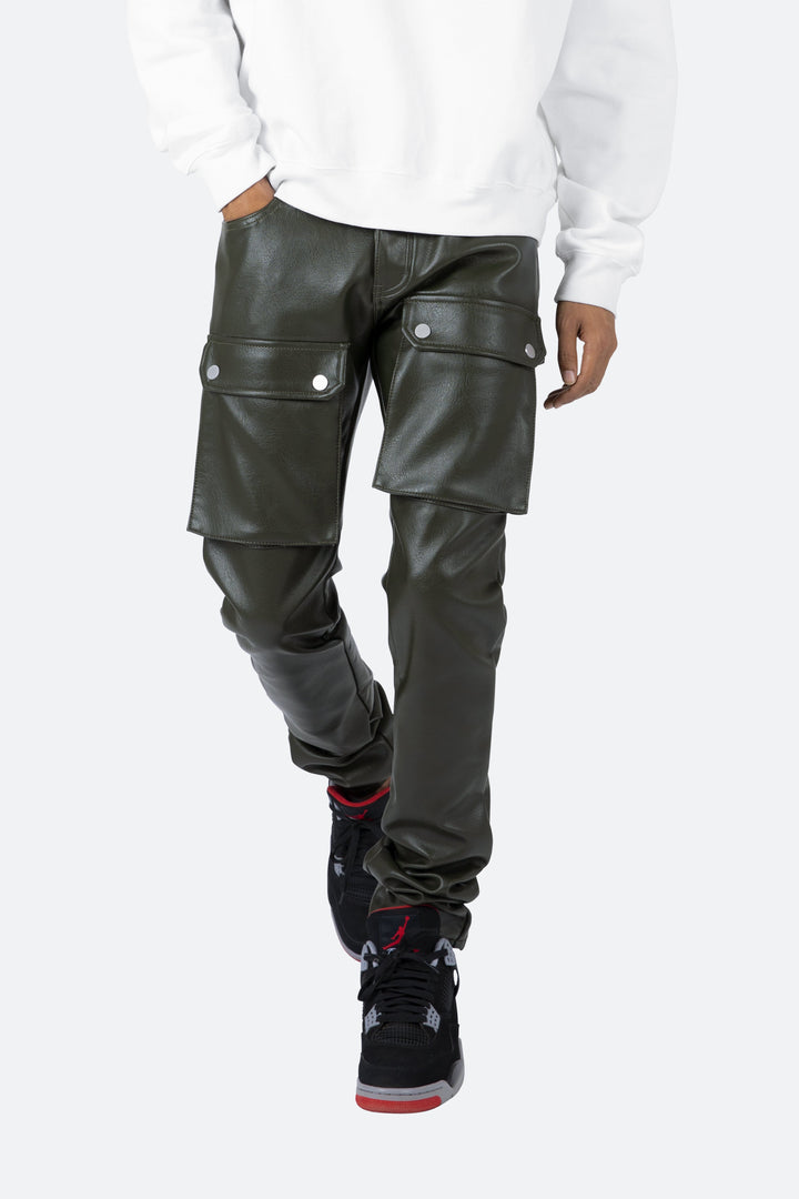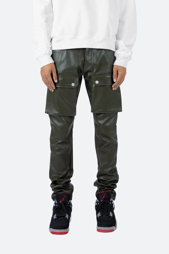 the Leather Snap Cargo Pants are designed with a fit that is relaxed throughout the leg, with cargo pockets located on the front thigh, and finishing off in our custom developed poly-leather fabric.