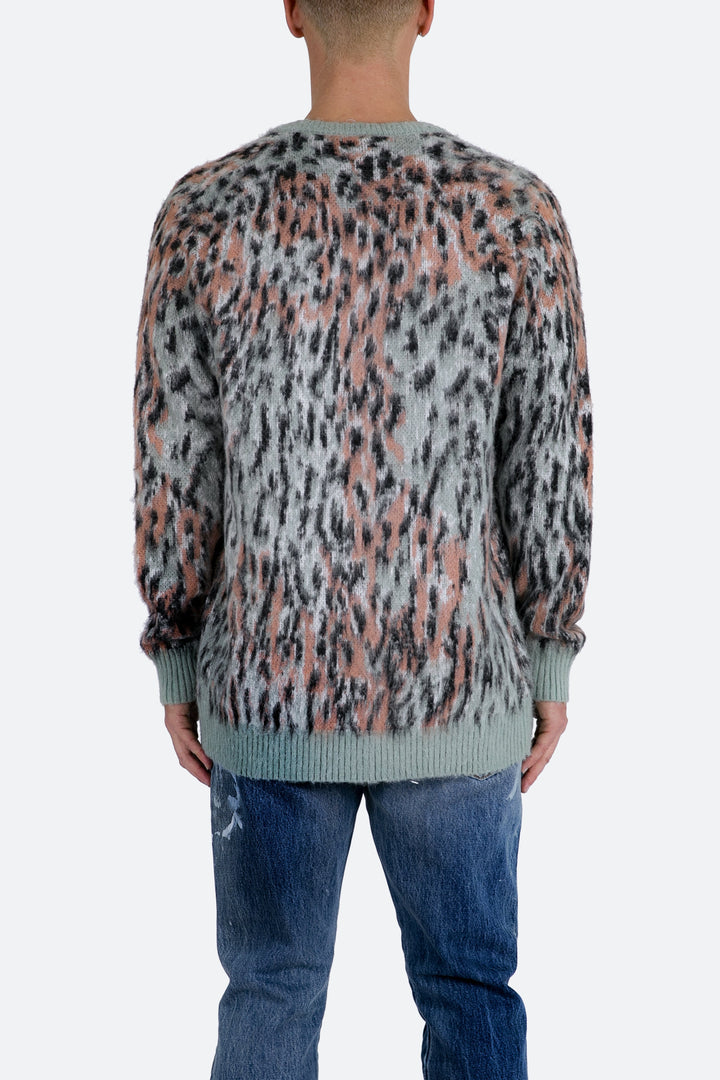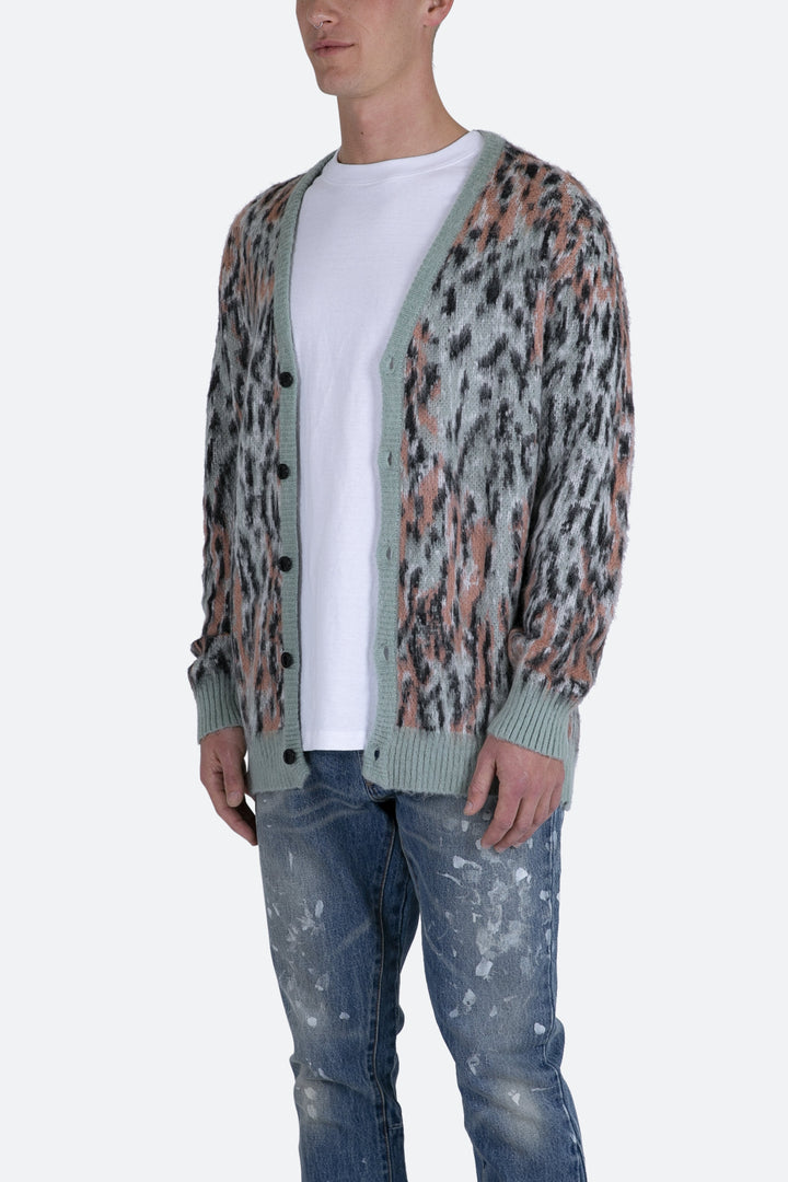 the Leopard Cardigan Sweater is a custom knit sweater that is constructed from acrylic and features a button placket, pockets on the front and is completed in a multi colored leopard pattern in a brushed fabric.