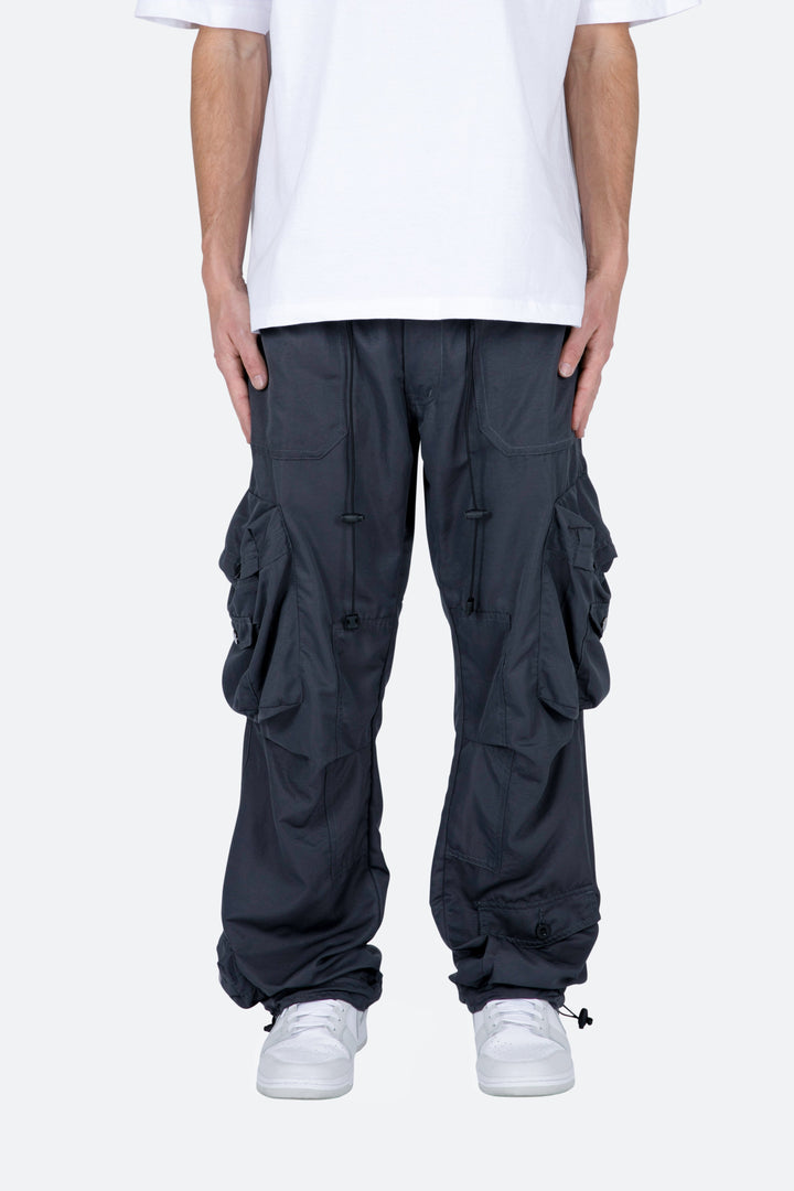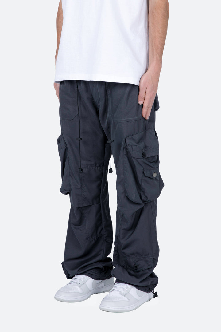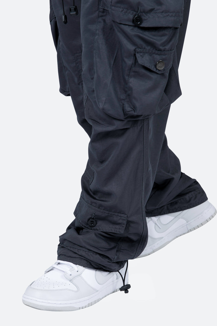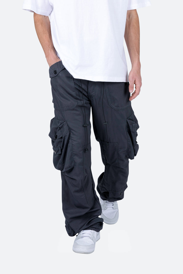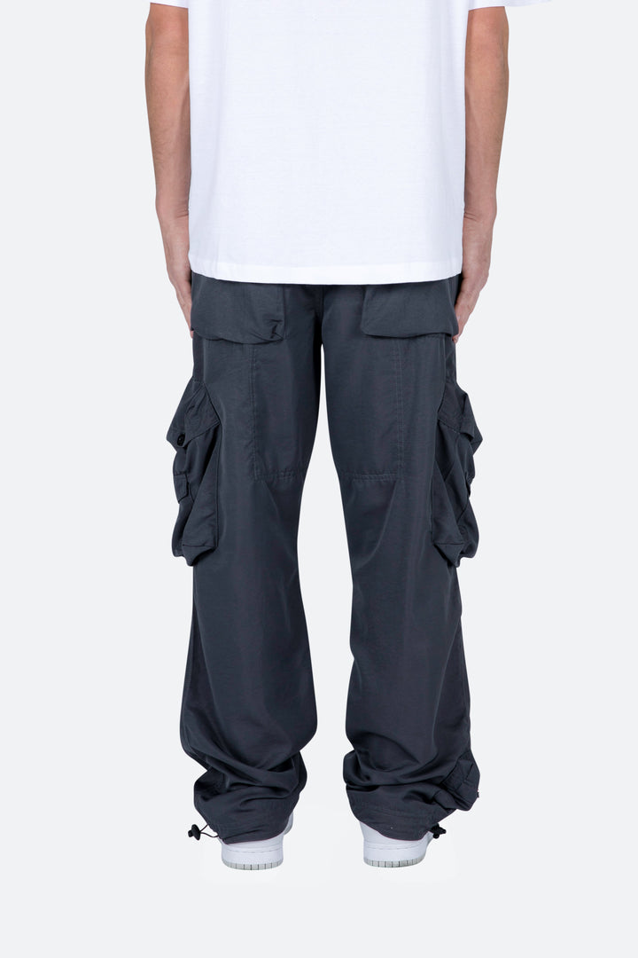 the Lightweight Cinch Cargo Pants are designed with a baggy, relaxed fit throughout, featuring an elastic waistband, extended elastic drawcord, large cargo pockets at the outseam, cinch closures at the leg opening, and constructed from a lightweight washed cotton twill.