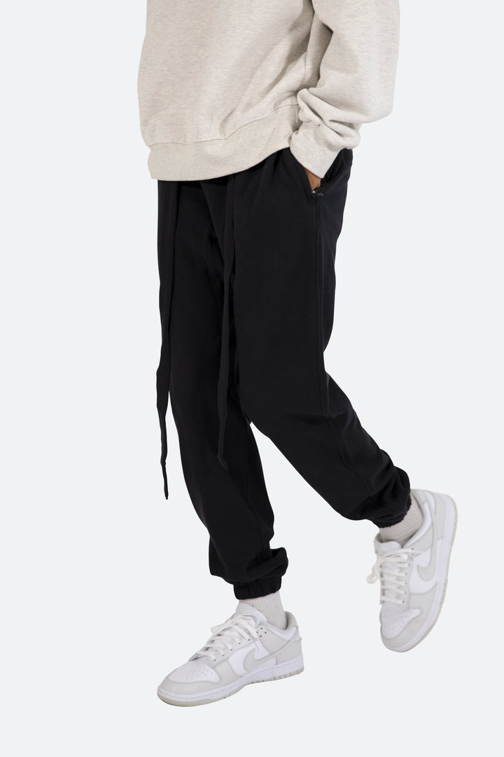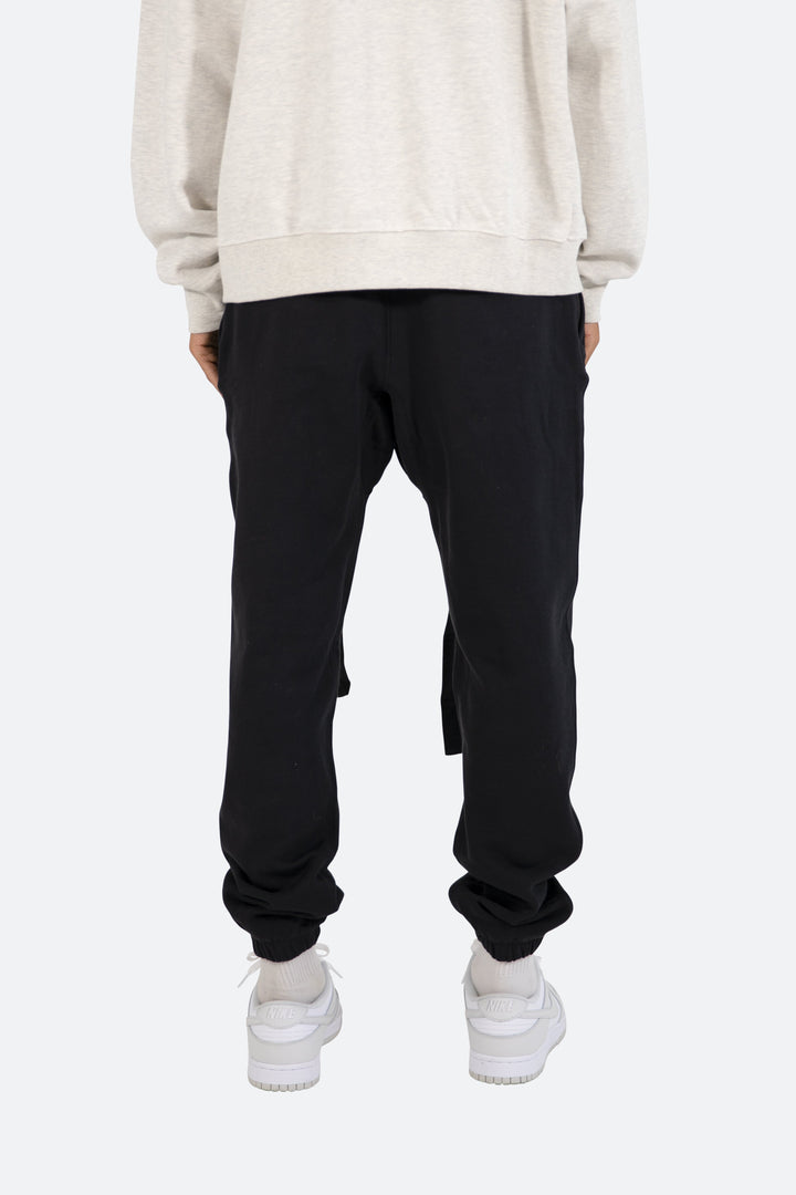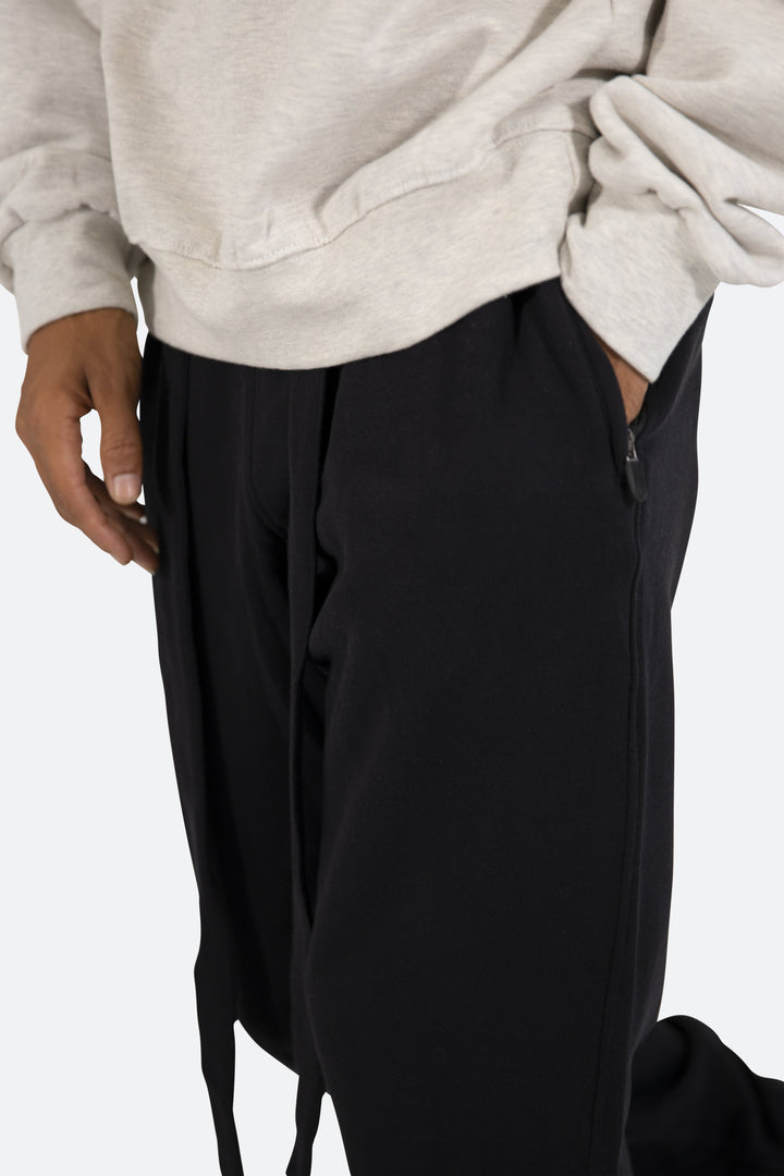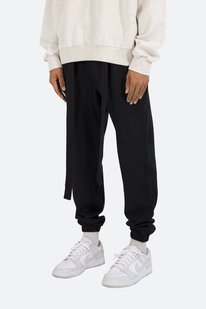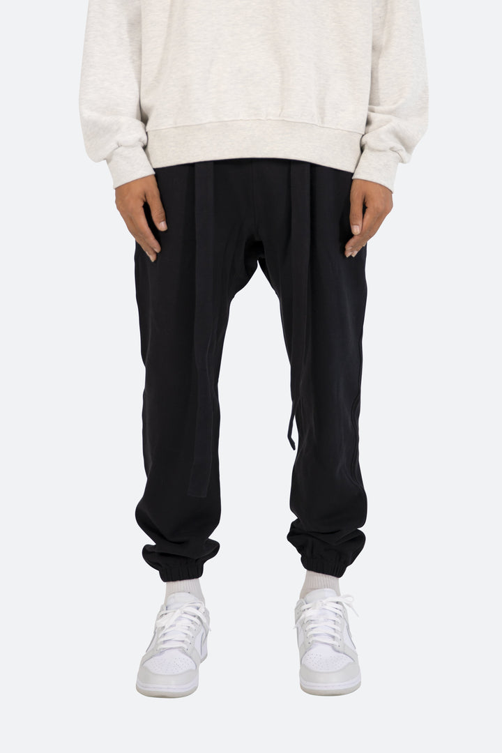 the Lounge Belt Sweatpants are designed with a relaxed fit throughout, featuring an elasticized self waist and leg opening, zipper pockets at the outseam, tonal nylon drawstring belt, and finished in both a washed and brushed fleece fabric.