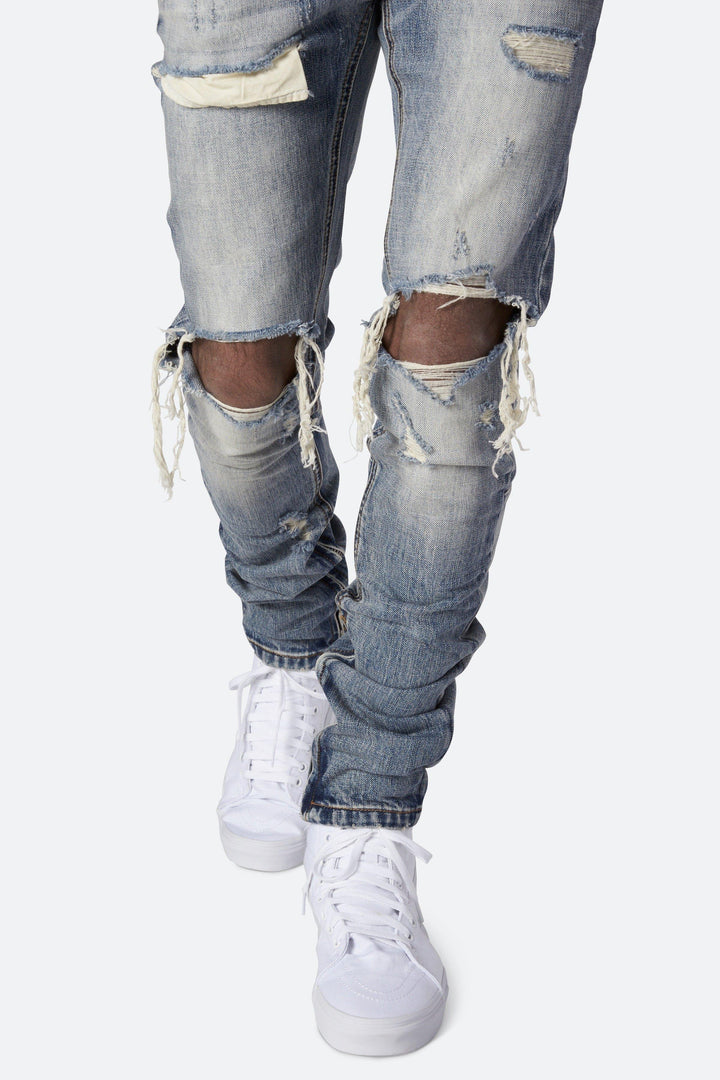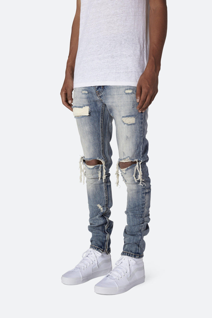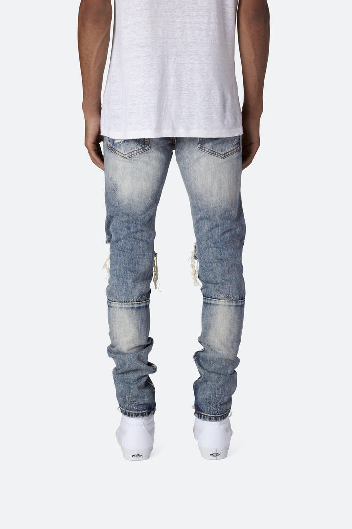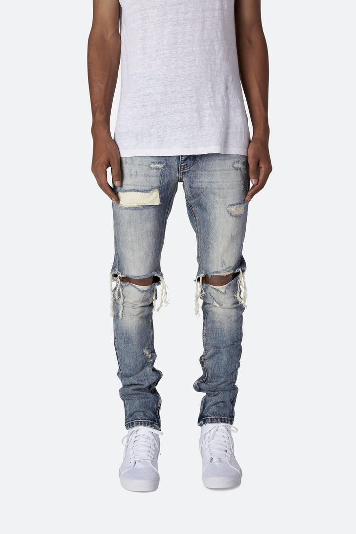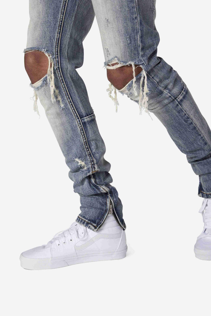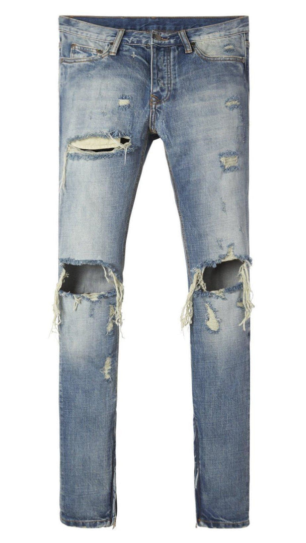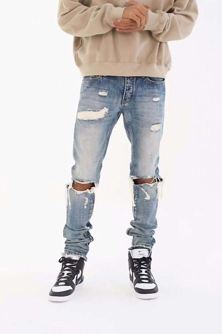 developed in los angeles, the original blue m1 denim is designed with a relaxed fit through the thigh that tapers from the knee to the ankle, featuring distress details at the knee and thigh, finishing off with a 10″ concealed zipper on the inseam for a carefully optimized fit.