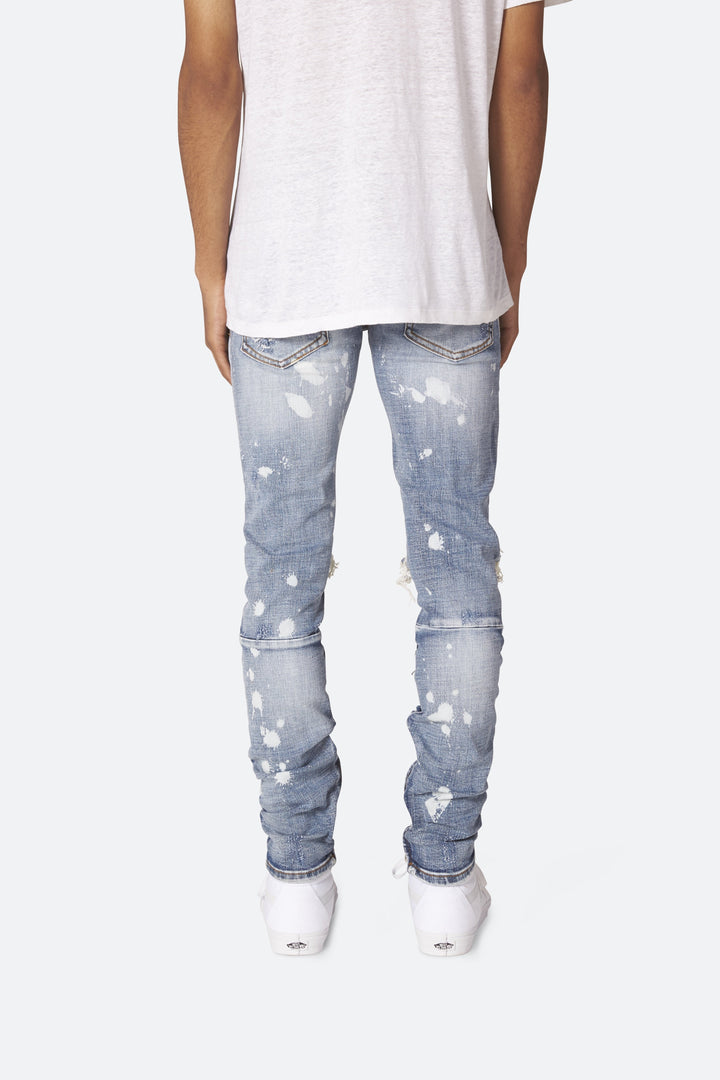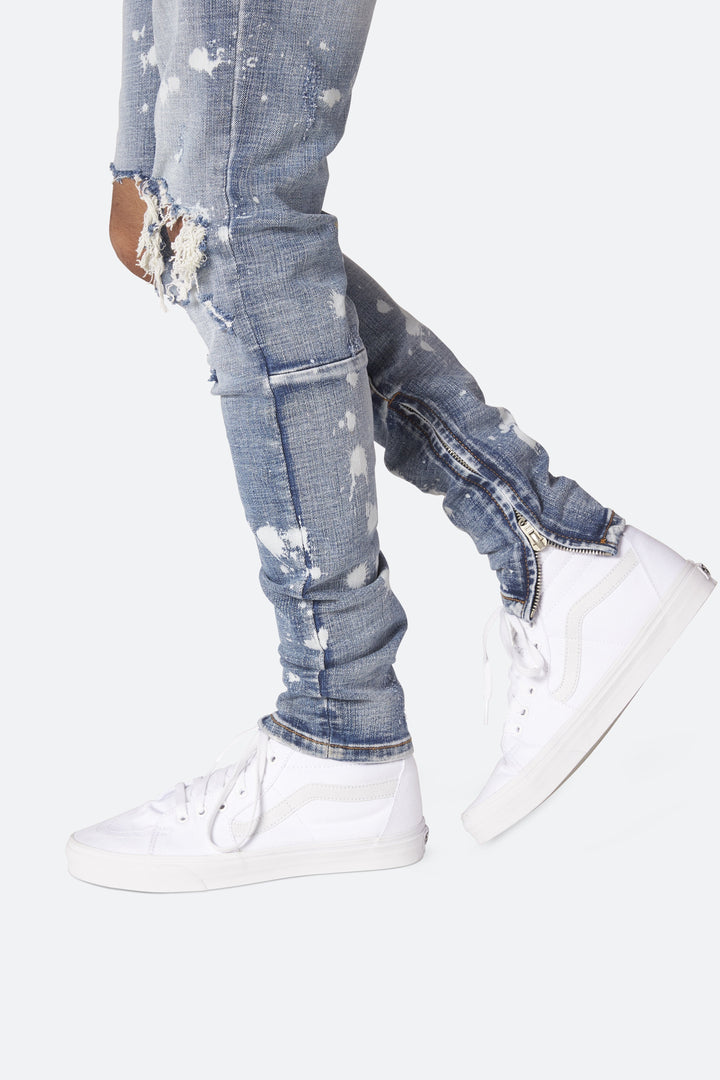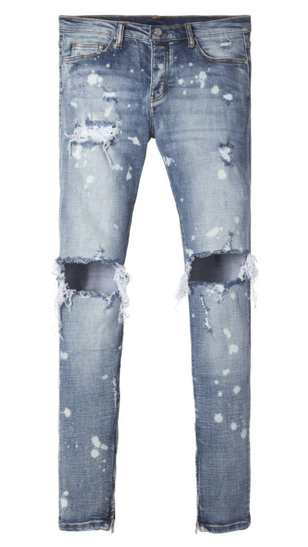 developed in los angeles, the splash m1 stretch denim is designed with a relaxed fit through the thigh that tapers from the knee to the ankle, featuring distress details at the knee and thigh, finishing off with a 10″ concealed zipper on the inseam for a carefully optimized fit.