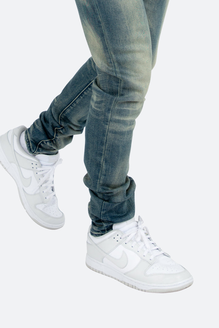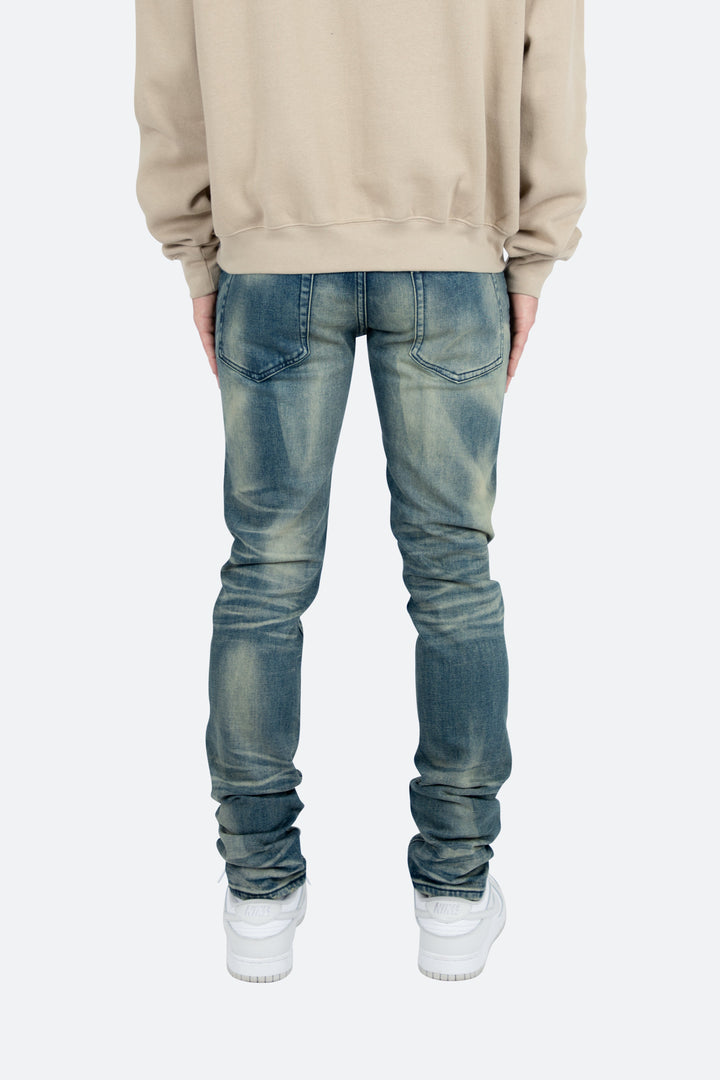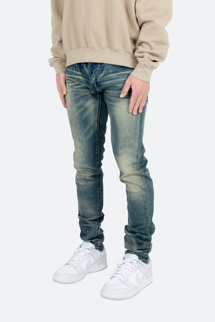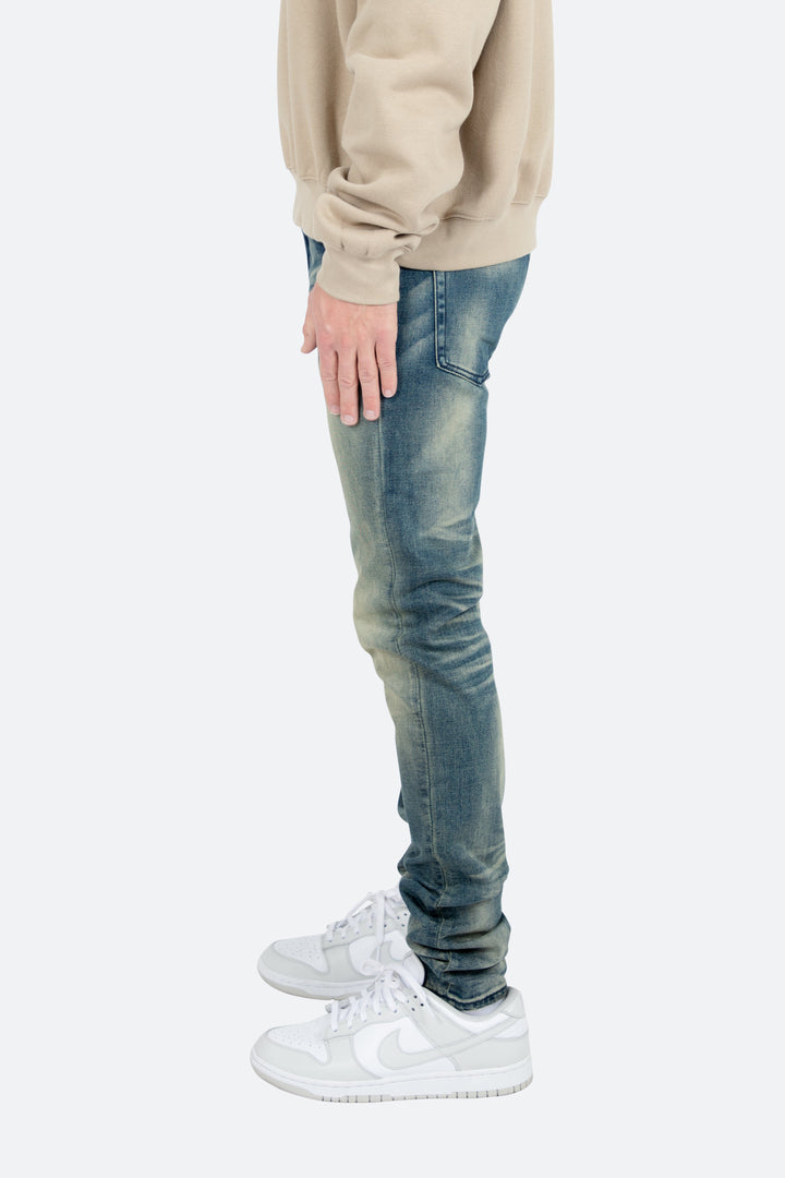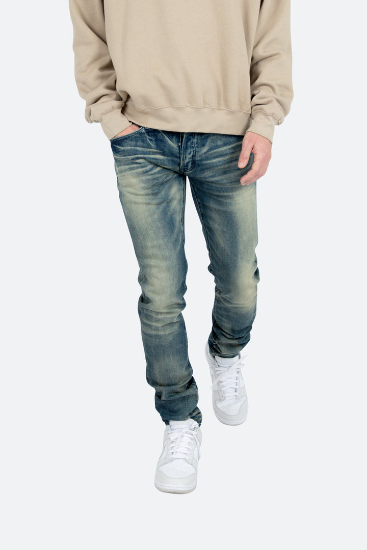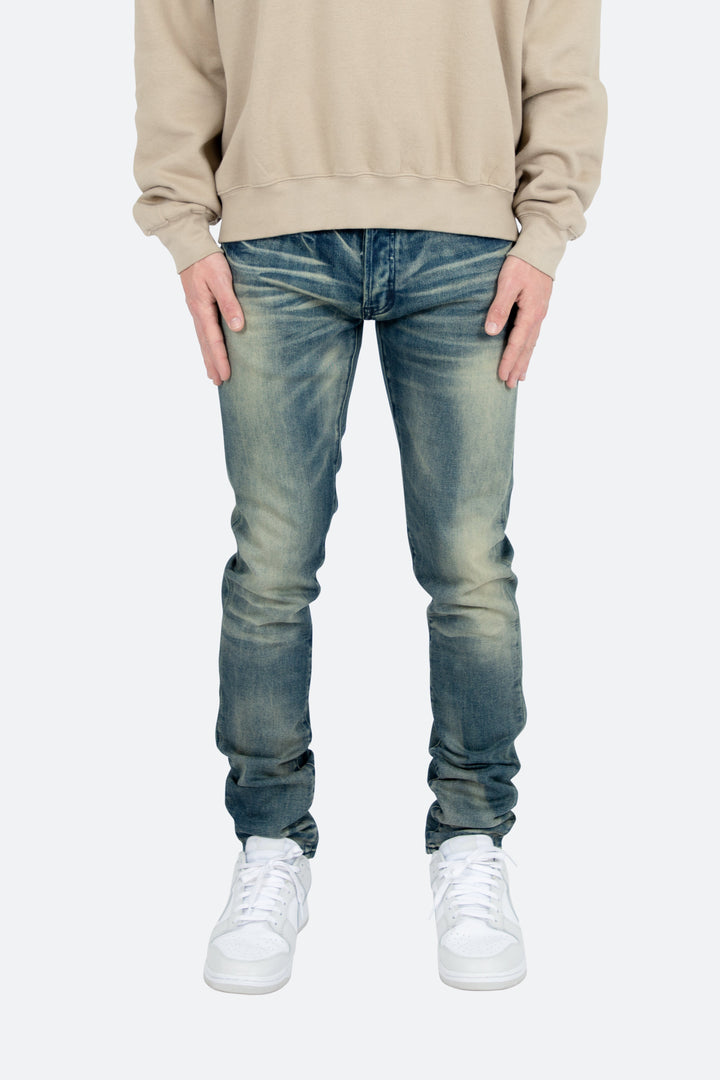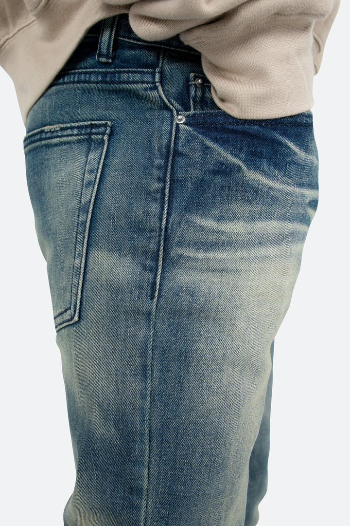 the M359 Stretch Denim is part of our new M300 line of zipperless M Denim. The M359 Stretch Denim features a relaxed fit through the thigh that tapers from the knee to the ankle, medium blue wash, and finished sanding and whiskering throughout.