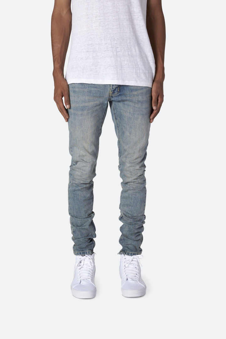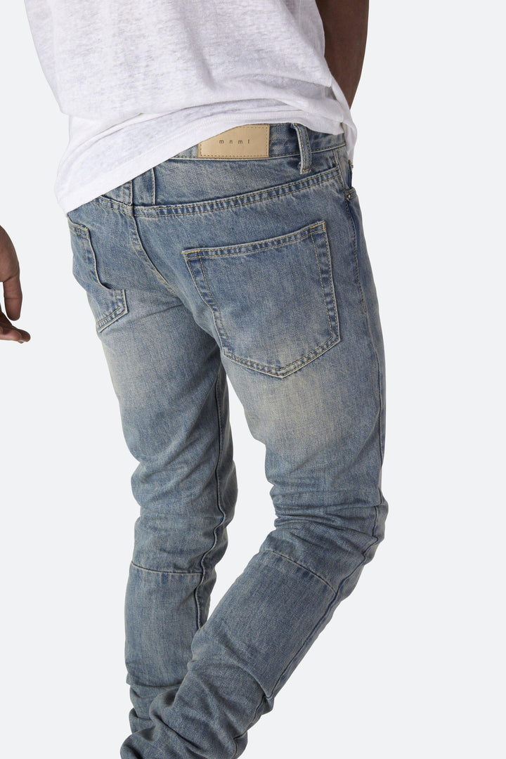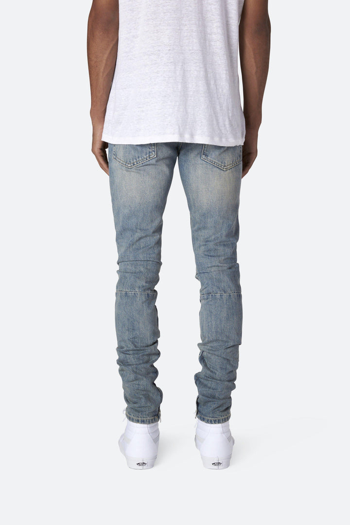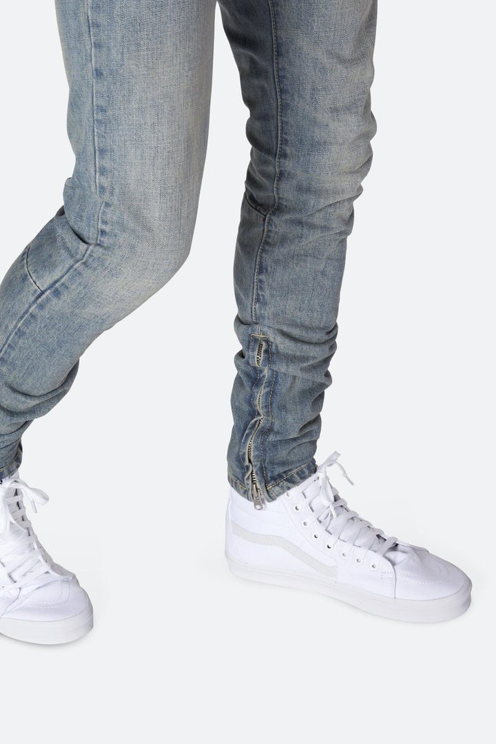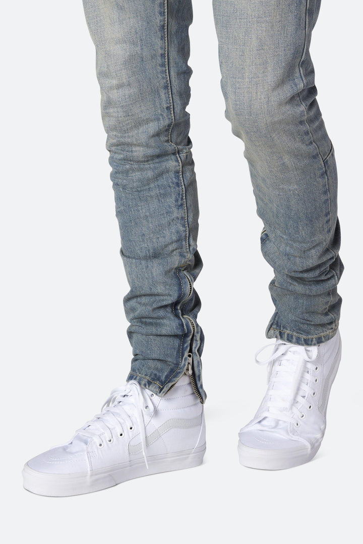 the blue m5 denim is designed with a relaxed fit through the thigh that tapers from the knee to the ankle, with a warm wash throughout, finishing off with a 10″ concealed zipper on the inseam and a rear calf panel for a carefully optimized fit.